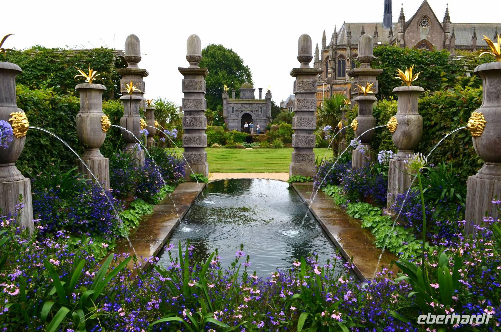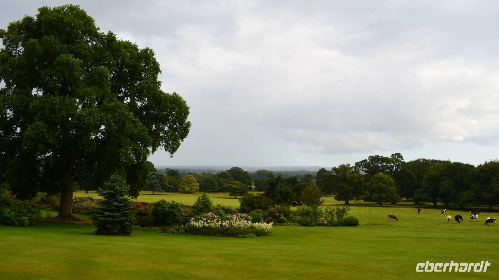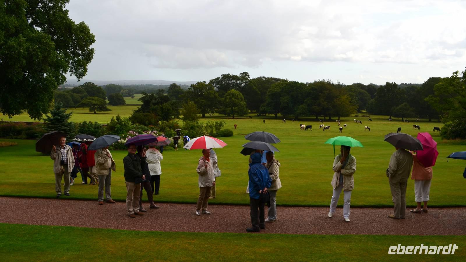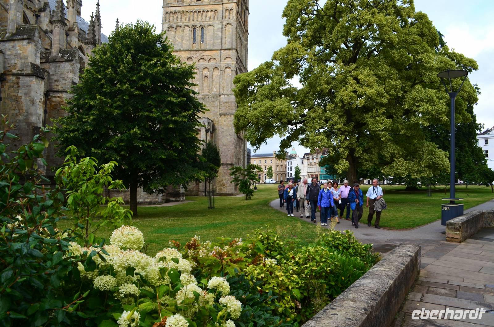 Von hier geht es weiter nach Salisbury, wir parken am Millstream Coach Park und unternehmen von hier einen gemeinsamen Fußweg ins Zentrum und zur Kathedrale. Der mit 123 m höchste Kirchturm Englands überragt eindrucksvoll die Dächer der Stadt. Wir bewundern die figurenreiche Westfassade, den Dom selbst, der harmonisch und wunderschön in seiner Frühgotik erstrahlt, und den Dombezirk mit seinen historischen Bauten. Nach etwas Freizeit in der Stadt geht es zu unserem nächsten Ziel weiter, dem Killerton House und Garten. Als wir ankommen, geht gerade ein heftiger Gewitterschauer nieder.