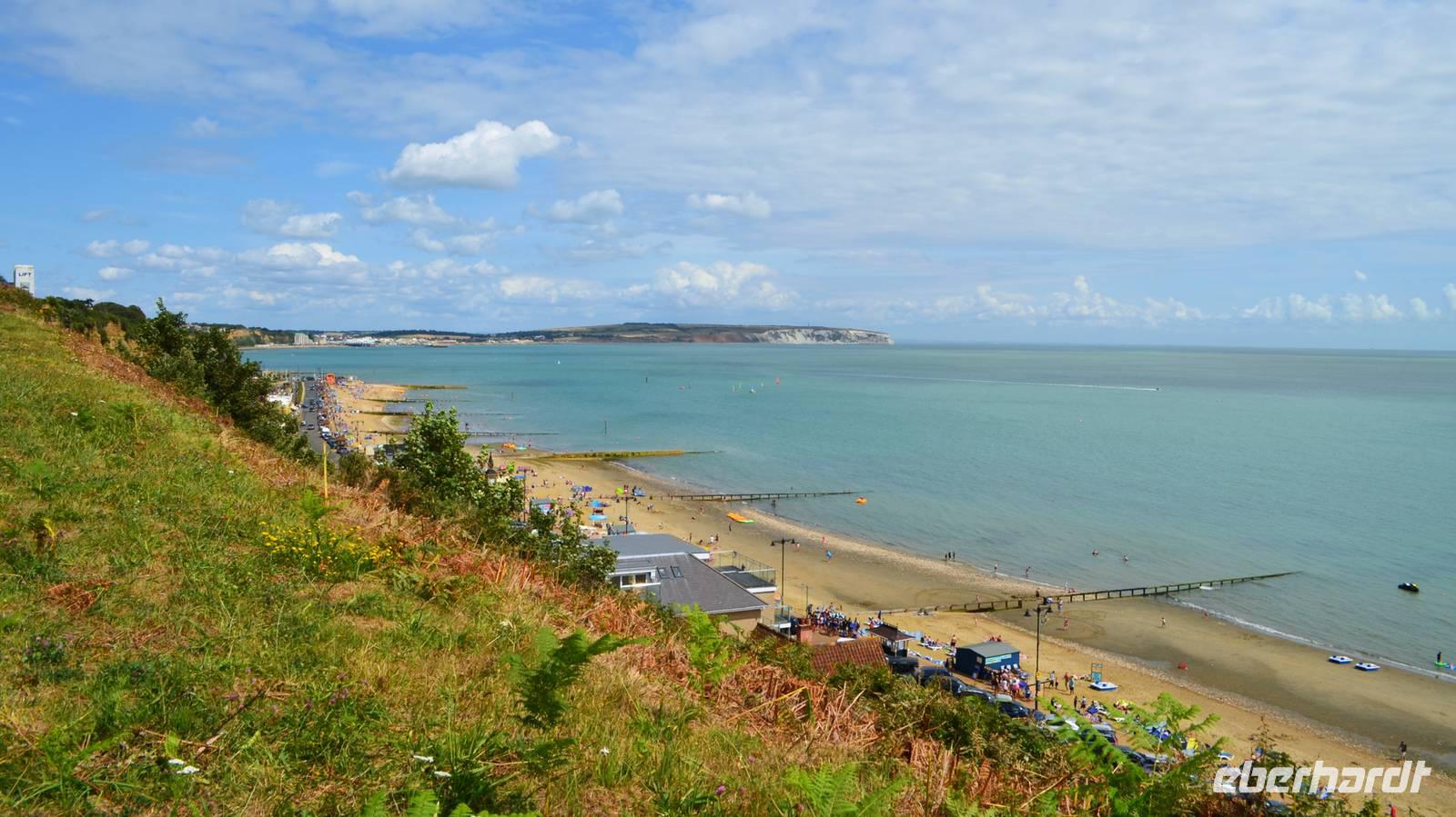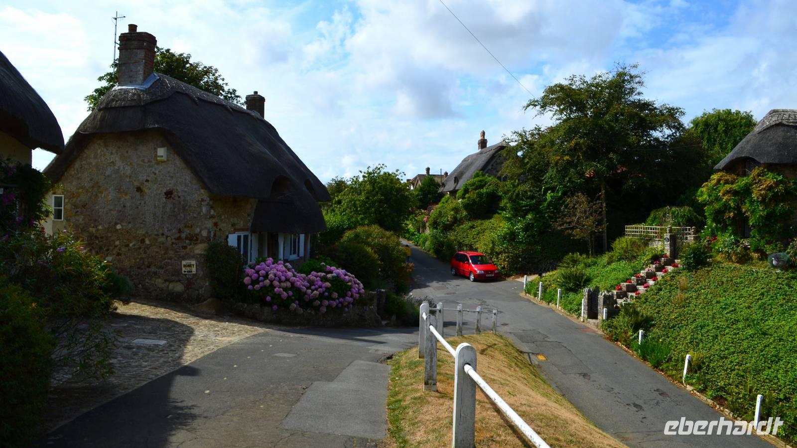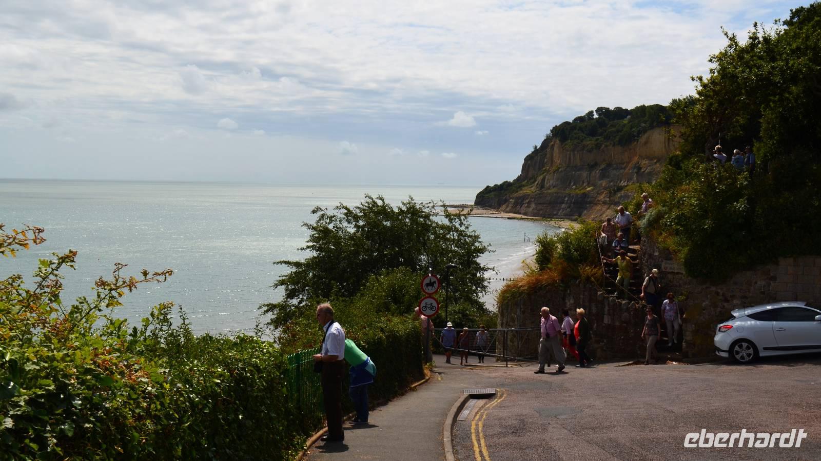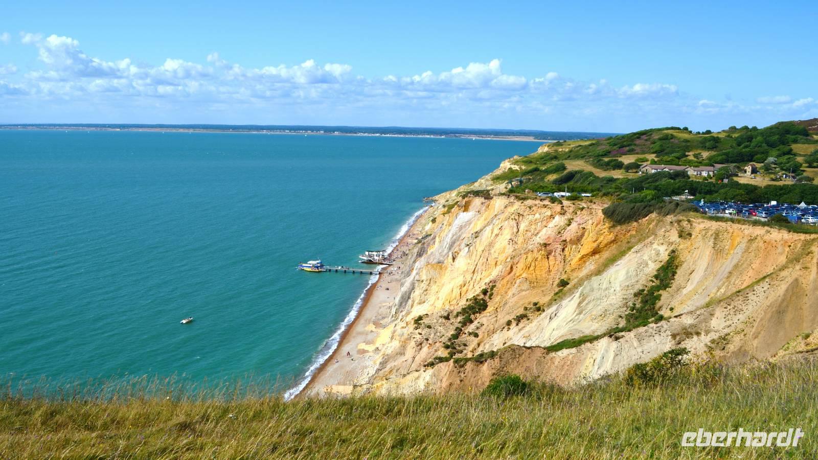 Bei der Besichtigung von Godshill erleben wir zuerst Austin-Oldtimer auf dem Parkplatz, dann machen wir einen gemeinsamen Spaziergang zur Kirche, wo glücklicherweise kurz eine Besichtigung möglich ist und bewundern danach die idyllischen mit Ried gedeckten Cottages. Die Weiterfahrt nach Shanklin erfolgt so, das wir dort zum Mittag ankommen. Hier können wir das Piratenversteck Shine Chine besichtigen oder einen Rundgang Richtung Beach, Promenade und der Old Village machen, bevor wir unsere Panoramatour entlang der Südküste fortsetzen. Am späten Mittag erreichen wir schließlich den Parkplatz neben der Black Chine, von deren Klippen wir einen wunderschönen Ausblick über die Freshwaterbay haben.