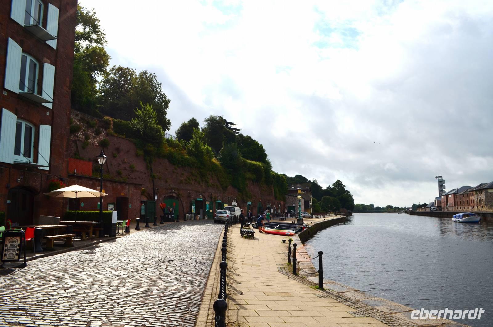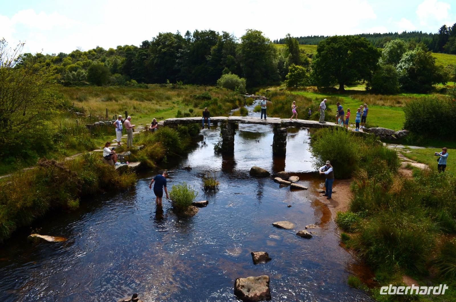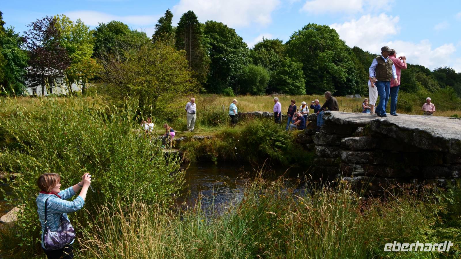 Die gemeinsame Besichtigung von Exeter ist unser erster Tagesabschnitt - wir laufen zur alten Stadtmauer, durch die Einkaufsarkaden zur Hauptstraße und zu den alten Häusern mit dem „Ships Inn", dem Dombezirk mit seinen historischen Bauten und der Cathedral mit ihrer tollen Westfassade, zum alten Rathaus und hinunter zum Hafen. Als kleine Überraschung wollen wir einen Abstecher an die englische Riviera unternehmen und steuern Dawlish an. Aber die roten Sandsteincliffs sehen wir nur hinter einem Regenschleier. Also fahren wir ins sonnige Dartmoor, machen die Einfahrt von Südosten her mit Fotostopp auf den Hügeln hinter Moretonhamstead. Nächster Fotostopp ist an der Postbridge und der daneben befindlichen Clapperbridge. Nach dem Mittag probieren wir heute den für Südengland typischen Old-Navi-Rum und trinken auf die alten englischen Seefahrer.