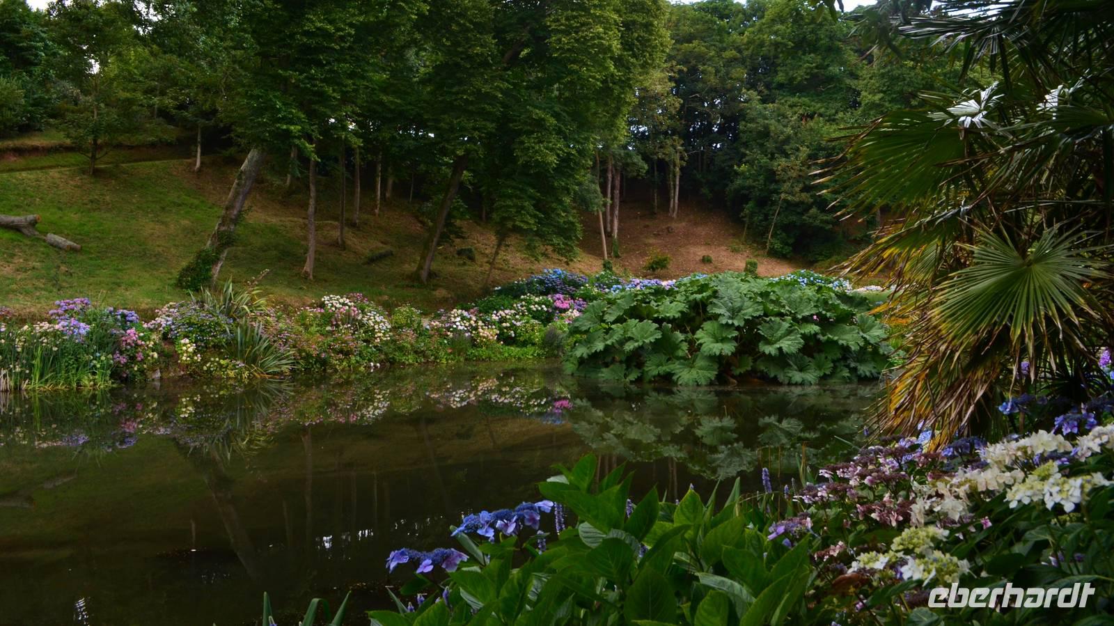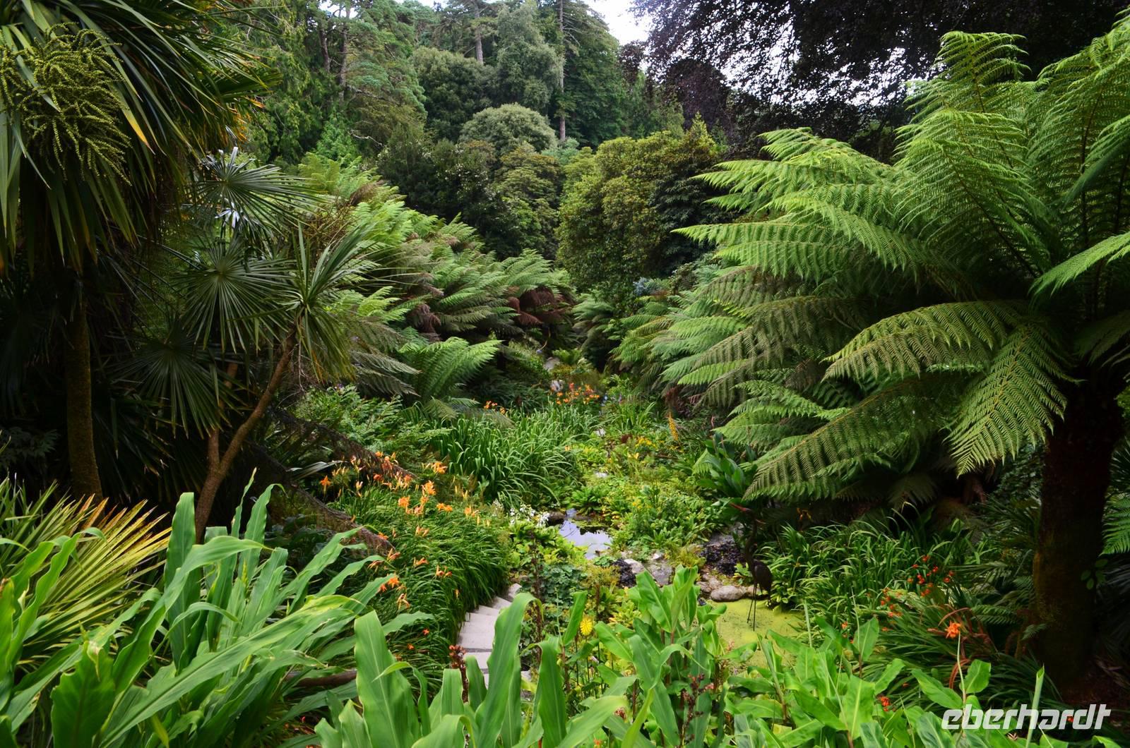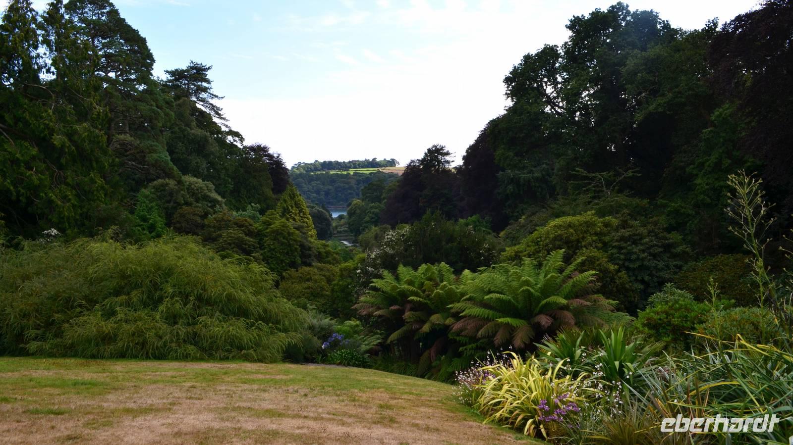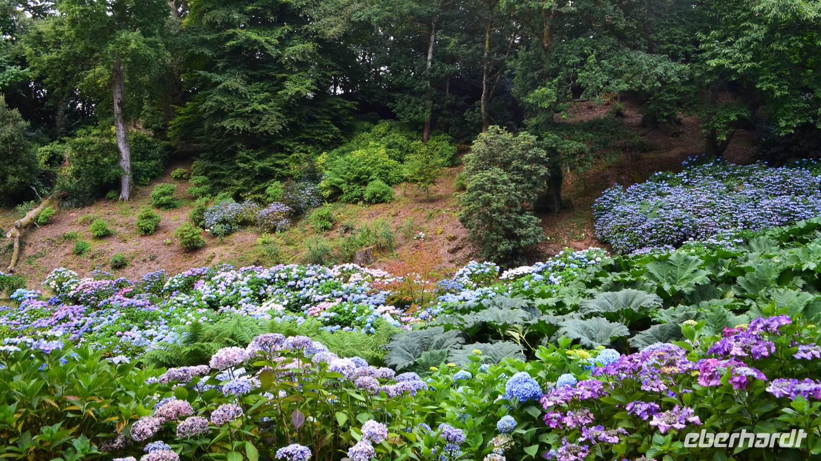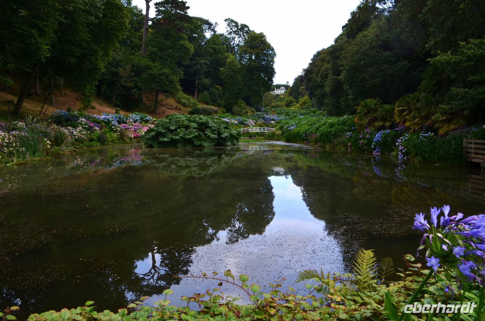 Da nach Auskunft unserer Gäste die Interessen stark bei Gärten liegen, besuchen wir am Nachmittag noch einen schönen Garten in Cornwall, den Trebah Garden, dessen Anlage wir am Nachmittag durchstreifen. Das kleine Tal, in dem er sich bis zur Küster erstreckt, begeistert zu dieser Jahreszeit durch seine kleinen Urwälder, den Riesenrhabarber und die blühenden Hortensien.