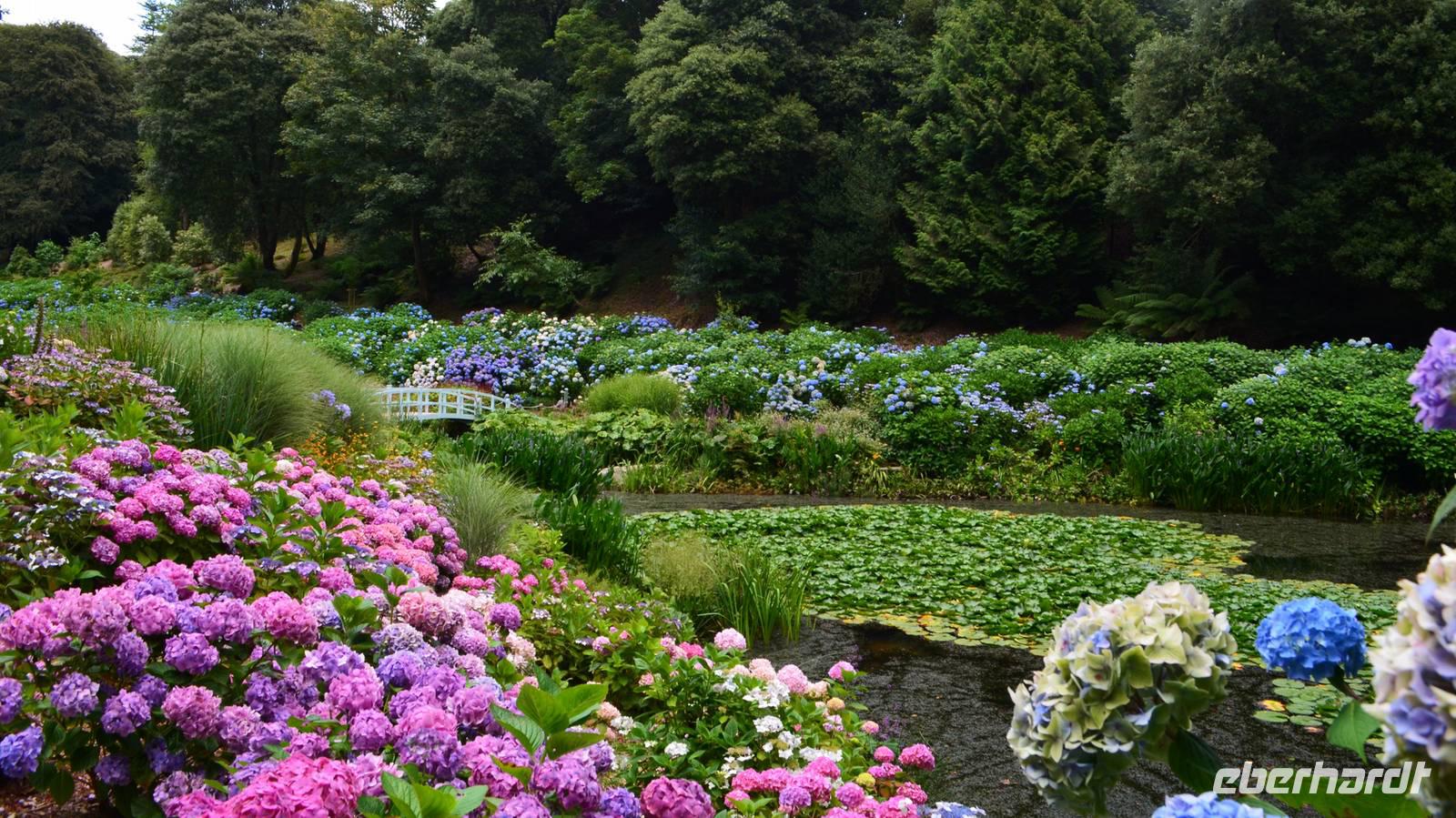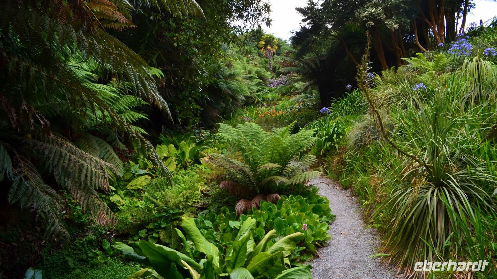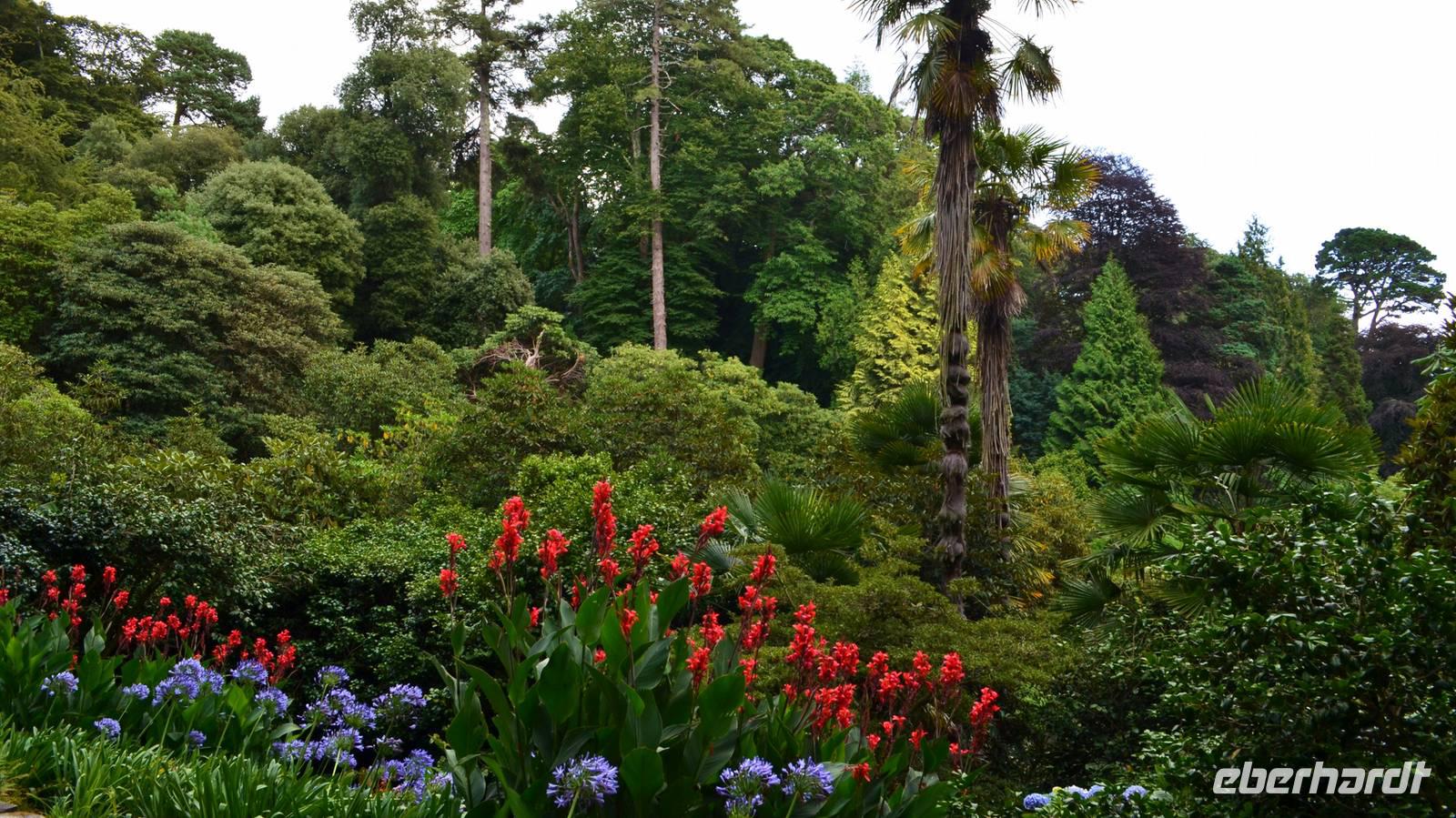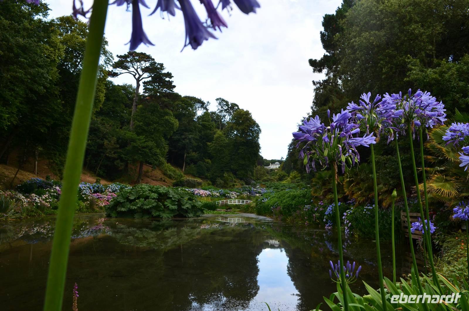 Da nach Auskunft unserer Gäste die Interessen stark bei Gärten liegen, besuchen wir am Nachmittag noch einen schönen Garten in Cornwall, den Trebah Garden, dessen Anlage wir am Nachmittag durchstreifen. Das kleine Tal, in dem er sich bis zur Küster erstreckt, begeistert zu dieser Jahreszeit durch seine kleinen Urwälder, den Riesenrhabarber und die blühenden Hortensien.