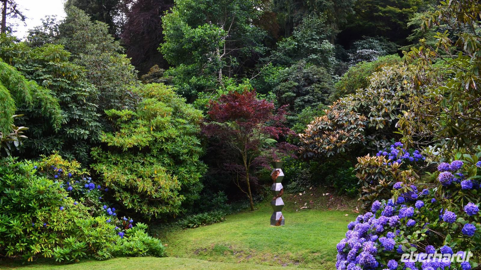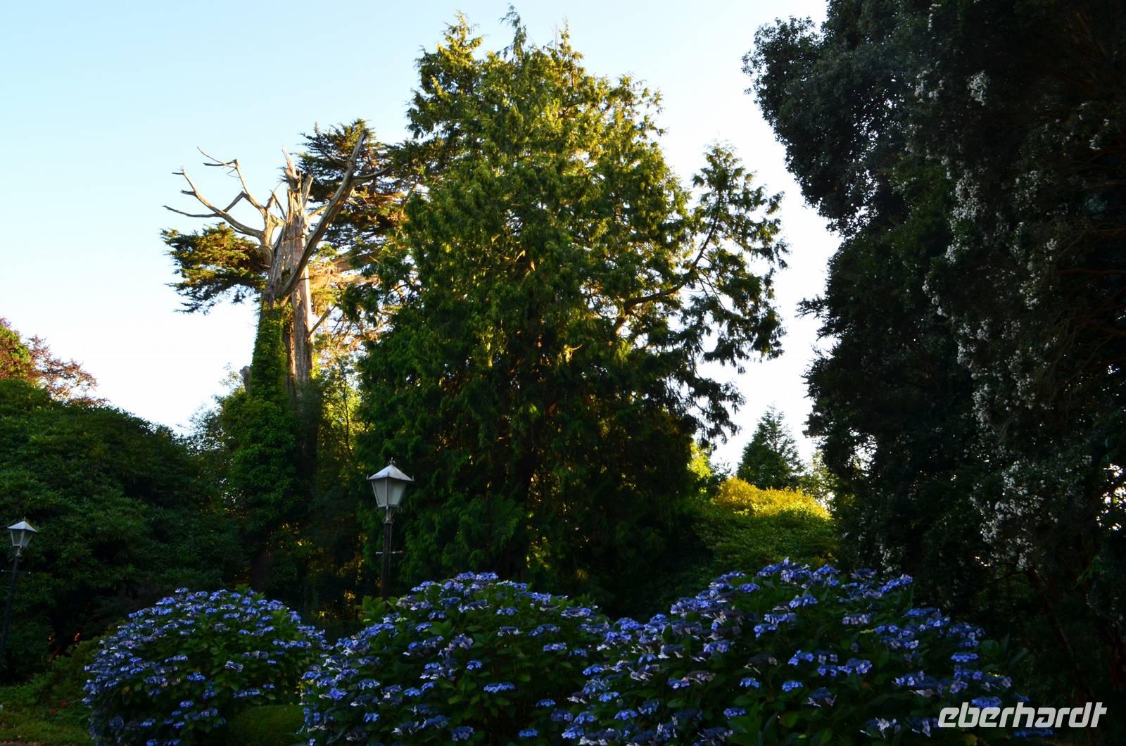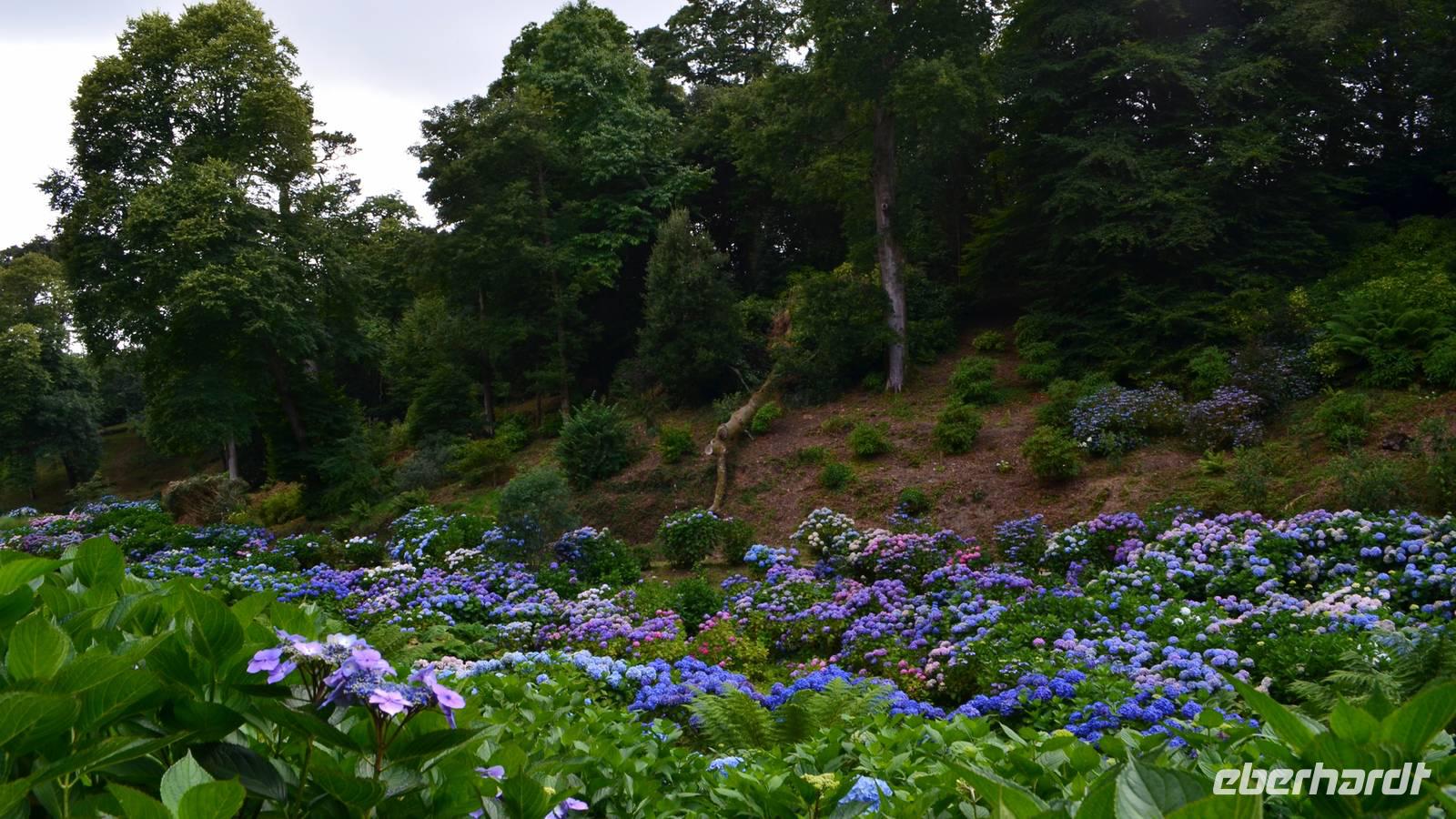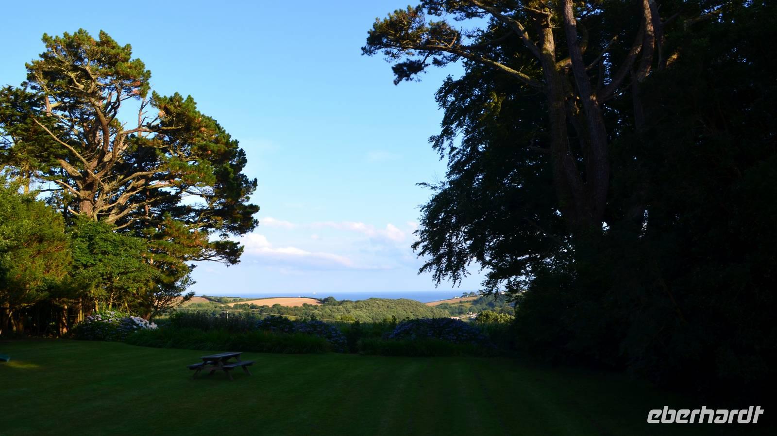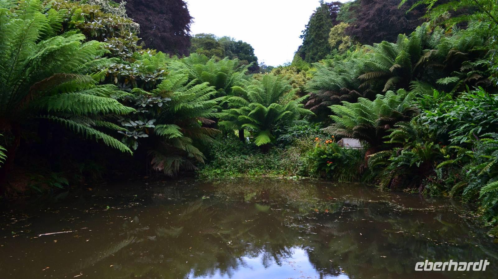 Da nach Auskunft unserer Gäste die Interessen stark bei Gärten liegen, besuchen wir am Nachmittag noch einen schönen Garten in Cornwall, den Trebah Garden, dessen Anlage wir am Nachmittag durchstreifen. Das kleine Tal, in dem er sich bis zur Küster erstreckt, begeistert zu dieser Jahreszeit durch seine kleinen Urwälder, den Riesenrhabarber und die blühenden Hortensien.
