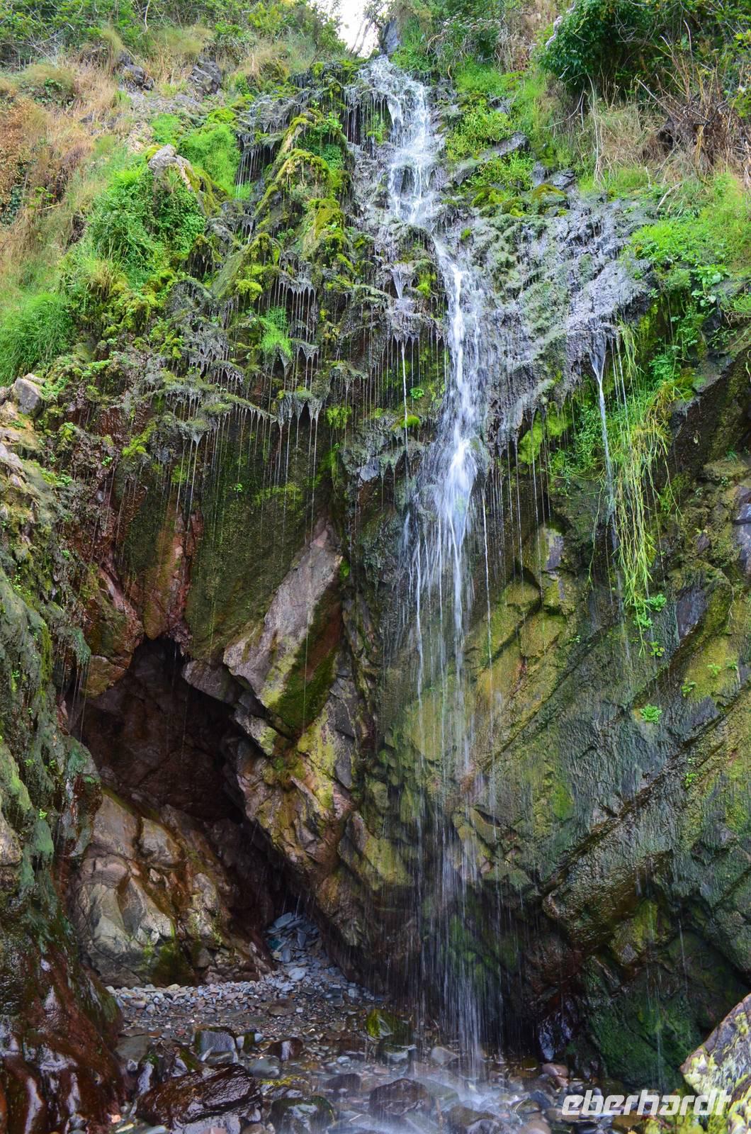 Fast alle wandern am steinigen Strand bis zum kleinen Wasserfall.