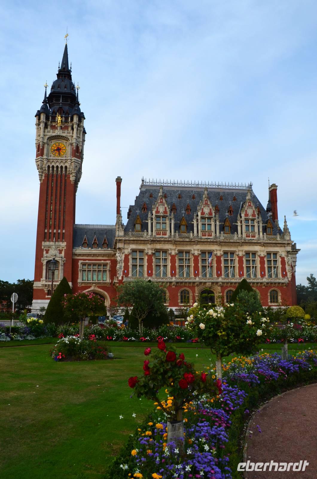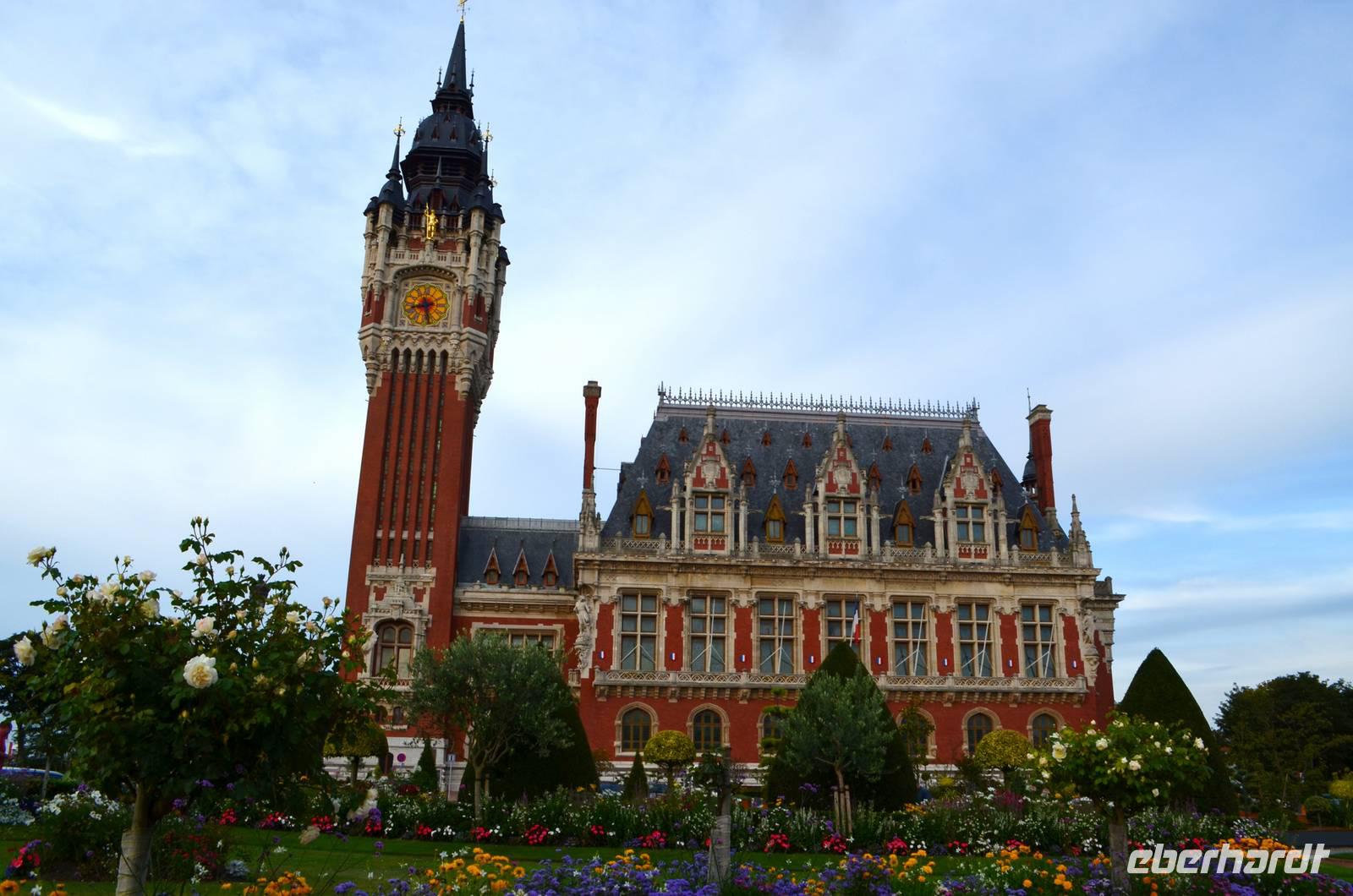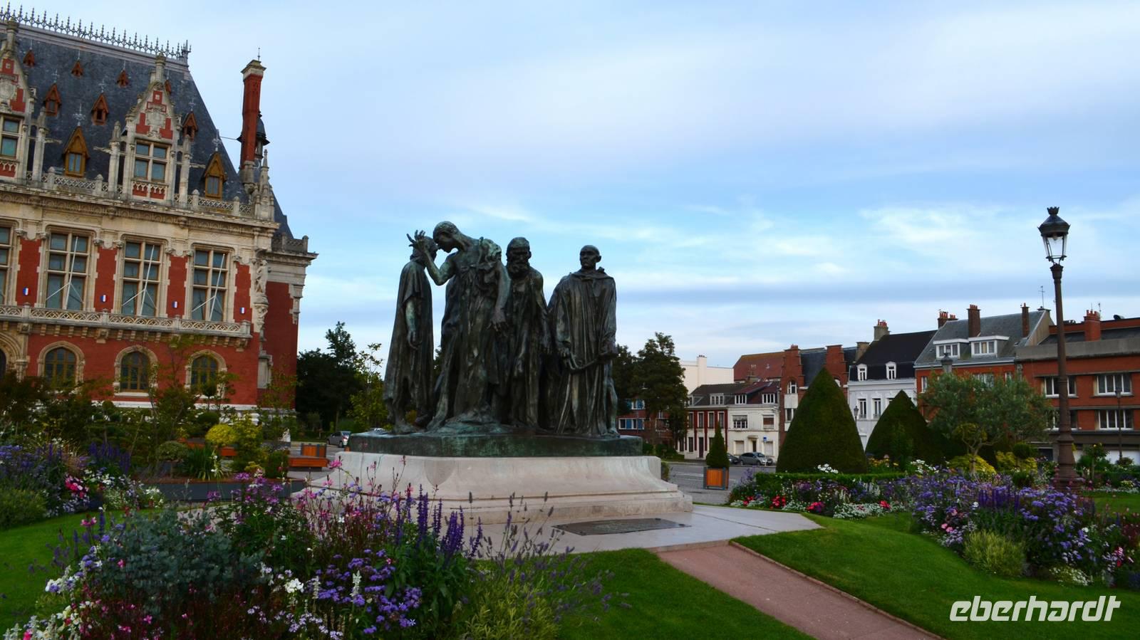 Bevor uns unser Hotel in Calais wieder aufnimmt, unternehmen wir noch einen Fotostopp vor dem schönen Rathaus der Stadt, das in seiner flämischen Renaissance in der Abendsonne erstrahlt. Es verfügt über einen 75 m hohen Belfried, der zum Weltkulturerbe der UNESCO gehört und davor steht der älteste Bronzeguss von Auguste Rodin´s Denkmal „Die Bürger von Calais" (1895). Die Blumenrabatten sind eine echte Augenweide.