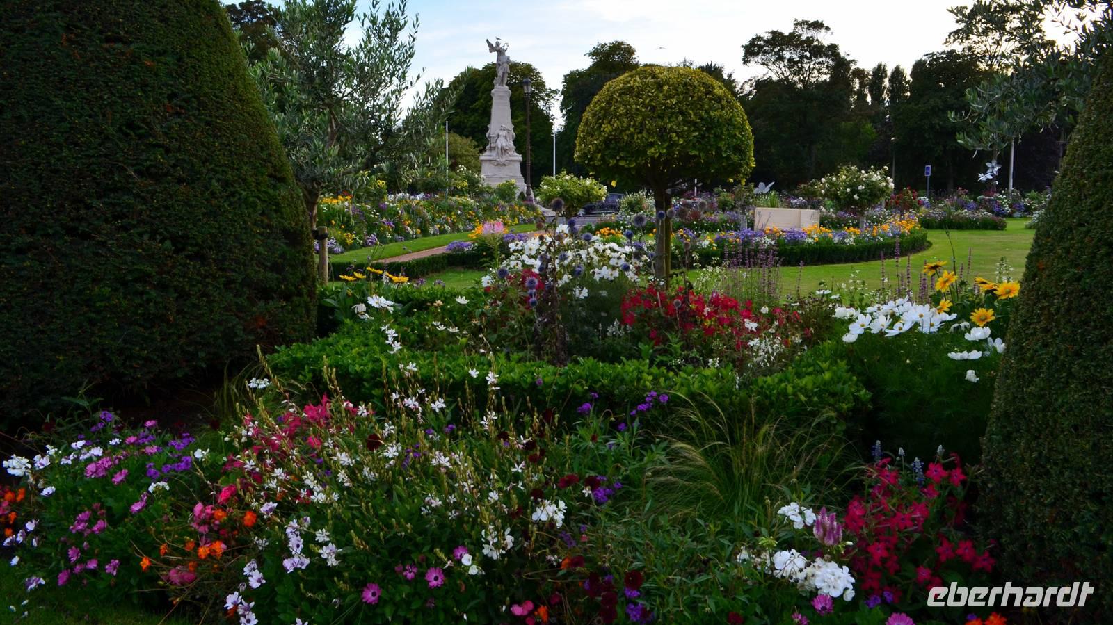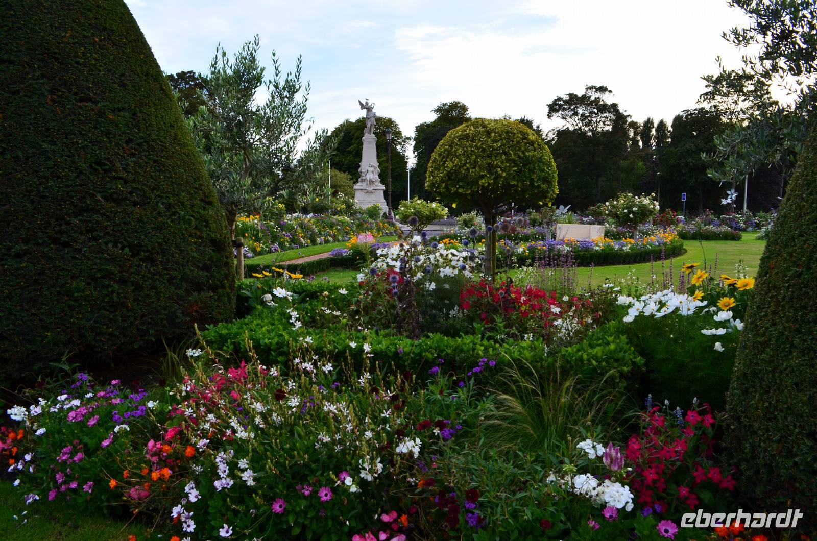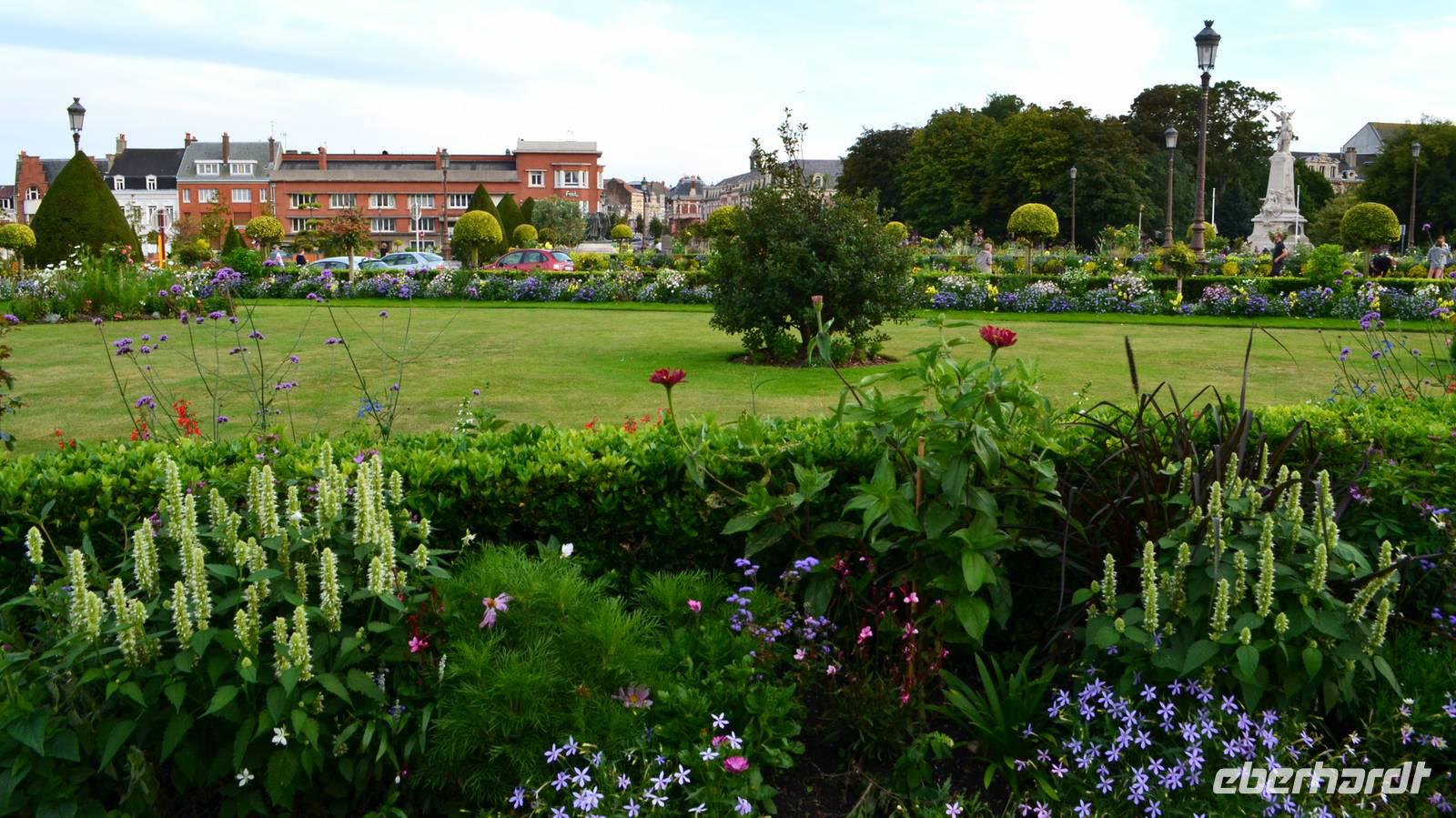 Bevor uns unser Hotel in Calais wieder aufnimmt, unternehmen wir noch einen Fotostopp vor dem schönen Rathaus der Stadt, das in seiner flämischen Renaissance in der Abendsonne erstrahlt. Es verfügt über einen 75 m hohen Belfried, der zum Weltkulturerbe der UNESCO gehört und davor steht der älteste Bronzeguss von Auguste Rodin´s Denkmal „Die Bürger von Calais" (1895). Die Blumenrabatten sind eine echte Augenweide.