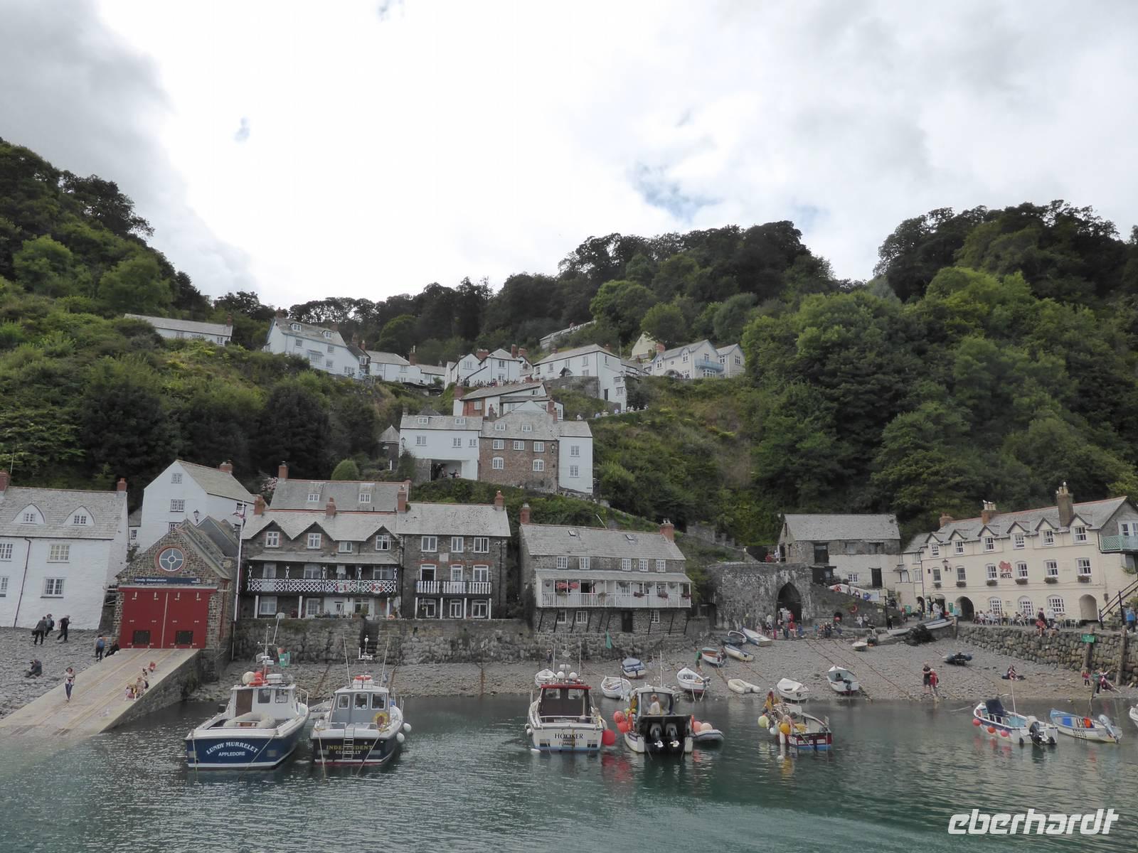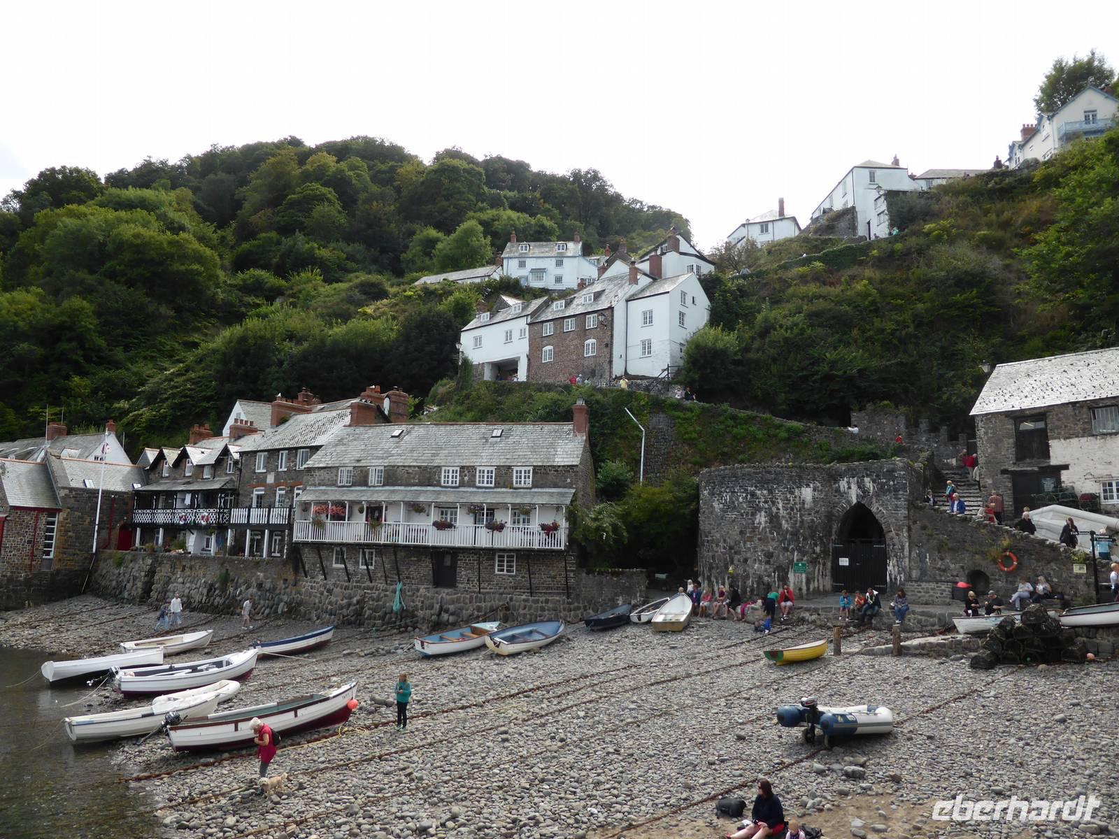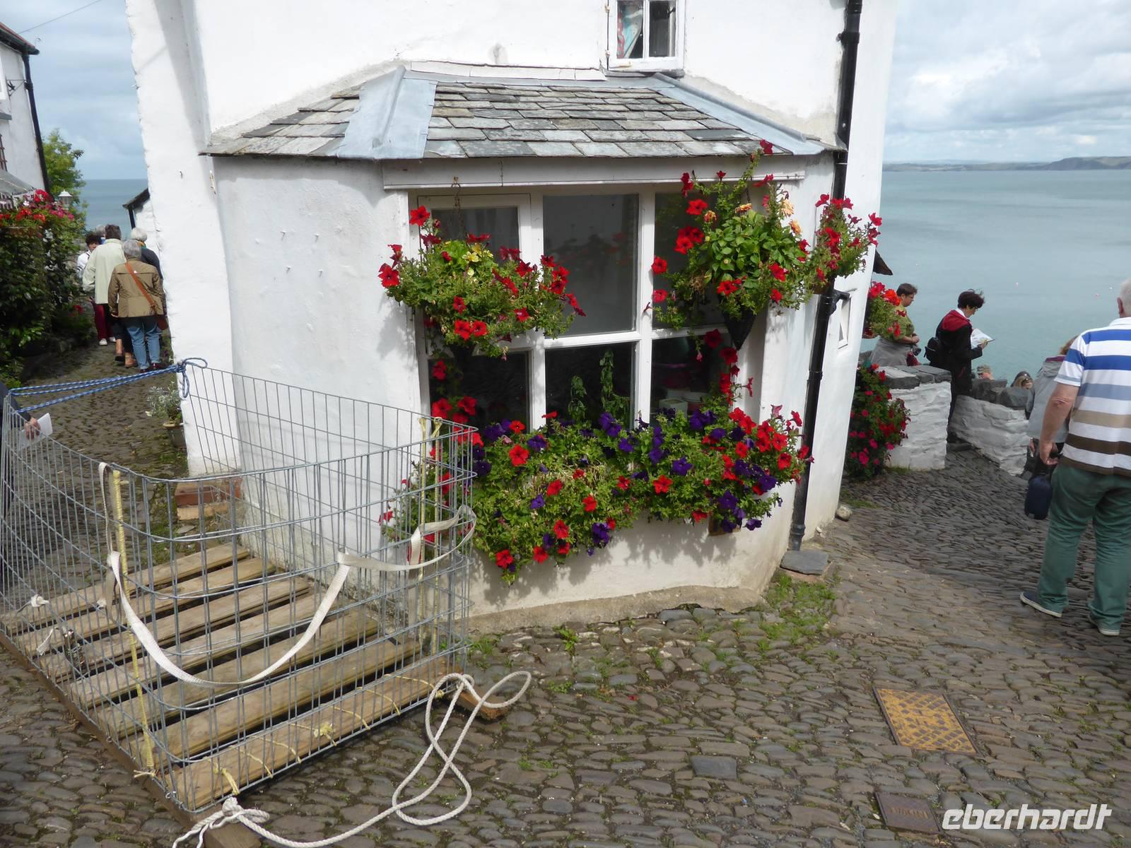 Über Boscastle, einem winzigen Weiler und ehemalige Schmugglerhochburg erreichten wir Clovelly. Dieses Dorf mit ca. 100 Einwohnern befindet sich heute im Privatbesitz. 120 m Höhenunterschied überwanden wir auf Kopfsteinpflaster hinunter zum Hafen. Diese Dorfstrasse ist gesäumt von blumengeschmückten Cottages sowie liebevoll dekorierten Hauseingängen. Am Wegesrand konnten wir die zahlreichen Transportschlitten erkennen. Für den steilen Rückweg nutzen wir den Landroverservice. Pünktlich zur Abfahrt fing es an zu regnen - gutes Timing!!