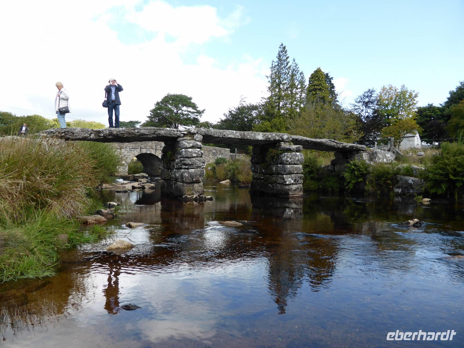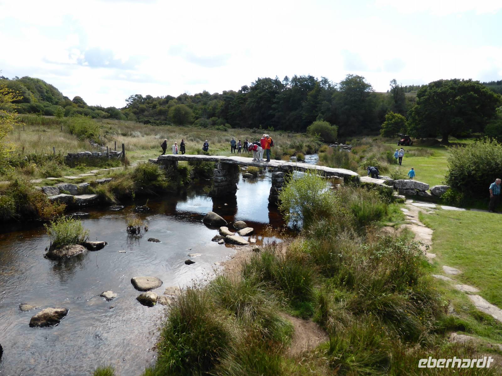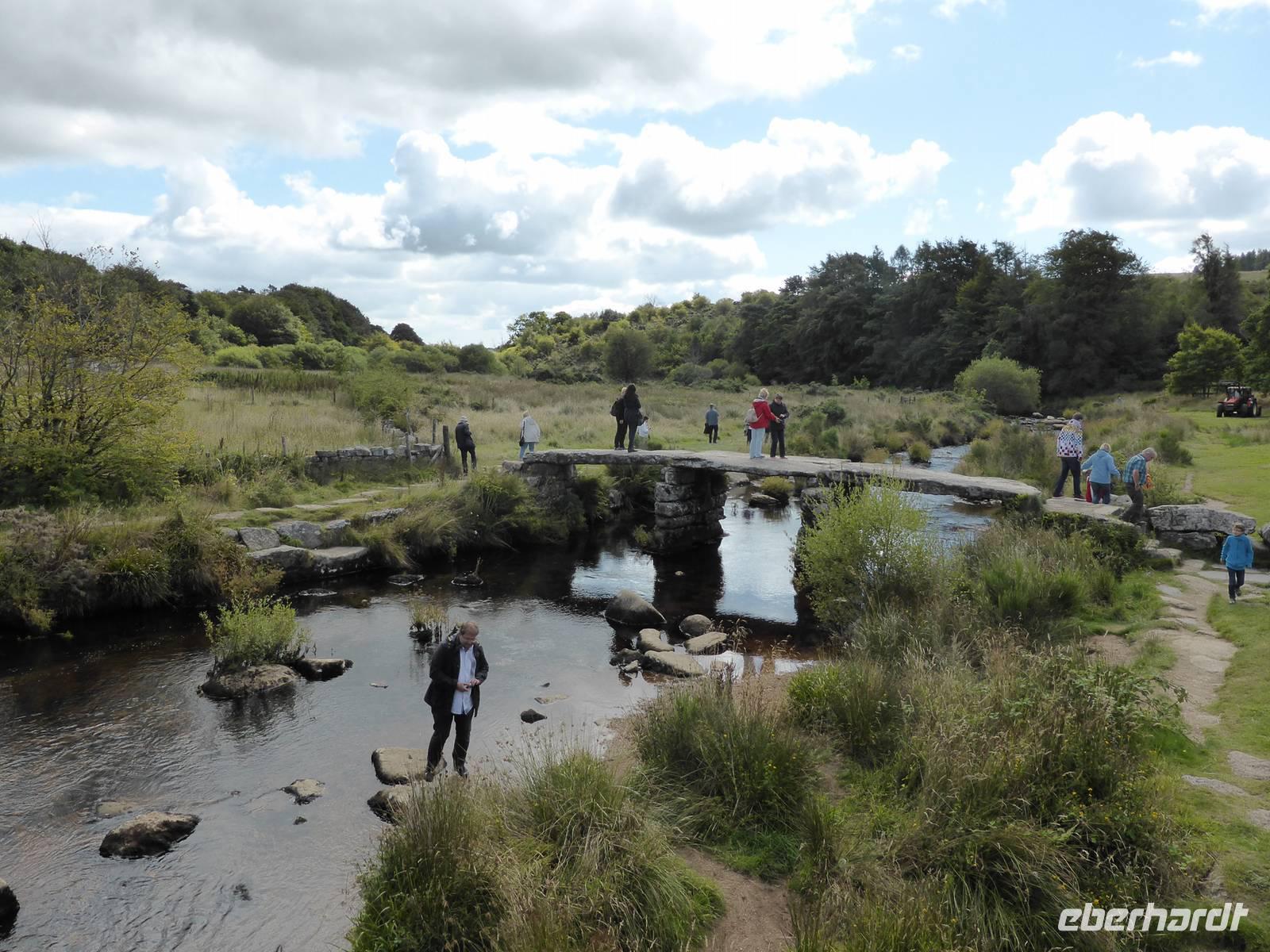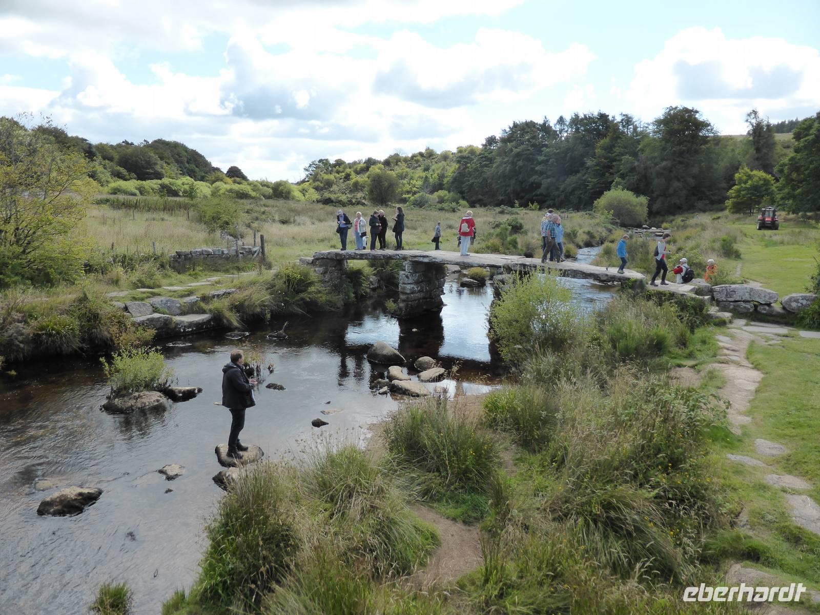 Nach unserem Aufenthalt in Exeter fuhren wir weiter durch das berühmte Dartmoor. Das Dartmoor entstand aus dem Zusammenwirken von menschlichen Einflüssen sowie Klimaveränderungen. Aufgrund des recht sonnigen Wetters erwartete uns eine bezaubernde Landschaft. Die Dartmoor Ponys und die weißen Kleckse der Schafe in den sanft geschwungenen Hügelhängen, die verschiedenen Grünschattierungen sowie die einzelnen Tors (Berge) ließen das Dartmoor sich von seiner schönsten Seite zeigen. Über Moretonhampstead, einem kleinen Marktort im nördlichen Dartmoor erreichten wir Postbridge mit seiner bekannten Clapperbridge, einer Steinplattenbrücke. In Tavistock, einer alten Stannary Town (Zinnstadt) besuchten wir die berühmten Markthallen.