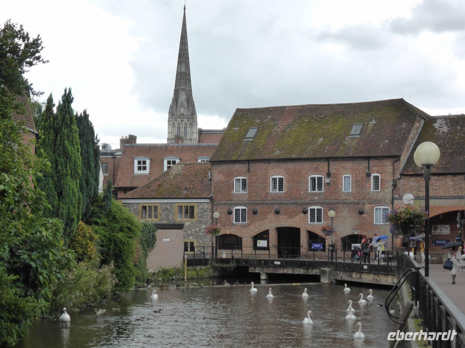 Nach diesem beeindruckendes Erlebnis führte uns der Weg nach Salisbury. Salisbury gehört mit der prachtvollen Kathedrale sowie der romantisch verträumten Altstadt zu den schönsten Städten Englands. Im 13. Jh. entstand in sehr kurzer Bauzeit ein gotisches Wunderwerk, das fast ausschließlich im reinsten Early-English-Stil (engl. Frühgotik) errichtet worden ist. Von Ferne grüßte uns bereits der 123 m hohe schlanke Turm, der höchste Kirchturm Englands. Dieser Turm brachte den Baumeistern viel Kopfzerbrechen, da er aus statischen Gründen nicht hätte gebaut werden dürfen. Unser Weg führte uns durch die größte Domfreiheit aller englischen Kathedralen zur Westfassade mit ihrem reichen Skulpturenschmuck.