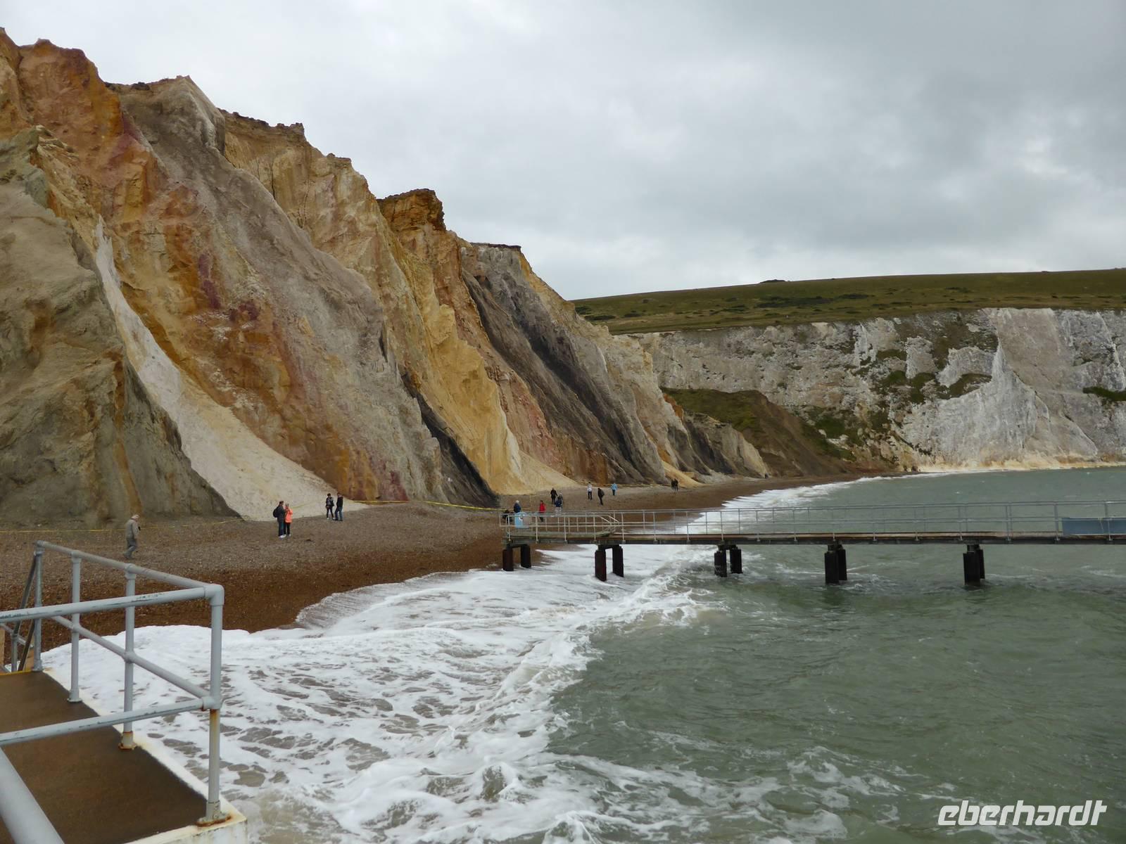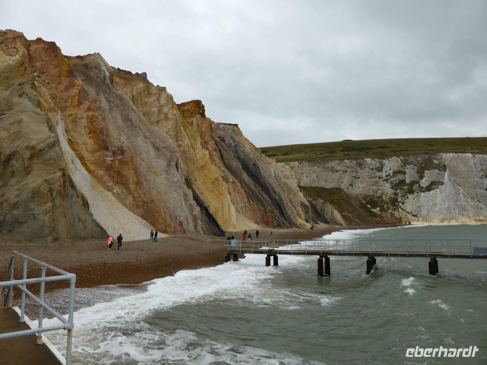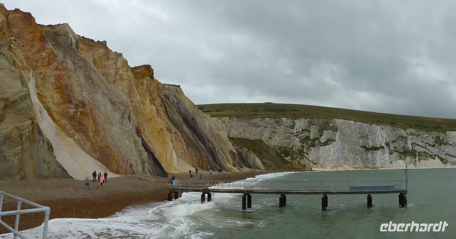 Entlang der Südküste vorbei an dem Heilbad Ventnor mit seinem botanischen Garten sowie dem St. Catherine´s Point dem südlichsten Punkt der Insel gelangten wir zu The Needles und die Alum Bay. An der Westspitze der Isle of Wight ragen drei große weiße Kreidefelsen aus dem Meer - die Needles. Sehr beeindruckend waren die bunten Sandsteinfelsen in dieser Bucht. Wir spazierten die Treppen hinunter zum Wasser, um die verschieden farbigen Sandsteinschichten zu betrachten. Der Rückweg zur Fähre führte uns über die Nordwestküste zurück nach East Cowes. Unsere Fähre erwartete uns bereits und brachte uns nach einer einstündigen Überfahrt über den Solent und durch den Mündungstrichter des Southampton Waters zurück nach Southampton.