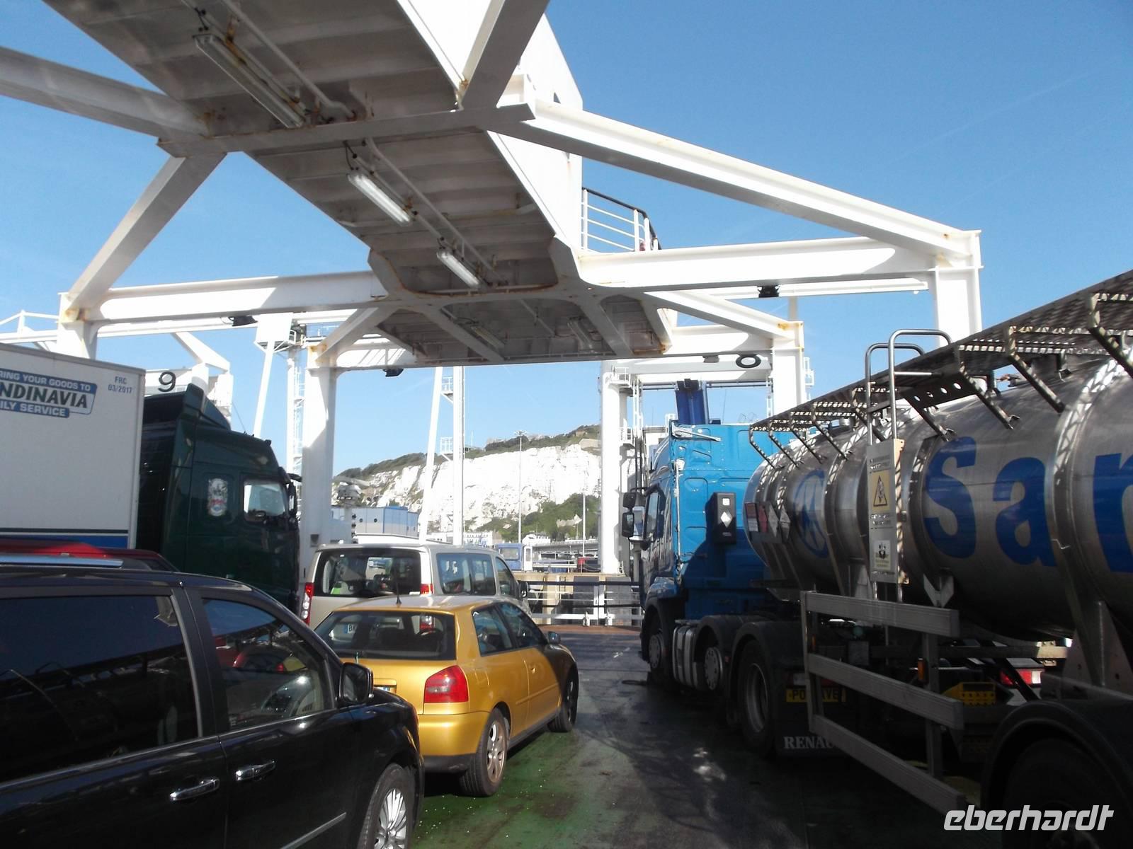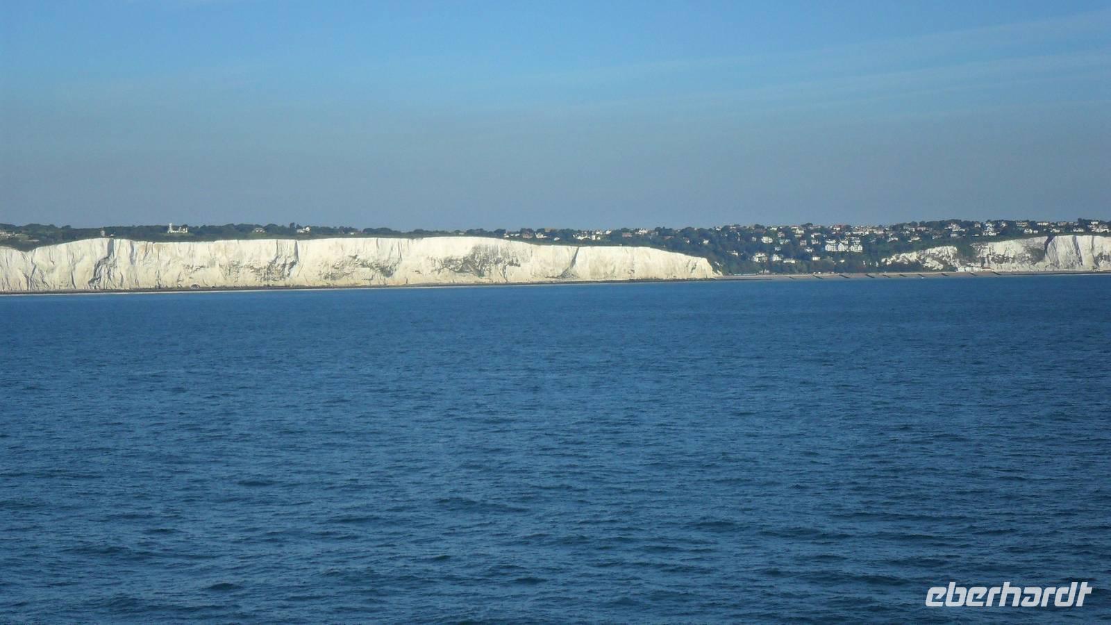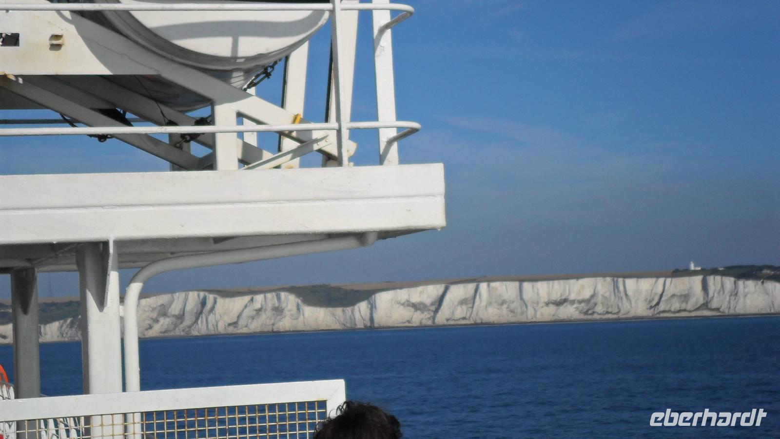 Nach einem recht frühen Frühstück - dennoch sehr gut und reichhaltig - brachen wir pünktlich auf zum Hafen. Hier wird man als England-Reisender durch einen Container mit der Passkontrolle geleitet, bevor Bus und Passagiere auf's Fährschiff dürfen. Alles ging dennoch recht flott und ohne große Verzögerung erreichten wir unser Fährschiff der „P & O-Line". Auf dem Schiff gilt es, am besten während der etwa eineinhalbstündigen Überfahrt die Uhren umzustellen, denn die in Großbritannien herrschende Sommerzeit liegt eine Stunde hinter unserer kontinentalen Sommerzeit zurückViele von uns hielten auf dem Deck nach der auftauchenden Kreideküste Ausschau, die schon von Weitem zu sehen ist, und der vielleicht England seinen antiken Namen „Albion" (die Weiße) zu verdanken hat. antworten hatte.