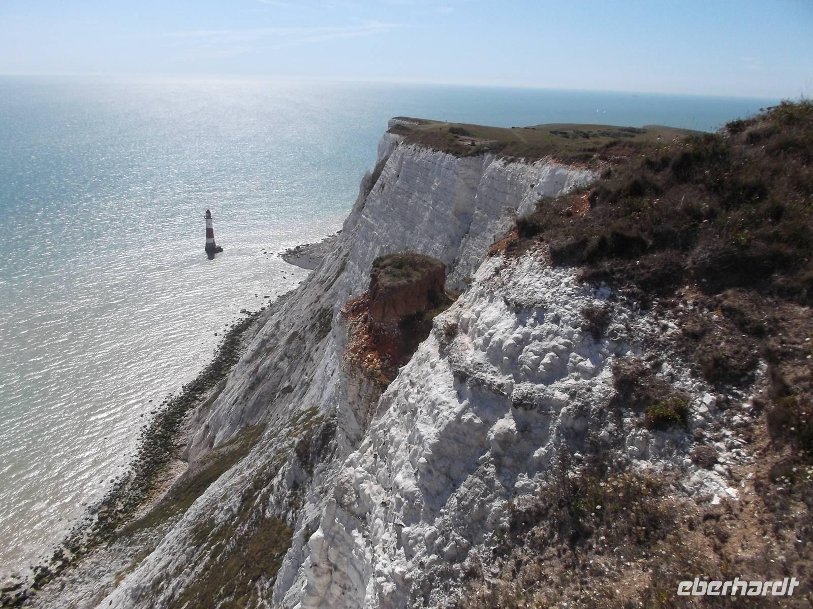 Der nächste Ort, den wir erreichten, war ein weiterer Hafen des Städtebundes. Hastings aber hat für die englische Geschichte noch eine andere große Bedeutung, denn hier wurde eine entscheidende Schlacht geschlagen. 1066 schlug im nahegelegenen Battle Wilhelm „der Eroberer", Herzog der Normandie, den angelsächsischen König Harold Godwinson und leitete mit diesem Sieg der Normannen deren bzw. die französische Herrschaft über England ein. Heute ist Hastings ein bekannter Fischerort, vor allem aber leicht überlaufener Touristenort und Seebad. Auf unserem weiteren Weg bauten wir als „Richtig-Reisen-Extra" einen Abstecher zur Steilküste beim Seebad Eastbourne ein. „Beachy Head" heißt deren höchste Erhebung, eine Landzunge in der Region der South Downs - ein Kreidefelsen von 162 m Höhe über dem Meeresspiegel und damit die höchste Klippe in Großbritannien. Da der hochaufragende Fels von Beachy Head vom Meer aus als Landmarke gut sichtbar ist, war genau hier der Ort für einen spektakulär platzierten Leuchtturm, der heute neben einem älteren „lighthouse" auf der Klippe seit 1902 auf einer Plattform mitten im Wasser steht und einen aufregenden Kontrast zu den weißen Felsen bildet.