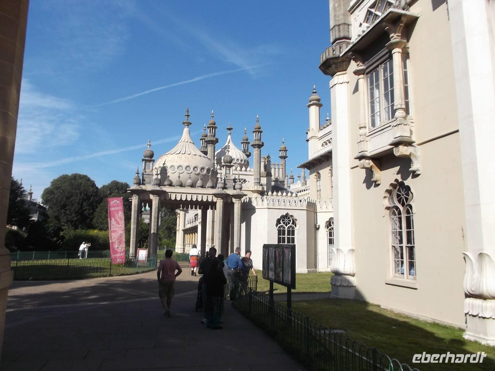 Unser Tagesziel war aber das bekannteste und vielleicht mondänster britische Seebad Brighton. Eher bekannt für Parties und Nachtleben, für ihr „Leisure Pier" - eine Seebrücke mit Spielautomaten, Kiosken und Rummel-Atmosphäre, bietet der Ort aber auch eine hübsche Altstadt mit verwinkelten Gassen sowie den „Royal Pavillion". Manchmal als das „exotischste Schloss Europas" bezeichnet, wurde der für den Prinzen von Wales, Georg IV., in den Jahren 1815-1822 vom Architekten John Nash erbaute Palast im indischen Stil gehalten, ganz nach seinen Vorbildern, den Mogulpalästen auf dem indischen Subkontinent. Nach mehrfachem Besitzwechsel gehört er schließlich der Stadt Brighton, die ihn nach dem Zweiten Weltkrieg mit große Anstrengungen originalgetreu restaurieren ließ.