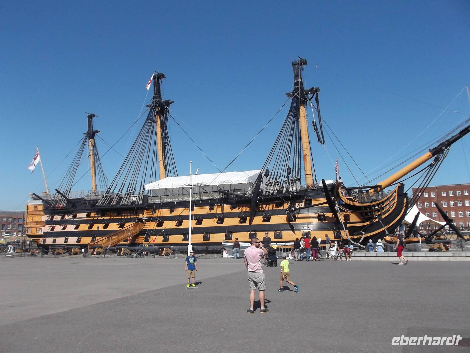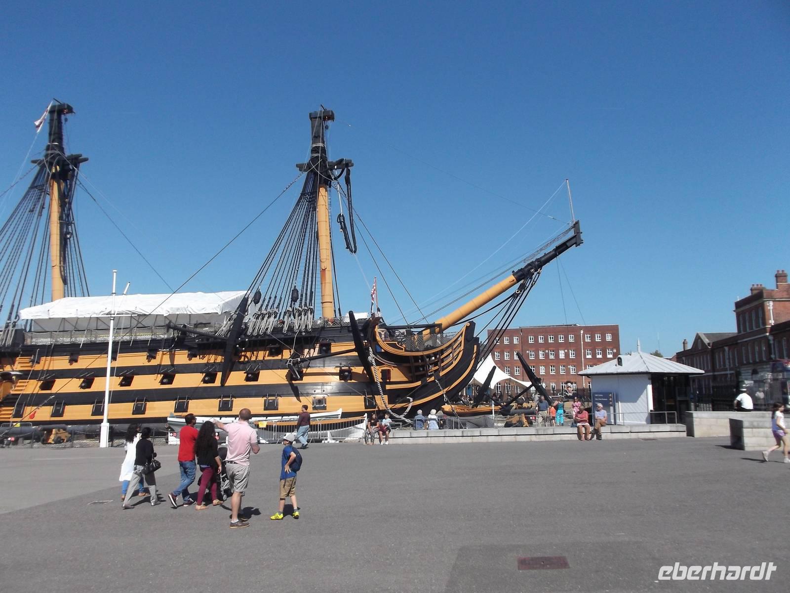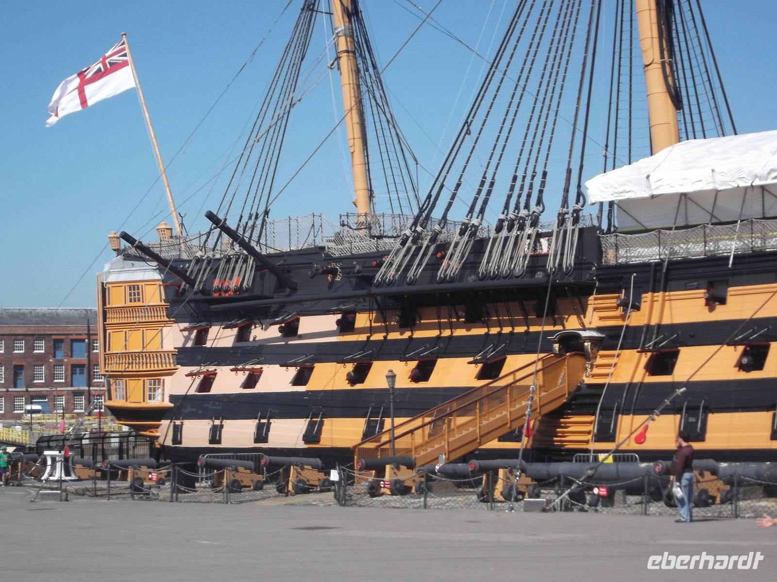 Nach dem Aufenthalt in Arundel ging es zu einem der immer noch bedeutendsten britischen Militärhäfen nach Portsmouth. Offiziell gilt die 200.000 - Einwohner-Stadt, in der die „Royal Navy", die „Königliche Marine" der Hauptarbeitgeber ist, sogar als der wichtigste militärische Hafen Europas, in dem große Teile der britischen Kriegsmarine stationiert sind, unter anderem alle britischen Flugzeugträger und ein U-Boot Trainingszentrum. Aus all diesen Traditionen des Hauptquartiers der Royal Navy hat sich einer der größten maritimen Museumskomplexe der Welt entwickelt. Neben zahlreichen Schiffs- und Marinemuseen findet man hier auch verschiedene, zur Besichtigung freigegebene historische Kriegsschiffe. Das hierbei sicherlich begehrteste Besichtigungsobjekt ist die HMS „Victory", einst das Flaggschiff der britischen Flotte beim Seesieg der Engländer gegen Napoleon in der Schlacht von Trafalgar 1805 unter dem Kommando des legendären Lord Nelson. Schon 1765 war dieses große Linienschiff in Dienst gestellt worden. Die Bezeichnung „Linienschiff" rührt von den in mehreren Etagen angeordneten „Kanonenlinien" her und die „Victory" verfügte mit ihren 104 Kanonen über eine für die damalige Zeit beachtliche Feuerkraft. Das imposante Schiff liegt heute als Museum im Trockendock - mit 70 m Länge und einst 850 Mann Besatzung eine schwimmende Festung. Es bietet nicht nur einen malerischen Anblick, sondern auch einen eindrucksvollen Einblick in die Lebensbedingungen englischer Seesoldaten des 19. Jahrhunderts. Zudem erhält man hier unerwartete und phantastische Eindrücke vom historischen Schiffsbau und Geschichte der Seekriege - nicht nur für Liebhaber von Piratenfilmen sondern auch immer wieder für unsere Reisenden ein besonderes Erlebnis.