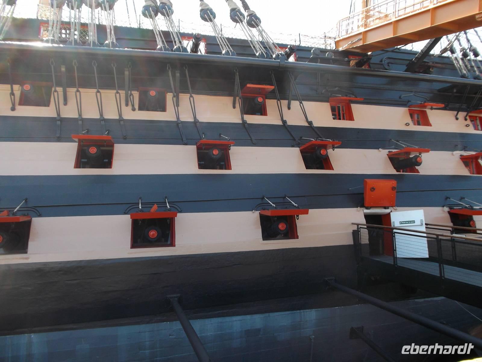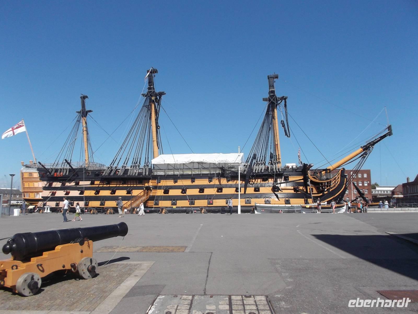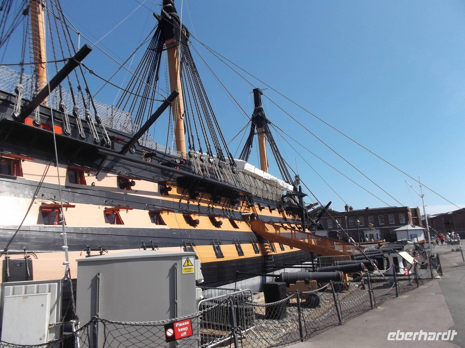Nach dem Aufenthalt in Arundel ging es zu einem der immer noch bedeutendsten britischen Militärhäfen nach Portsmouth. Offiziell gilt die 200.000 - Einwohner-Stadt, in der die „Royal Navy", die „Königliche Marine" der Hauptarbeitgeber ist, sogar als der wichtigste militärische Hafen Europas, in dem große Teile der britischen Kriegsmarine stationiert sind, unter anderem alle britischen Flugzeugträger und ein U-Boot Trainingszentrum. Aus all diesen Traditionen des Hauptquartiers der Royal Navy hat sich einer der größten maritimen Museumskomplexe der Welt entwickelt. Neben zahlreichen Schiffs- und Marinemuseen findet man hier auch verschiedene, zur Besichtigung freigegebene historische Kriegsschiffe. Das hierbei sicherlich begehrteste Besichtigungsobjekt ist die HMS „Victory", einst das Flaggschiff der britischen Flotte beim Seesieg der Engländer gegen Napoleon in der Schlacht von Trafalgar 1805 unter dem Kommando des legendären Lord Nelson. Schon 1765 war dieses große Linienschiff in Dienst gestellt worden. Die Bezeichnung „Linienschiff" rührt von den in mehreren Etagen angeordneten „Kanonenlinien" her und die „Victory" verfügte mit ihren 104 Kanonen über eine für die damalige Zeit beachtliche Feuerkraft. Das imposante Schiff liegt heute als Museum im Trockendock - mit 70 m Länge und einst 850 Mann Besatzung eine schwimmende Festung. Es bietet nicht nur einen malerischen Anblick, sondern auch einen eindrucksvollen Einblick in die Lebensbedingungen englischer Seesoldaten des 19. Jahrhunderts. Zudem erhält man hier unerwartete und phantastische Eindrücke vom historischen Schiffsbau und Geschichte der Seekriege - nicht nur für Liebhaber von Piratenfilmen sondern auch immer wieder für unsere Reisenden ein besonderes Erlebnis.