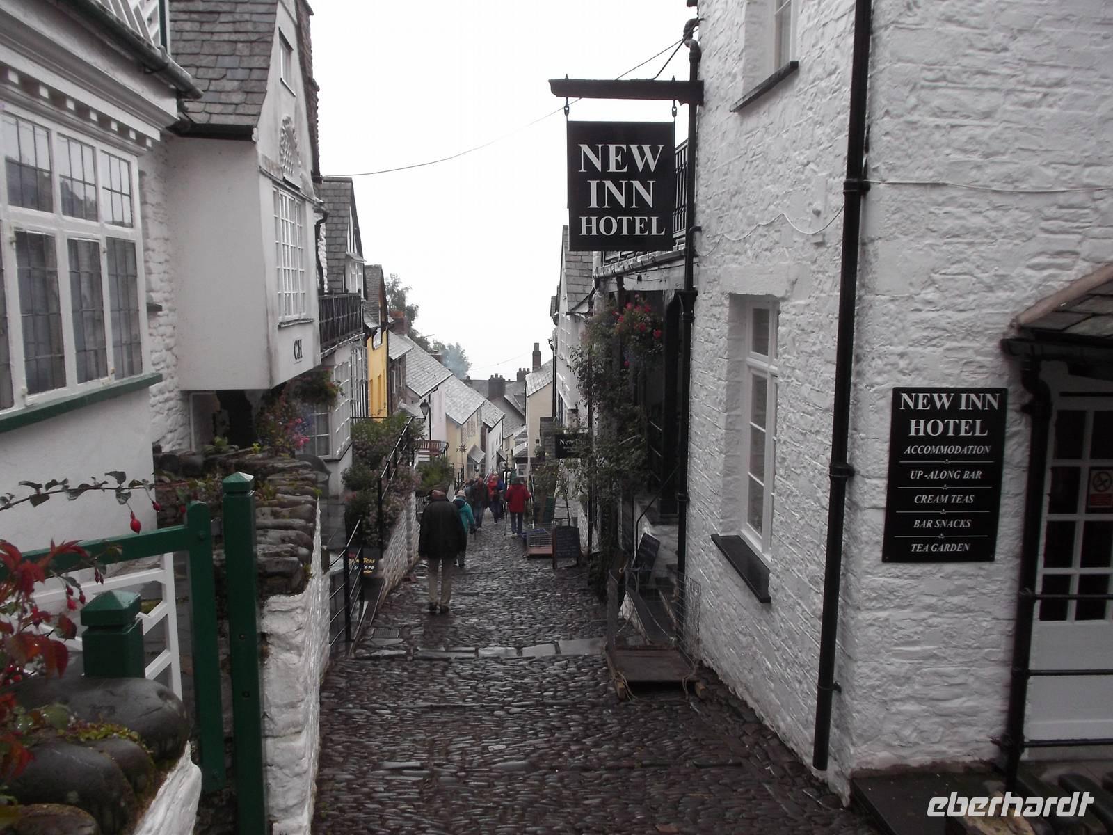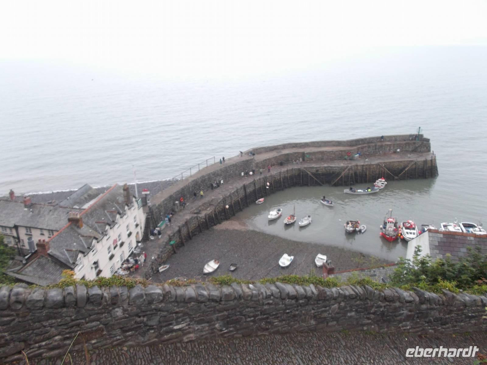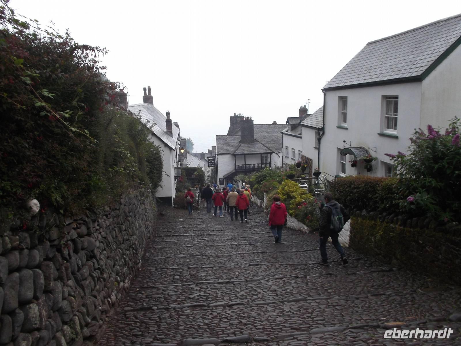 Der letzte große Höhepunkt an diesem Tag war dann der Aufenthalt in Clovelly. In malerischer Lage und ebenfalls einstmals durchaus mit Piraterie verbunden, lockt dieser Ort täglich viele Touristen an. Clovelly kann man nur zu Fuß besichtigen - Autos sind nicht erlaubt und könnten hier aufgrund aufgrund des steil abfallenden Kopfsteinpflasters auch nicht fahren. Kurioserweise wickelt man Lieferungen und Warenverkehr wie vor Urzeiten mit einer Art provisorischer Gleitschlitten a. Steil ist der etwa 800 Meter lange Weg, gepflastert mit glatten Kieseln, der durch den unglaublich malerischen Ort bis hinunter zum Hafen aus dem 14. Jh. führt. Die derzeit etwa 400 Einwohner des Ortes, viele davon noch klassische Fischer, die in ihren uralten weißen Fischerhäuschen wohnen, sind offiziell wie das gesamte Dorf seit 250 Jahren im Privatbesitz der Familie Rous. Nach uraltem Recht Eigentümer von Land und Leuten nutzen die Erben heute die Eintrittsgelder, um das Dorf in all seiner Urwüchsigkeit zu erhalten. Sie sind gleichzeitig größter Arbeitgeber im Ort und betreiben eine Reihe von Webereien, Textilgeschäften sowie eine Handelskette.