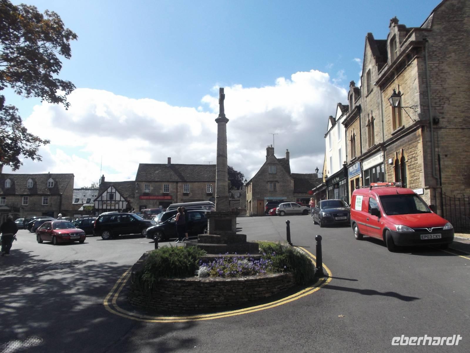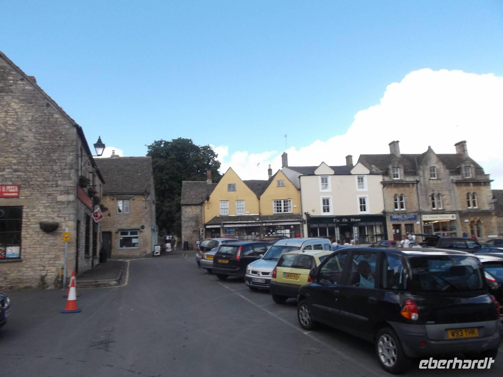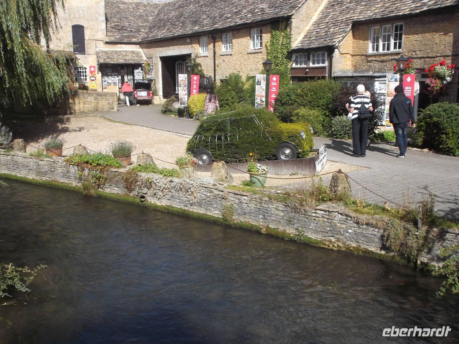 Heute Morgen fuhren wir nach dem Frühstück in die Cotswolds. Bei wieder schönem Wetter konnten wir die in England als Naherholungsgebiet beliebte Hügelkette erleben. Die Cotswolds waren eine der ersten Regionen, denen das Tourismusministerium das Prädikat: „area of outstanding natural beauty" - Gebiet außergewöhnlicher natürlicher Schönheit - verlieh. Bekannt ist der Landstrich für seine seit dem 15. Jahrhundert bestehende intensive Schafzucht und Wollproduktion. Das bescherte den Cotswolds gediegenen Reichtum und eine Reihe von schmucken Dörfern und Marktstädtchen, erbaut für Schafzüchter, Wollhändler und Tuchmacher. Ihre Häuser ließen die Bewohner aus honiggelbem einheimischem Sandstein errichten - dem sogenannten Oolith. Unser erstes Ziel hier in den Cotswolds war das Vorzeige-Städtchen Burton-on-the-Water. Hier verläuft das Leben traditionell und für den heutigen Samstag war für das winzige Städtchen am Fluss Windrush mit einem Ansturm von Ausflüglern aus den umliegenden Großstädten zu rechnen. Zahlreiche, das hier kaum knietiefe Flüsschen überquerende Bogenbrückenm ohne Geländer haben Bourton-on-the-Water zu seinem Beinamen „Venedig der Cotswolds" verholfen.