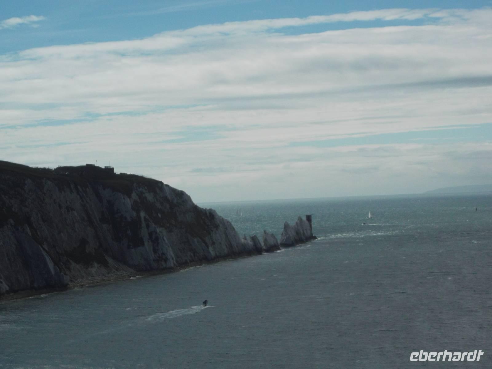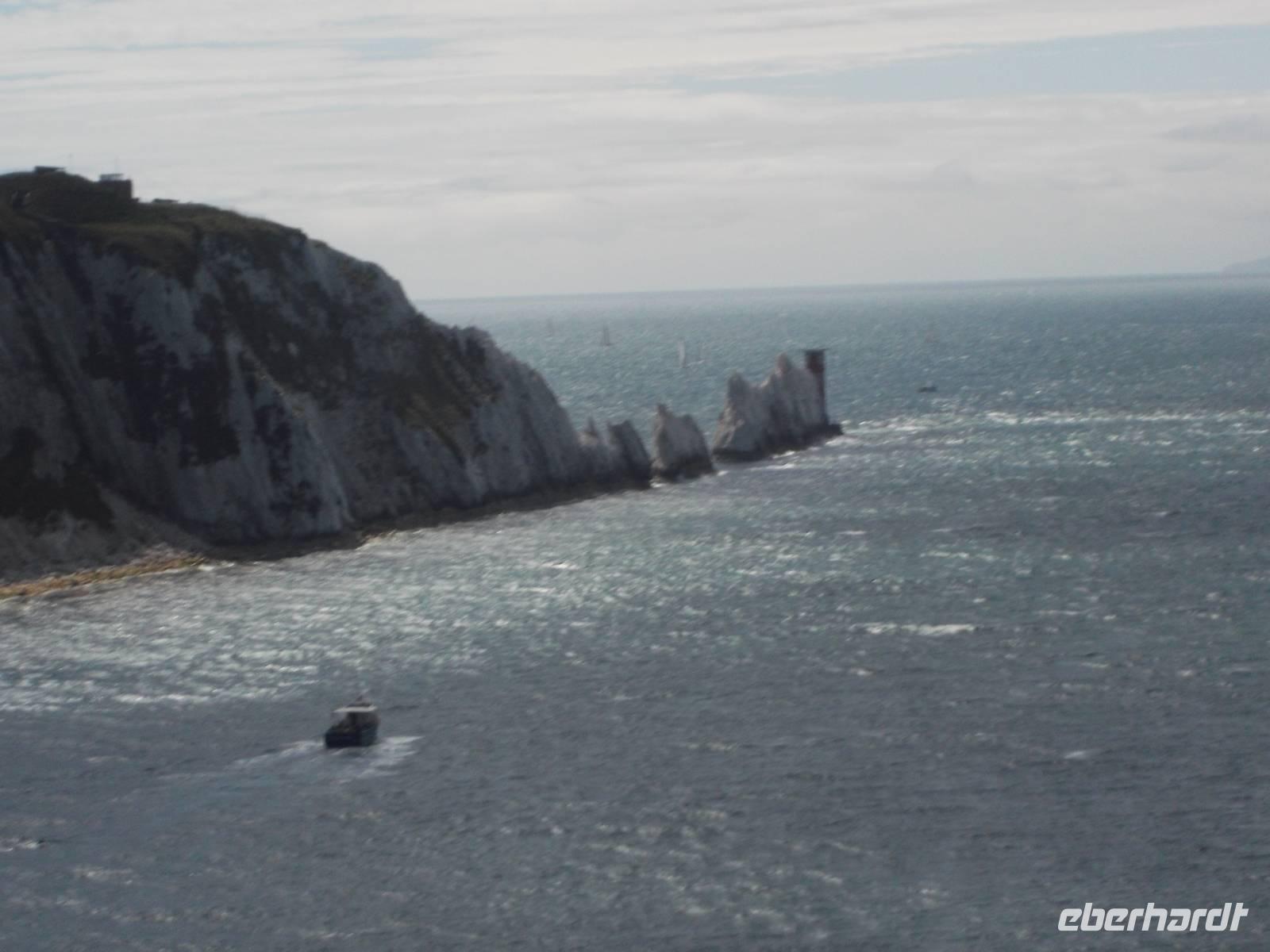 Ahnlich wie das kleinere Godshill präsentiert sich auch Shanklin, eine der touristisch aktivsten Städte der Insel mit seinen schilfgedeckten Häusern, in denen oft Pubs, Restaurants oder Cafés untergebracht sind. Eine Besonderheit der Insel, die viele verträumte Winkel zu bieten hat, sind ihre schönen Badestrände sowie erdrissähnliche Felsenschluchten, die man hier auf der Insel „Chine" nennt. Nach Bummel in Shanklin inklusive Mittagspause ging es am Nachmittag zur wohl bedeutendsten Sehenswürdigkeit und zum landschaftlichen Höhepunkt der Insel ging.