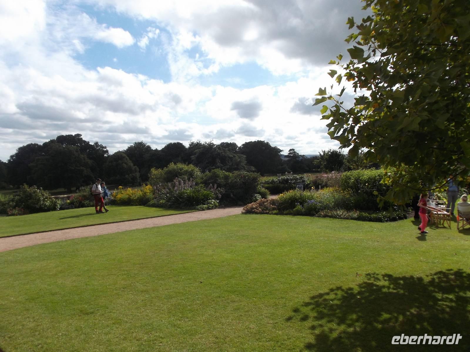 Nach Passieren eines der drei Tore., die den Kathedralenbezirk von der übrigen Innenstadt trennen, gelangten wir durch die hübsche Altstadt von Salisbury zum Busbahnhof und fuhren in Richtung Exeter durch die Hügel von Wiltshire. Die Grafschaft ist berühmt für ihre „Hügelfiguren", die seit Jahrhunderten von den Bauern Figuren durch Abtragen der dünnen Rasendecke über dem weißen Kalkstein vielerorts aus der Landschaft herausleuchten. Während schon aus vorrömischer Zeit Umrisse mit Darstellungen von Pferden und mitunter auch Menschen bekannt sind, konnten wir „Wiesenbilder" aus neuerer Zeit entdecken: die Hügelfiguren hier zeigen die Regiments-Abzeichen bedeutender Armee-Einheiten. Bei einem Fotostopp konnten wir diesen seltsamen Anblick genieß0en und natürlich auch festhalten. Bevor wir unser Tagesziel Exeter erreichten, war noch der Besuch eines „Manor" vorgesehen, eines typisch englischen Herrenhauses. In Killerton House, nahe Exeter gelegen und von einem großen Park und herrlichem Garten umgeben, konnten wir nicht nur das Haus selbst und seinen Park bewundern, sondern auch einen englischen „cream tea" genießen. Im Süden und der Mitte Englands sowie in Wales verbreitet, wird hier zum üblichen Nachmittagstee ein milchbrötchen-ähnliches Gebäck mit Rosinen gereicht. Mit Marmelade und danach mit ungeschlagener dicker Sahne, sogenannter „clotted cream" bestrichen, sind die „Scones" eine leckere Zwischenmahlzeit und scheinen so recht auf den Tee abgestimmt. Auf jeden Fall hat es uns allen hervorragend geschmeckt. Nachdem wir uns noch kurz dem herrlichen Park gewidmet hatten - der vormittägliche Regen hatte endlich reinem Sonnenschein Platz gemacht - machten wir uns auf den Weg nach Exeter zu unserem zentral gelegenen Hotel.