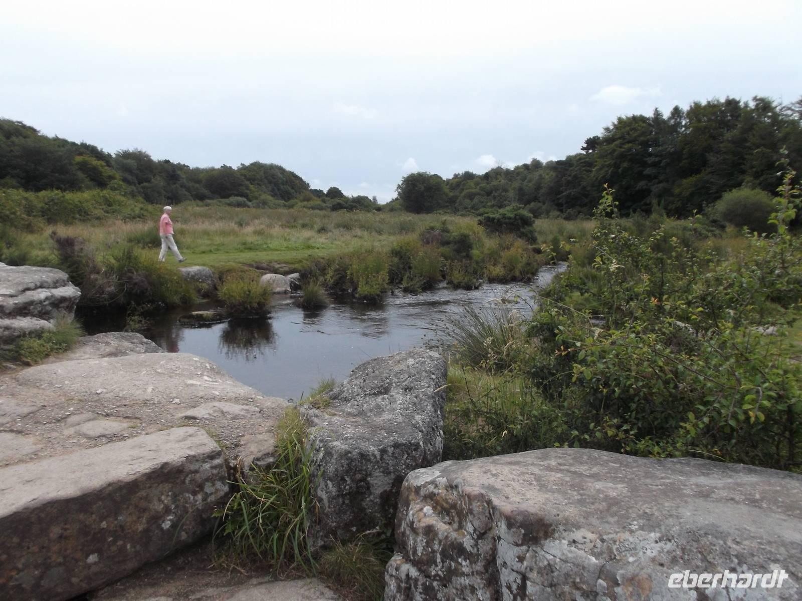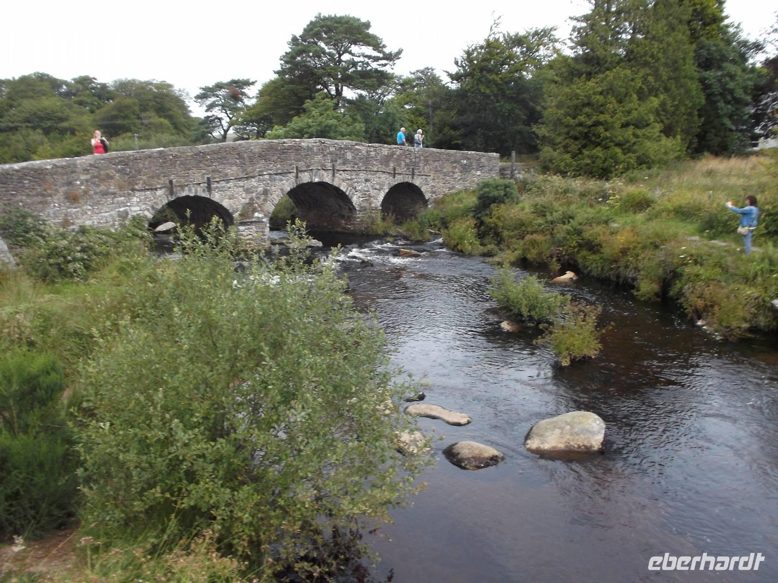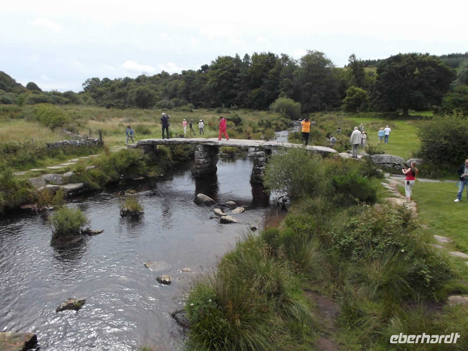 Erste Tagesetappe war dann das Dartmoor. In Deutschland vielleicht am bekanntesten durch die Edgar-Wallace-Krimis, in Großbritannien unter anderem durch Sir Arthur Conan Doyles Erzählung „Der Hund von Baskerville" zählt das Dartmoor zu den schönen, aber geheimnisvollen Landschaften Südenglands. Es ist ein Stein- und Sumpfgebiet, gelegen in einer Hügellandschaft, die mit etwa 650 km² größer ist als das Land Andorra. Die hügelige Moor und Heideflächen werden an vielen Stellen von flachen, mitunter auch fast turmartigen, Granitfelsbildungen überragt, die man hier „Tor" nennt und die an einigen Stellen bis auf 600 Meter über Normalnull ansteigen. Zahlreiche Fundamente prähistorischer Wohnstätten, Straßen und Steinkreise zeugen von einer frühen Besiedelung des geheimnisvollen Gebietes, das mit seinen plötzlichen Witterungsumschwüngen, häufigem Nebel und unerwarteten tückischen Sumpflöchern zahlreichen Legenden Raum gibt. Eine charakteristische Sehenswürdigkeit sind die sogenannten Clapper bridges, aus dünnen Granitplatten erbaute prähistorische Brücken über Bäche und Flüsse. Die bedeutendste dieser Großsteinbrücken findet man in Postbridge, wo wir sie fotografieren und natürlich selbst betreten konnten.