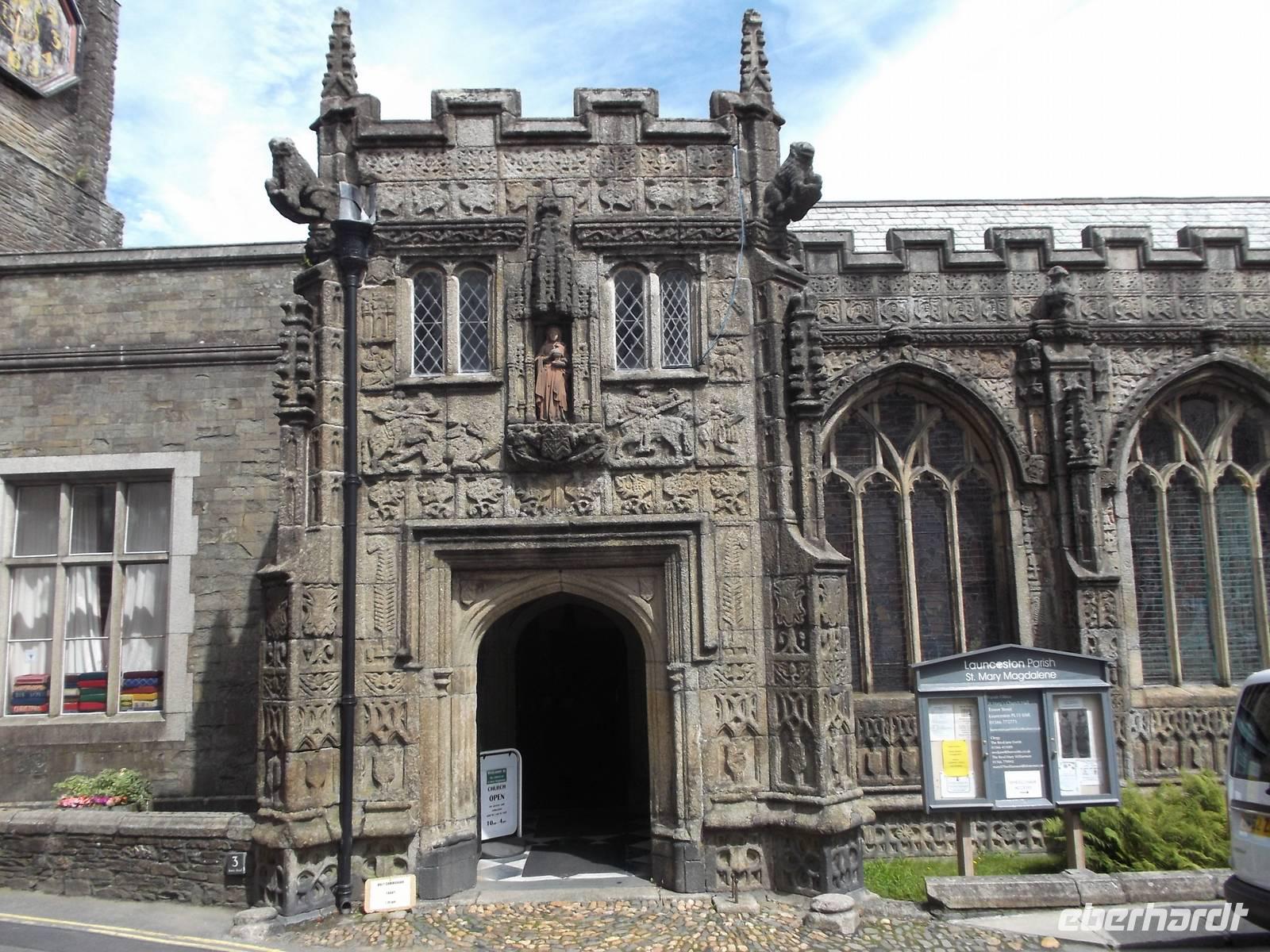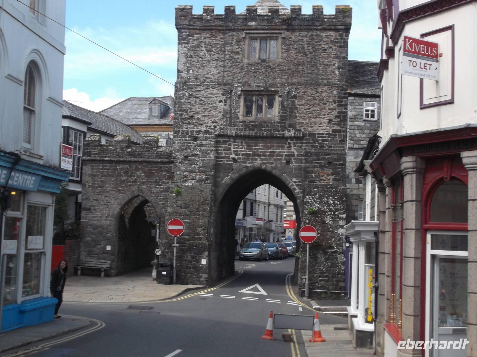 Nach dem Dartmoor legten wir einen Mittagsstopp in Launceston, einer Kleinstadt, die schon in Cornwall liegt und einst sogar Hauptstadt dieser Grafschaft - immer noch „Herzogtum" genannt - war. Die südwestlichste Halbinsel Großbritanniens, die wir nun betraten - pardon, befuhren! - ist nicht nur ein beliebtes Feriengebiet, sondern ein historisch bedeusamer Landstrich, in dem neben Fischerei und Landwirtschaft vor allem Zinn- und Kupferabbau eine Rolle spielten. Ein kleiner Bummel in Launbceston zeigte uns die Ruinen des gewaltigen Launceston Castle, das einst die Grenze zwischen Devon und Cornwall sicherte oder auch eines der Stadttore oder die mit Außenreliefs verzierte Stadtkirche