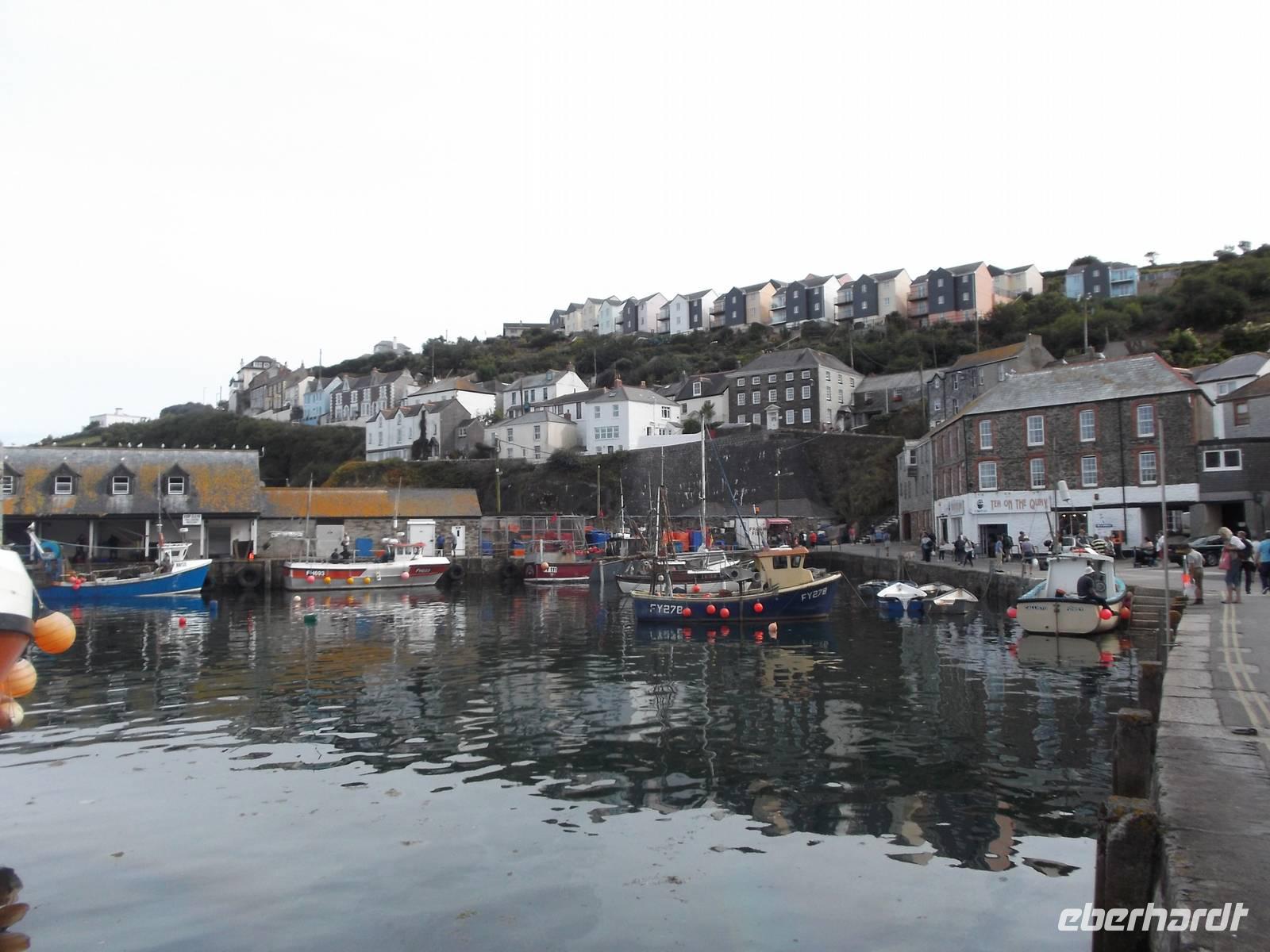 Auf dem weiteren Weg zu unserem heutigen Hotel konnten wir noch zwei „Richtig-Reisen-Extras" einbauen. Ein kleiner Abstecher führte zu einem Pub, der es in der Weltliteratur zu Ruhm und Ehre gebracht hat. Nahe dem Dörfchen Bolventor am Rande des Bodmin Moores liegt eine Taverne mit dem Namen „Jamaica Inn", die als Schauplatz des gleichnamigen Romans von Daphne du Maurier diente. Die heute leider etwas touristisch gestaltete Schmuggler-Kneipe wurde auch weltweit bekannt durch einen der ersten Filme von Alfred Hitchcock, der 1939 hier den Film „Riff-Piraten" (Originaltitel: "Jamaica Inn"; auch „Die Taverne von Jamaika") drehte. Ein zünftiger Rum für jeden von uns - und wir konnten uns wie Mitspieler im Film oder Romanhelden fühlen, denn hier waren wir am Originalschauplatz. Danach fuhren wir noch in den Fischerort Mevagissey. Dass Fischfang hier noch immer einen wichtigen Erwerbszweig bildet, sieht man - trotz der vielen Touristen - am geschäftigen kleinen Hafen des Dorfes. Der alte Ortskern mit seinen schmalen, malerischen Gassen und dem winzigen altern Hafen stzrahlt noch immer ein urwüchsiges, anheimelndes Ambiente aus und scheint längst vergangenen Tagen entsprungen.