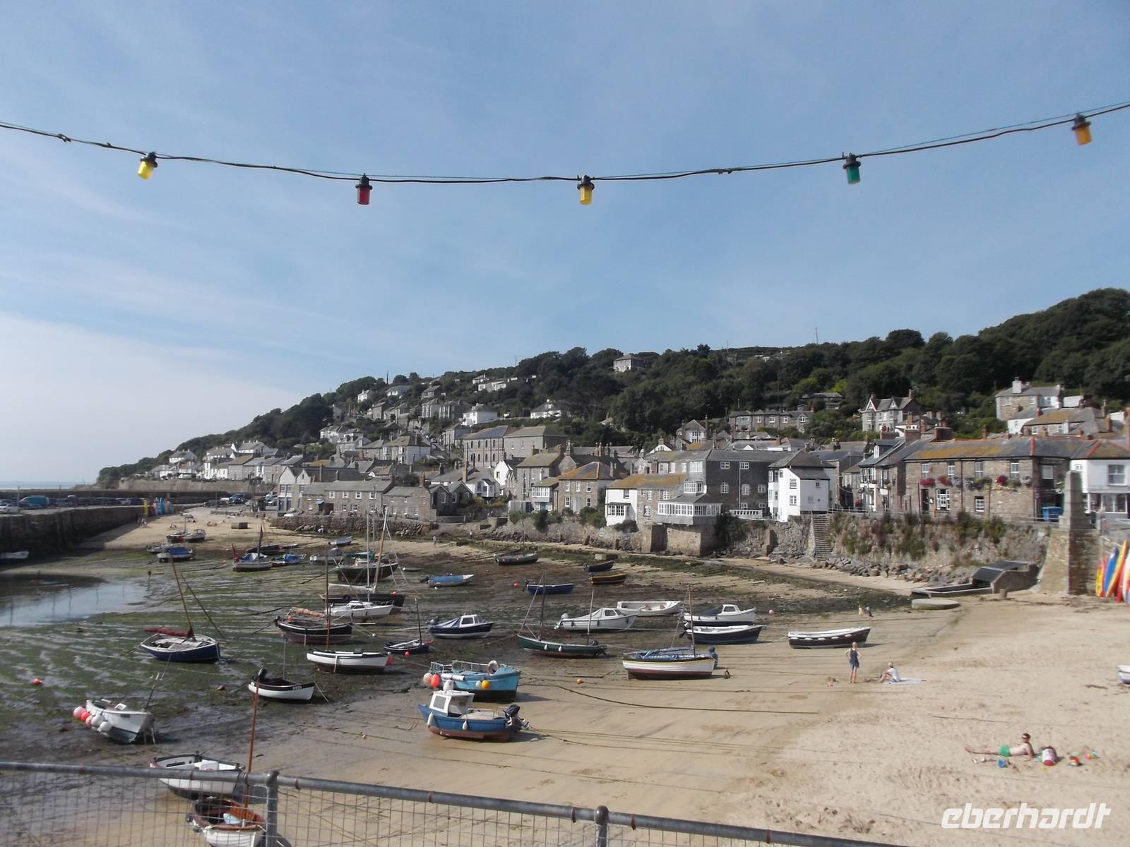 Nach dem Frühstück im Penmorvah Hotel hatten wir Zeit, um dem malerischen Fischerort Mousehole einen Besuch abzustatten - allerdings war es eine Herausforderung für unseren Buschauffeur Wilfried, die winzigen Straßen zu fahren und vor der Ortseinfahrt fast auf dem Punkt zu wenden. Dafür fanden wir noch den alten dörflichen Reiz vor, der zu jeder Jahreszeit Touristen nach Mousehole lockt, das sich rühmt, das schönste Fischerdorf Großbritanniens zu sein. Das hat den Einwohnern vielleicht der englische Dichter Dylan Thomas klargemacht, der es mit ebendiesem Prädikat beschrieb, als er 1938 seine Flitterwochen hier verbrachte. Die Anlage des Ortskerns mit engen und verschlungenen Sträßchen und dem winzigen Fischerhafen sorgt dann auch dafür, dass man die Namensgebung „Mauseloch" versteht. In Hanglage finden sich viele schmale und steile Gässchen mit gepflegten alten, aus Granitstein und Schiefer gebauten Häusern, die auf das Hafengebiet und den Atlantischen Ozean herabsehen. Der Golfstrom sorgt für ein extrem mildes, fast subtropisches Klima, in dem auch exotische Pflanzen gedeihen.