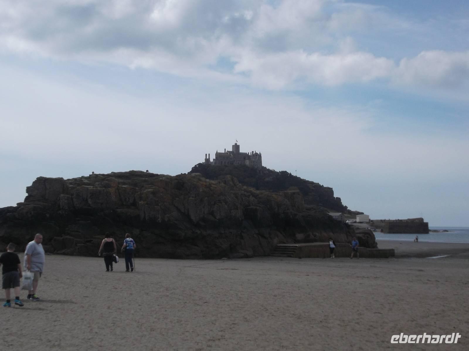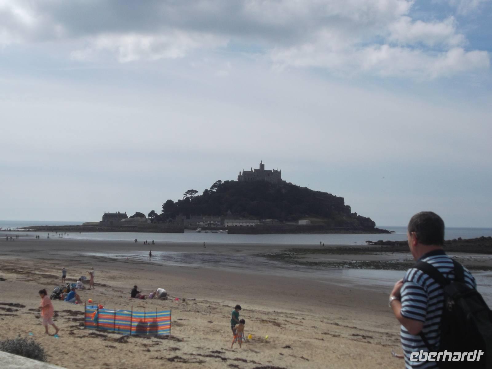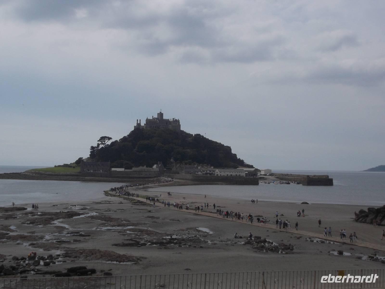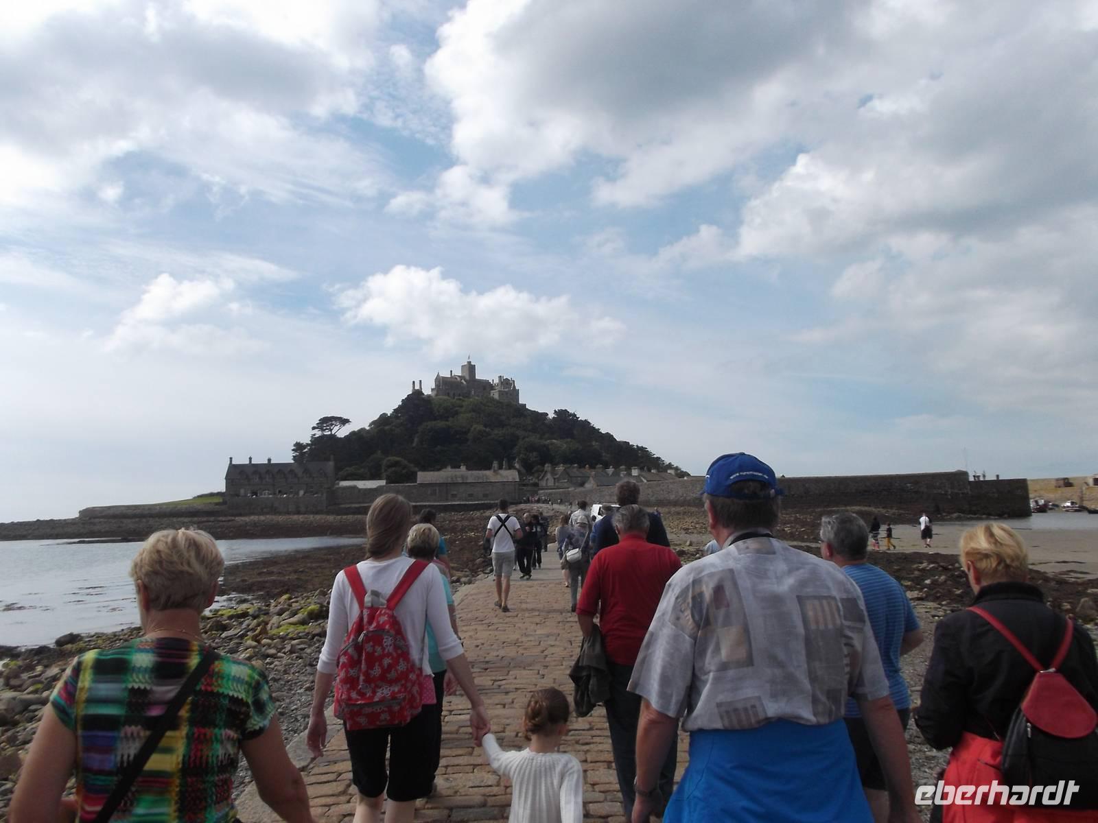 Anschließernd ging es in das hübsche Städtchen Marazion Hier liegt wenige hundert Meter vor der Küste der Felsen von St. Michael's Mount, eine Gezeiteninsel mit wenigen hundert Quadratmetern Fläche, die etwa 400 m im Meer vor Marazion in Cornwall liegt. In vielem ähnelt sie ihrem Namensvetter Mont-Saint-Michel im Norden Frankreichs, ist allerdings weniger bekannt. Das Besondere hier ist, dass man über einen gepflasterten Dammweg das Eiland bei Ebbe zu Fuß erreichen kann, während es bei Flut zur Insel wird und nur mit dem Boot erreichbar ist. Wir hatten es zeitlich so abgepasst, dass wir beides erleben konnten: den Fußmarsch auf dem Damm durchs Wattenmeer und die Bootsfahrt zurück, nachdem das steigende Flutwasser den Dammweg überschwemmte. Zwischendurch konnten wir die Klosterfestung besichtigen. Der Burgberg mit Kapelle - im 15. Jahrhundert errichtet - befindet sich in Privatbesitz, man kann ihn aber besichtigen. Die Familie der St. Aubyns lebt noch heute hier, der Besitz wird aber seit 1964 vom National Trust verwaltete. Malerisch gruppieren sich einige Häuser um den kleinen Hafen, bevor man die Treppen an der alten Molkerei vorbei durch den subtropischen Garten zu den Anlagen vor allem wehrhaften, aber auch religiösen Charakters emporsteigt. Wie auch der französische Mont St. Michel ist auch der St. Michael's Mount vor Marazion lange Zeit eine Pilgerstätte gewesen und genießt bis heute religiös-kultische Verehrung.