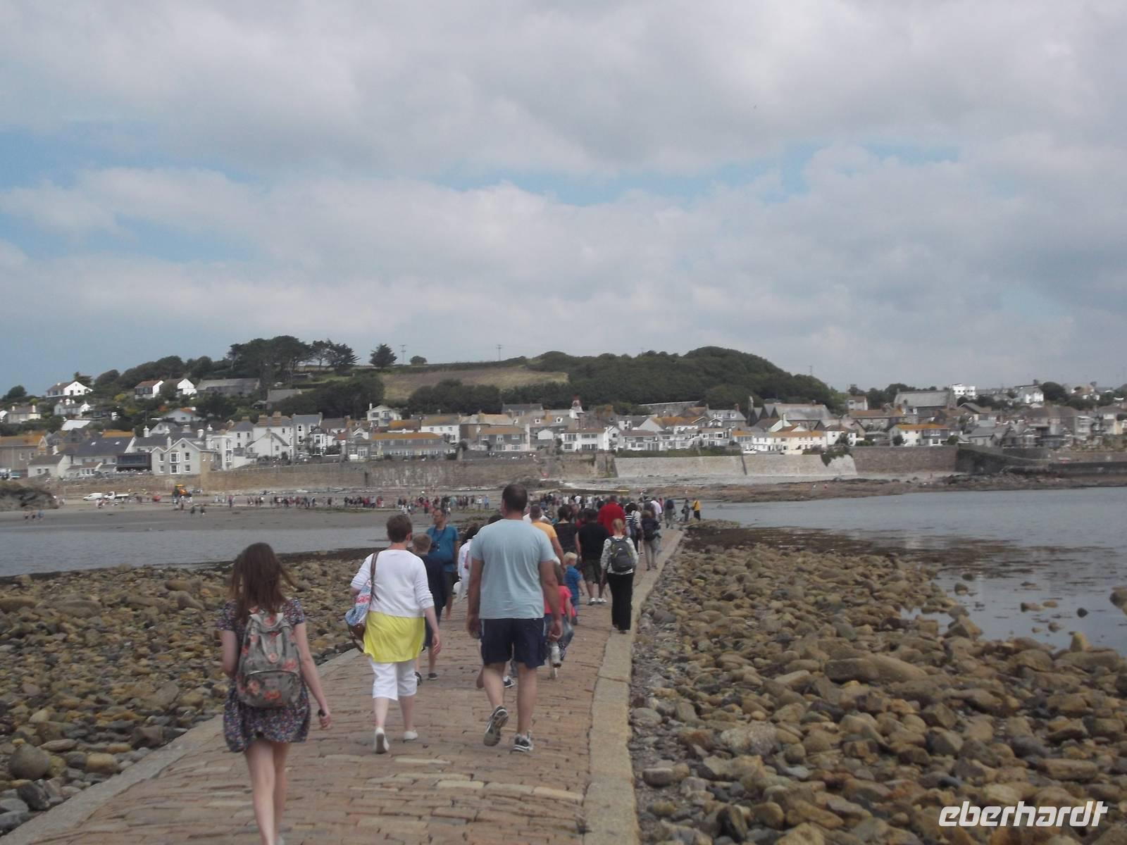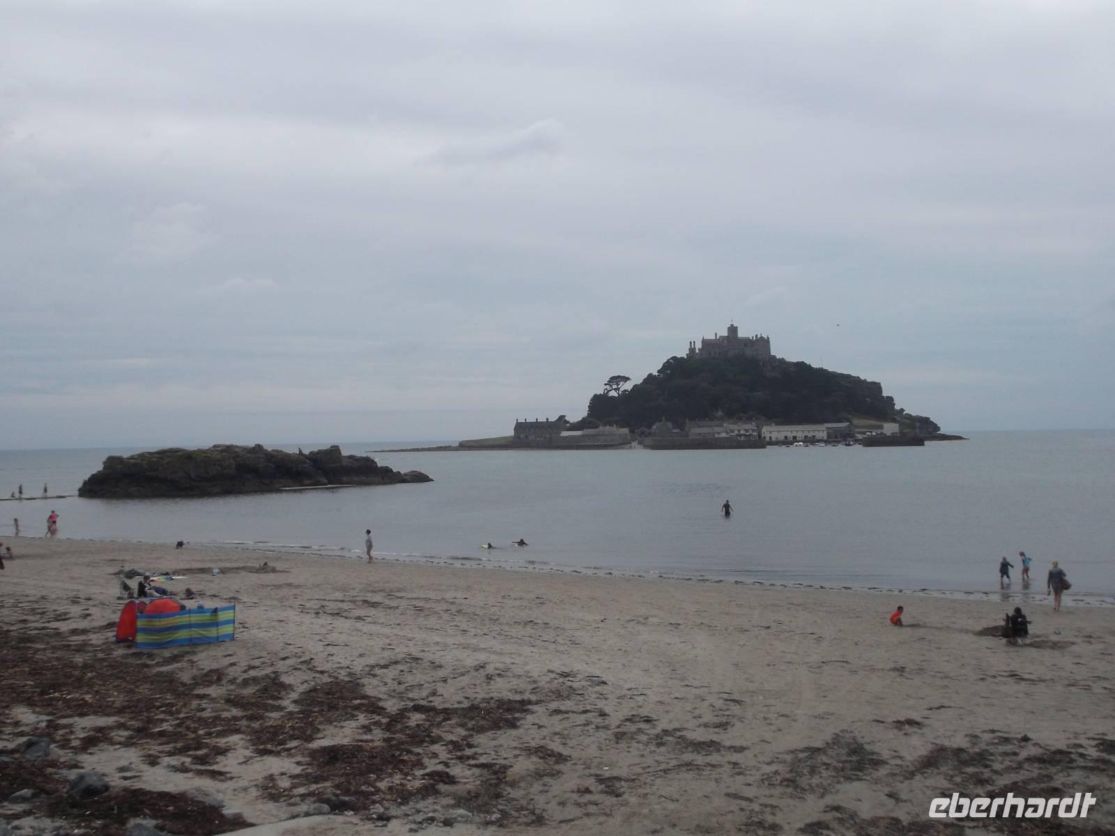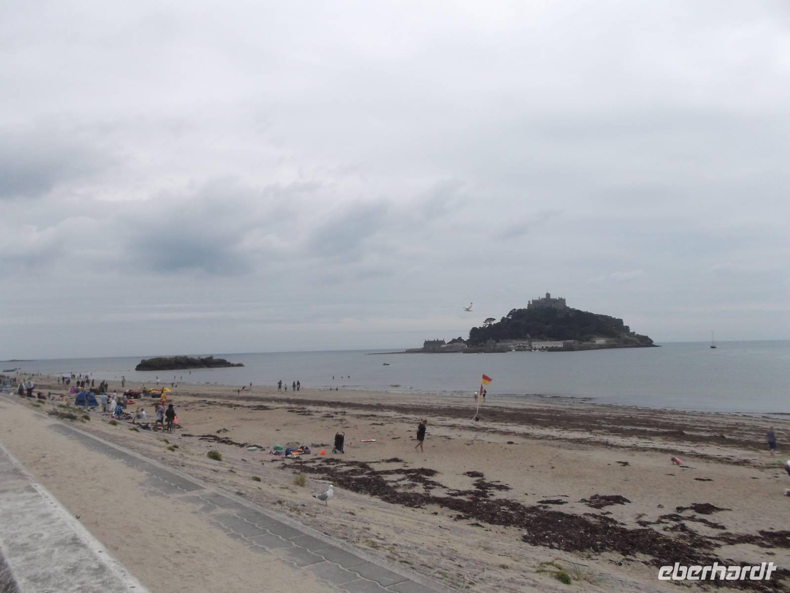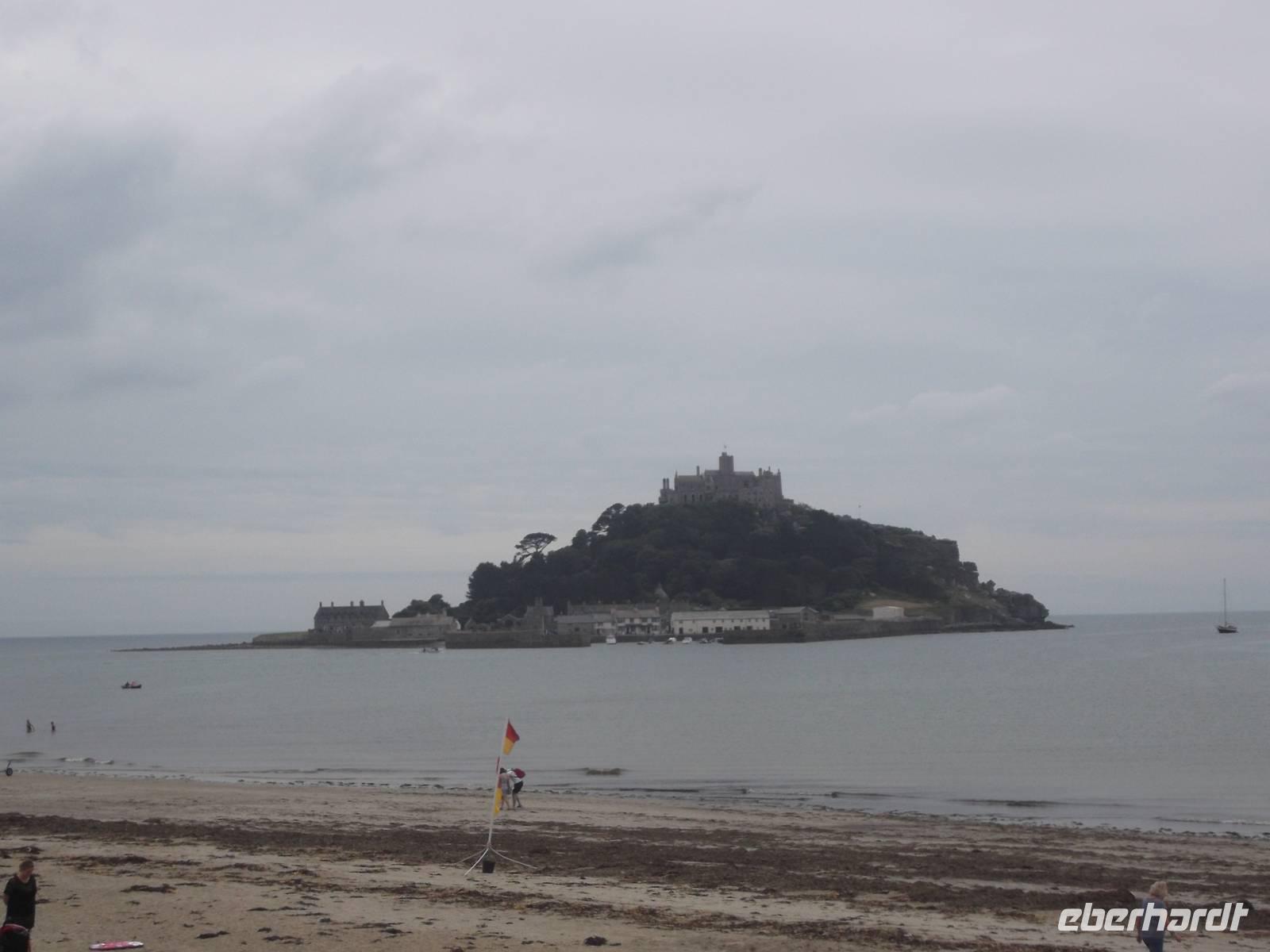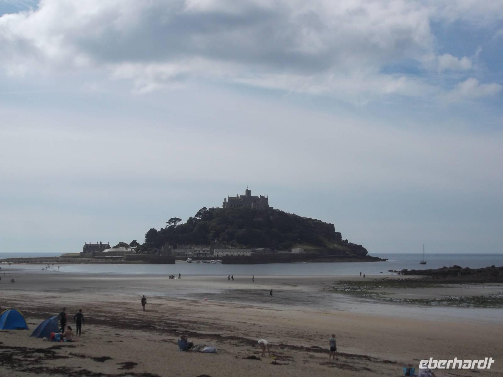 Anschließernd ging es in das hübsche Städtchen Marazion Hier liegt wenige hundert Meter vor der Küste der Felsen von St. Michael's Mount, eine Gezeiteninsel mit wenigen hundert Quadratmetern Fläche, die etwa 400 m im Meer vor Marazion in Cornwall liegt. In vielem ähnelt sie ihrem Namensvetter Mont-Saint-Michel im Norden Frankreichs, ist allerdings weniger bekannt. Das Besondere hier ist, dass man über einen gepflasterten Dammweg das Eiland bei Ebbe zu Fuß erreichen kann, während es bei Flut zur Insel wird und nur mit dem Boot erreichbar ist. Wir hatten es zeitlich so abgepasst, dass wir beides erleben konnten: den Fußmarsch auf dem Damm durchs Wattenmeer und die Bootsfahrt zurück, nachdem das steigende Flutwasser den Dammweg überschwemmte. Zwischendurch konnten wir die Klosterfestung besichtigen. Der Burgberg mit Kapelle - im 15. Jahrhundert errichtet - befindet sich in Privatbesitz, man kann ihn aber besichtigen. Die Familie der St. Aubyns lebt noch heute hier, der Besitz wird aber seit 1964 vom National Trust verwaltete. Malerisch gruppieren sich einige Häuser um den kleinen Hafen, bevor man die Treppen an der alten Molkerei vorbei durch den subtropischen Garten zu den Anlagen vor allem wehrhaften, aber auch religiösen Charakters emporsteigt. Wie auch der französische Mont St. Michel ist auch der St. Michael's Mount vor Marazion lange Zeit eine Pilgerstätte gewesen und genießt bis heute religiös-kultische Verehrung.