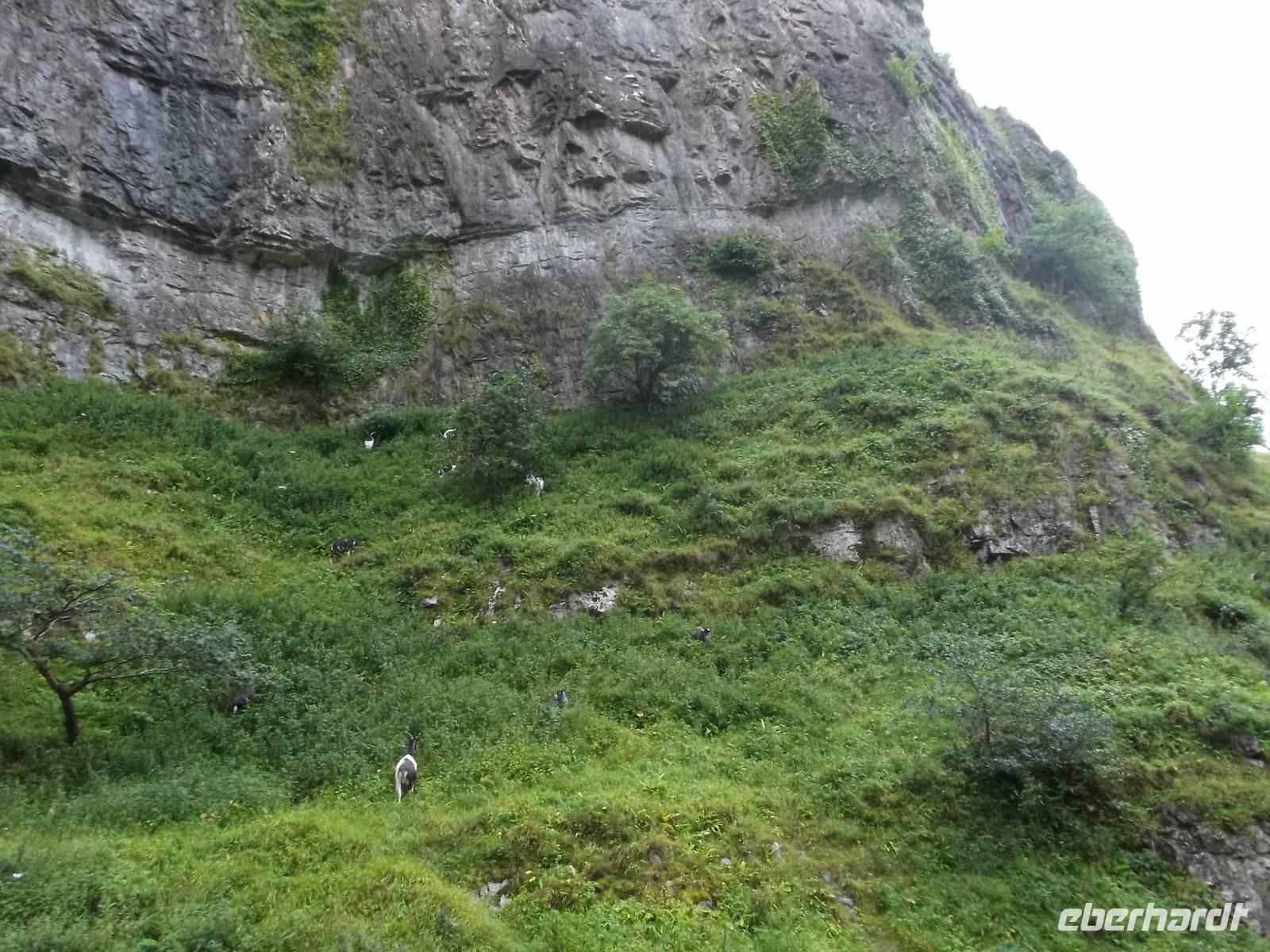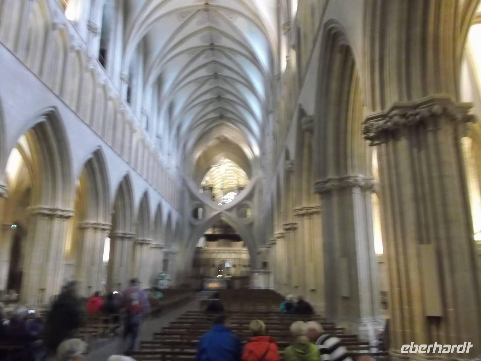Dessen Kathedrale aus dem 13. Jahrhundert zeigt eine bemerkenswerte Westfront mit über 300 Statuen, ein Paradebeispiel für eine englische Schirmfassade. Hier lässt sich fast so etwas wie eine architektonische Entwicklung ablesen, wenn man sie mit der früheren, nur ansatzweisen Fassade von Salisbury vergleicht. Als Besonderheit in die Architekturgeschichte eingegangen ist Wells auch wegen ihrer vier Scherenbögen im Inneren der Kirche. Es ist eine atrchitektonische Originallösung, da die Scherenbögen auf geniale Weise das gewaltige Gewicht des Mauerwerks vom Vierungsturm tragen und eine Deformierung der Kirchenwände verhindern. In der unmittelbaren Nähe des imposanten Kirchenbaues befindet sich die Vicar's Close, die älteste ununterbrochen bewohnte Reihenhaussiedlung Europas, bereits im 14. Jahrhundert gestaltet. Bevor wir zu unserem Hotel in Bristol fuhren, erlaubten wir uns noch einen kleinen „Richtig-Reisen" Abstecher über die „Cheddar Gorge", eine fast 5 km lange Felsschlucht. Höhlen, spektakuläre Steinformationen und andere Merkmale charakterisieren die in der Eiszeit geformte Schlucht. Halbwilde Ziegen, deren Milch einst den Ruf des hier produzierten Käses begründete, konnten wir unterwegs sehen und fotografieren. Heute allerdings ist der englische Cheddarkäse nicht mehr aus Ziegenmilch.