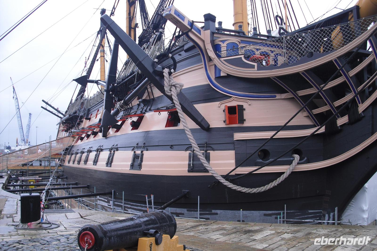 Die HMS Victory erwartete uns jetzt in Portsmouth.1765 von Stapel gelaufen, 62 m lang, 15,5 m breit, unter vollen Segeln 15 km/h entfaltend, 850 Mann Besatzung und auch doppelt so schnell beim Abfeuern der Kanonen als der französische Gegner in der Schlacht bei Trafalgar.