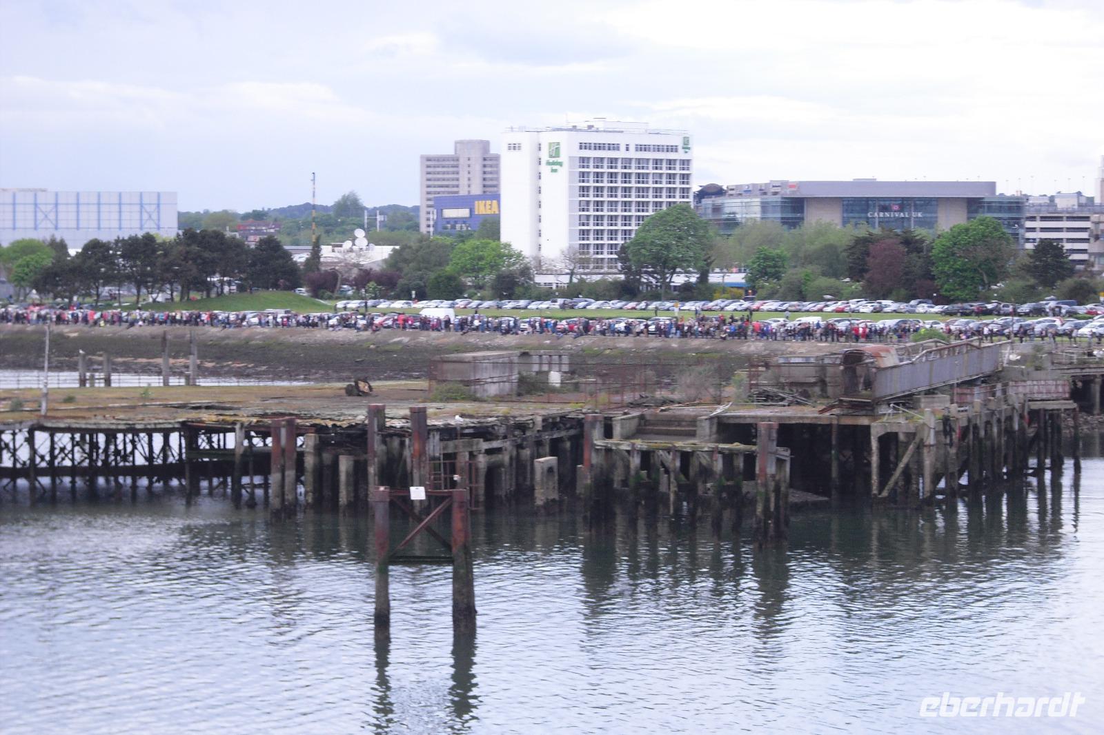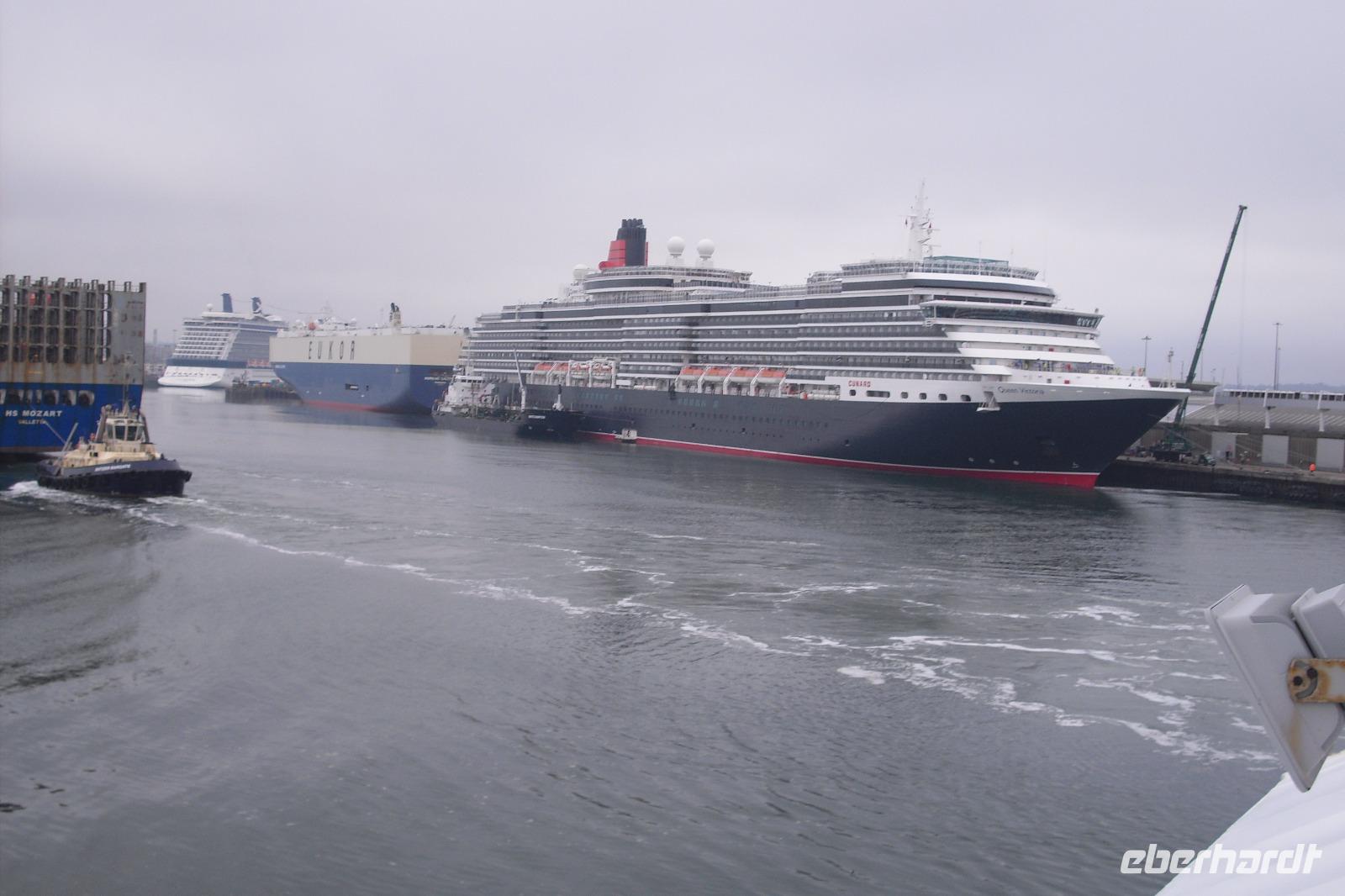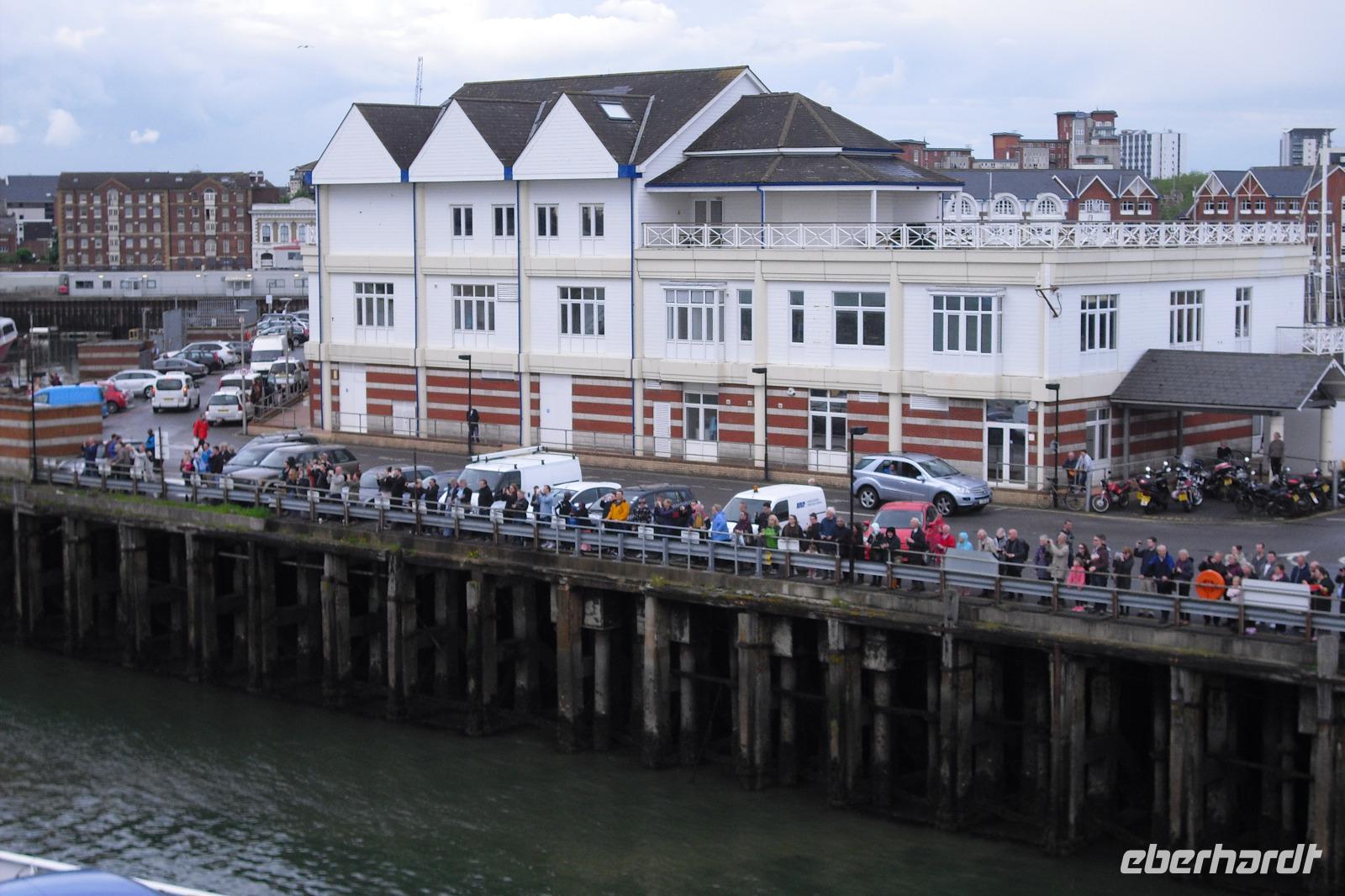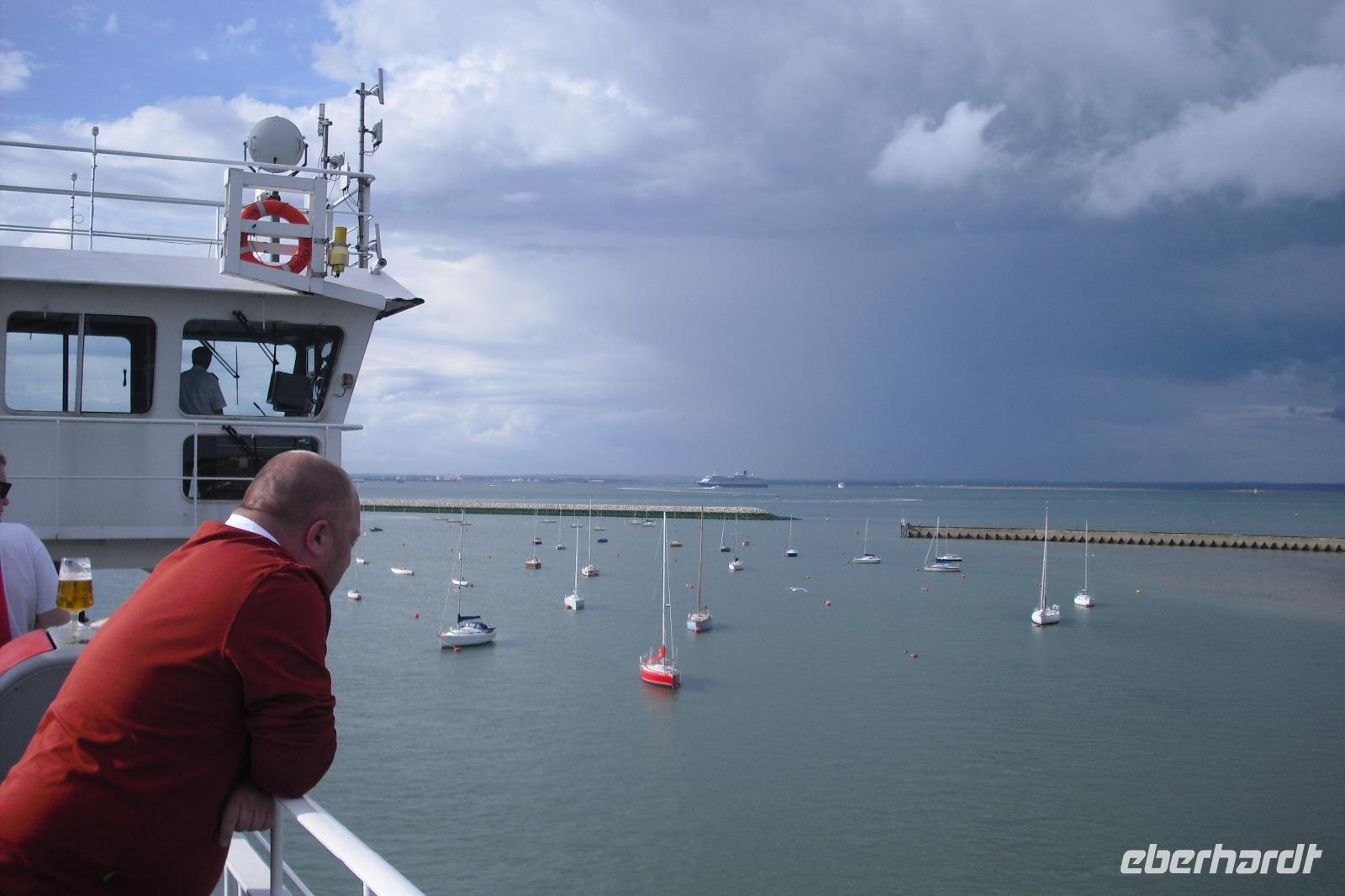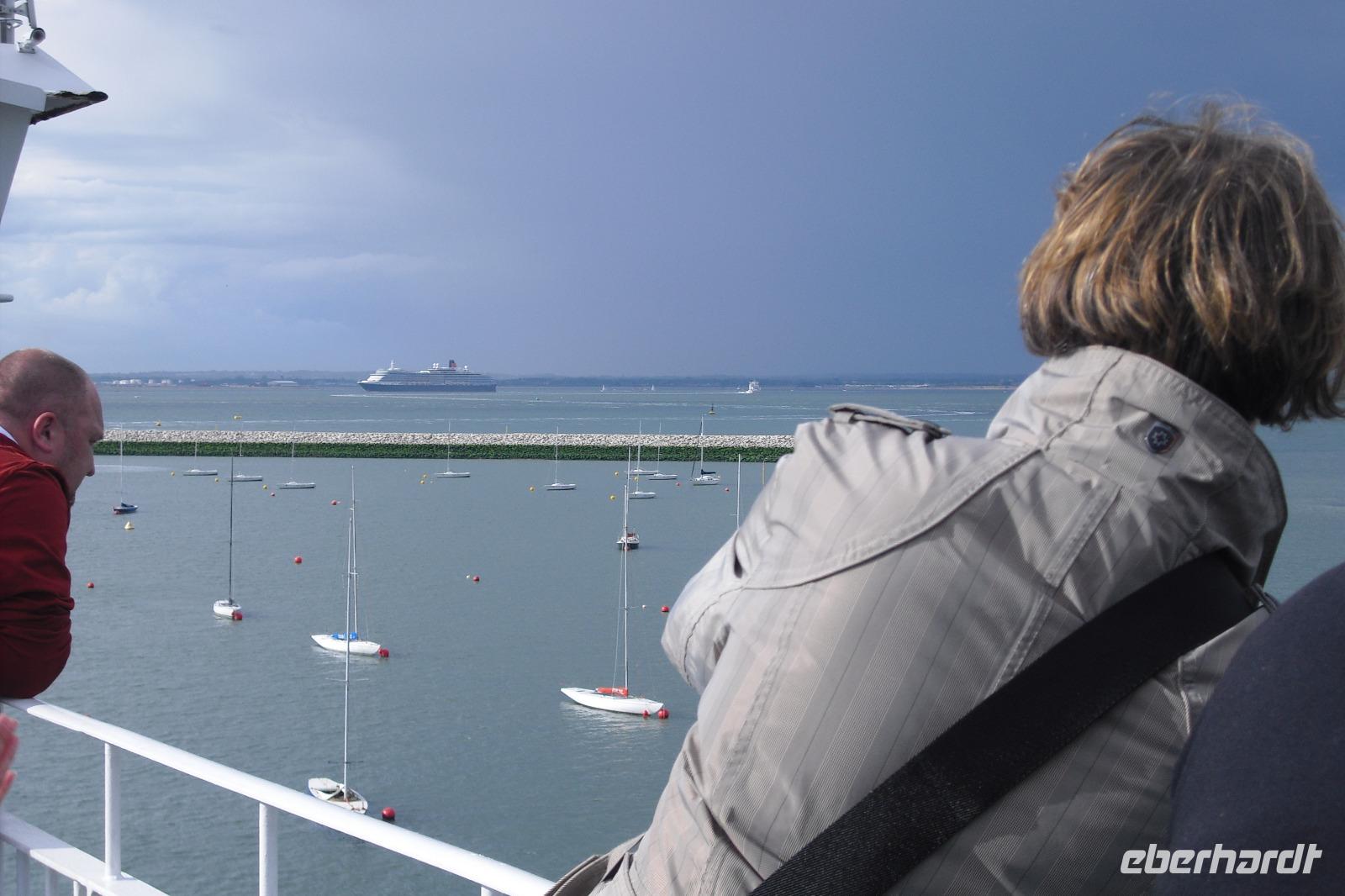 Pünktlich legte unsere Fähre ab, bekam aber dann eine Verspätung. Drei große Kreuzfahrtschiffe legten in Southampton ab und forderten Vorrang. Und dann? Ja, dann kam auch noch das zur Zeit größte Kreuzfahrtschiff - die HARMONY OF THE SEAS. Welch ein Spektakel für uns und die vielen Schaulustigen im Hafen von Southampton.