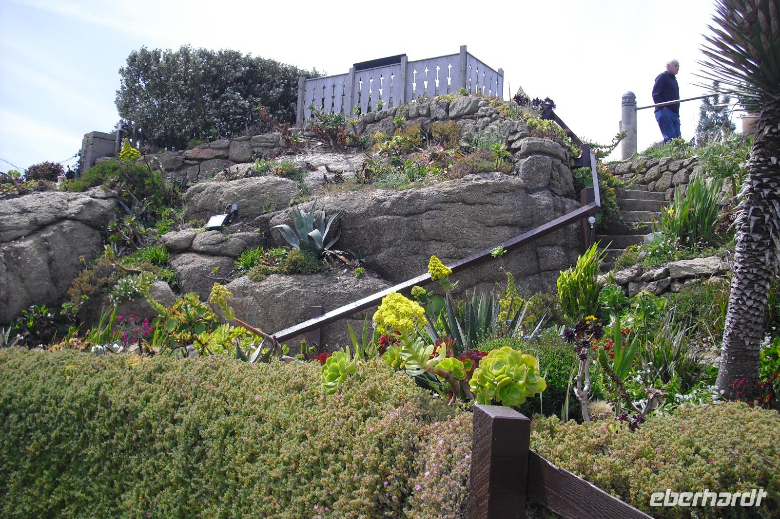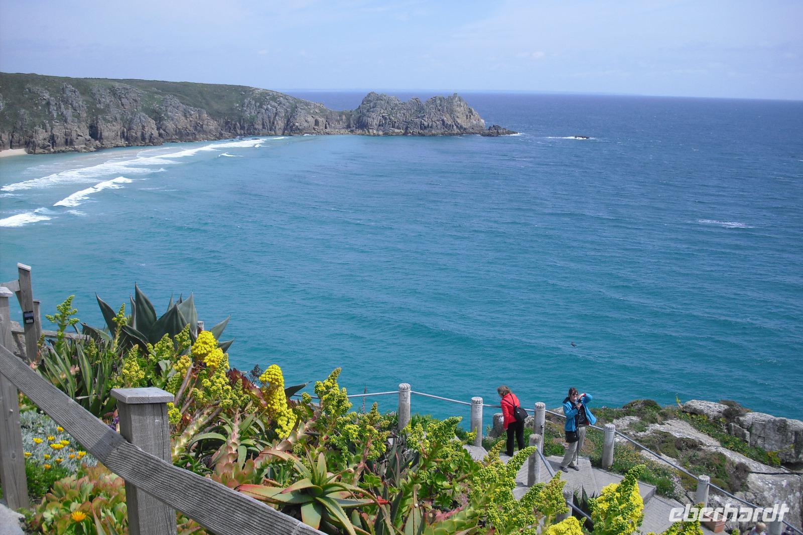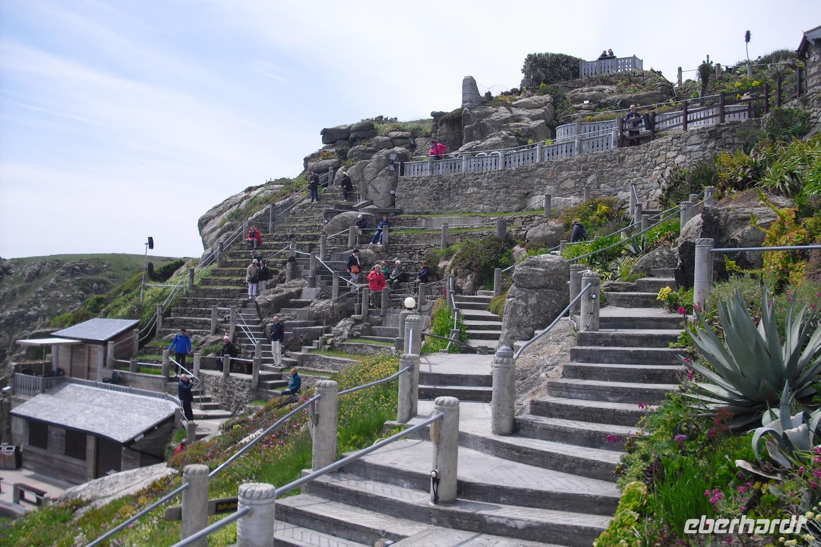 Nur etwa 5 km entfernt von Land´s End liegt Porthcurno,ein kleines Dorf mit weißem Sandstrand, einem Telegrafenmuseum und einem faszinierenden, wunderschön gelegenen Freilichttheater. Rowena Cade, Organisatorin einer kleinen Schauspielerlaiengruppe sowie Kostüm- und Bühnenbildnerin, begann eine Vision umzusetzen. 1932 eröffnete sie nach jahrelanger Arbeit das Theater mit Shakespeare`s THE TEMPEST(Der Sturm) vor vollbesetztem Haus. Wir besichtigten das außergewöhnliche, wunderschön auch mit der Bepflanzung gestaltete Theater bei herrlichem Wetter.