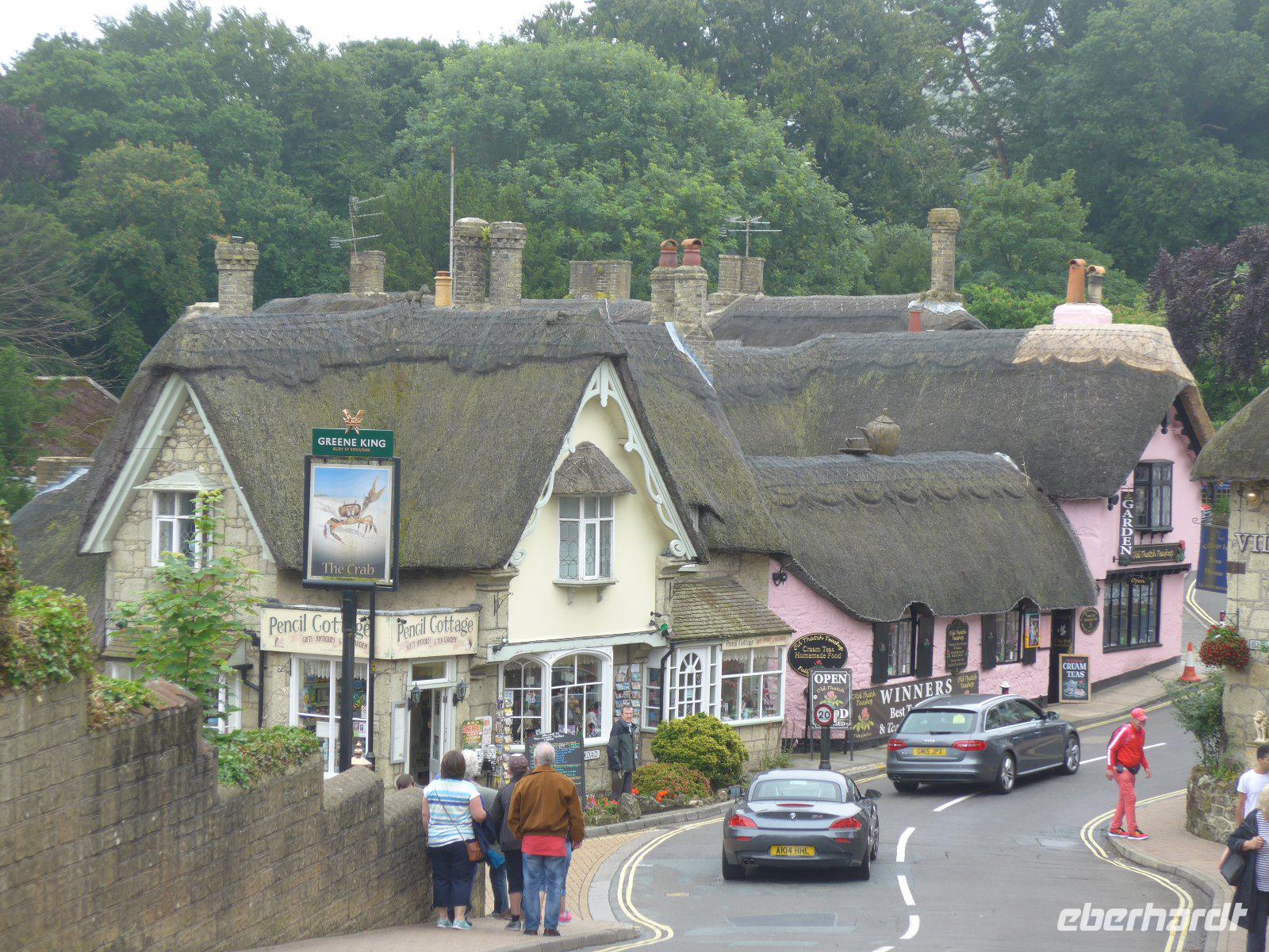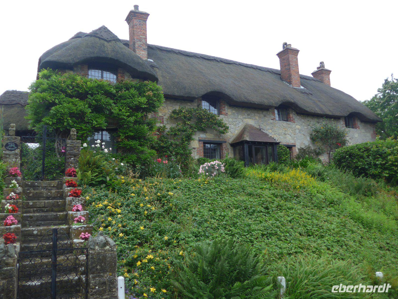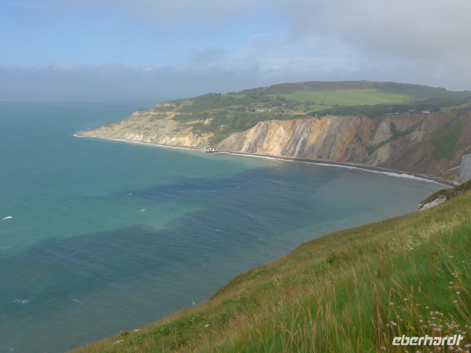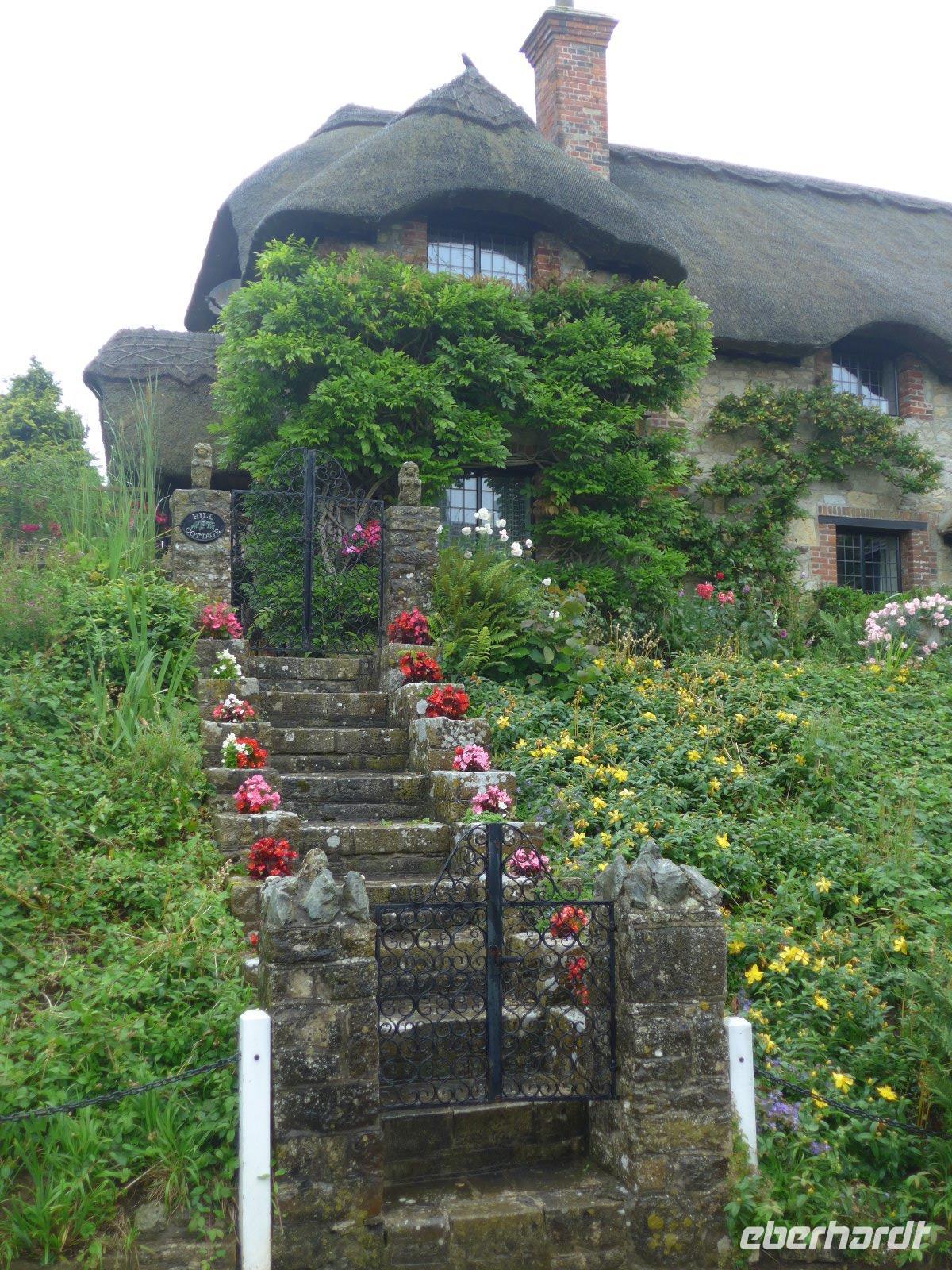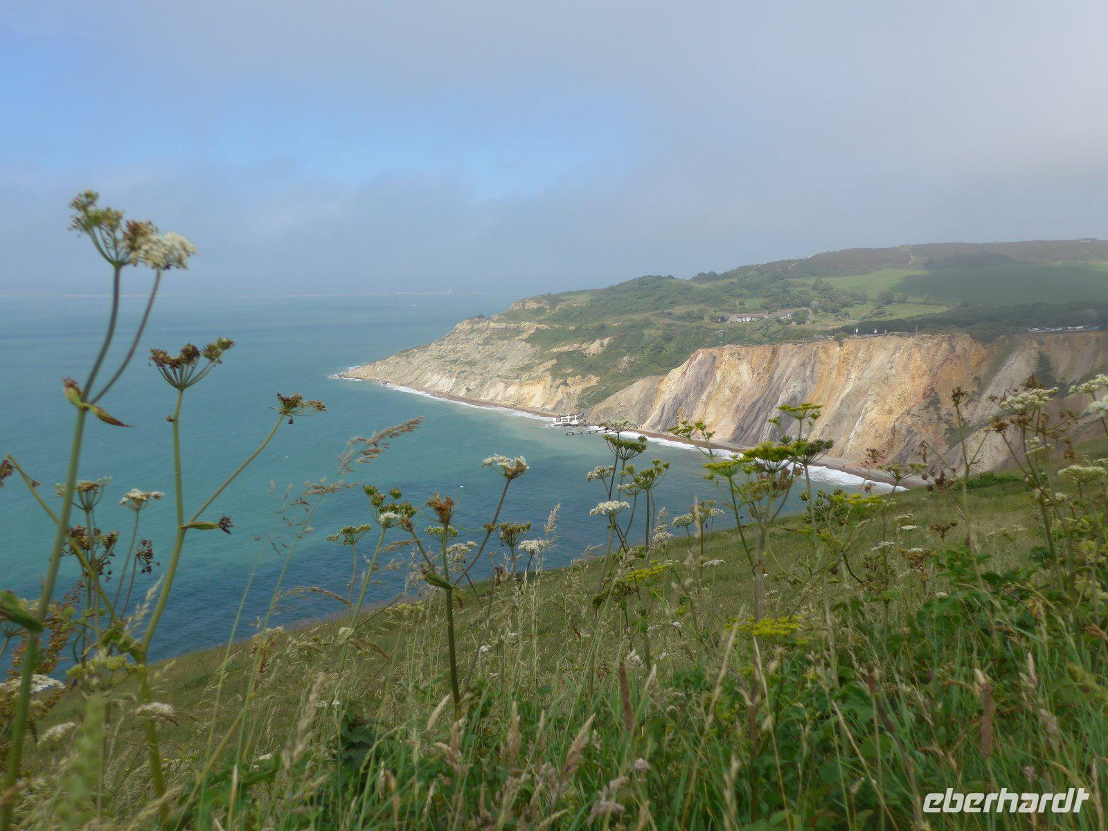 Vorbei an Ostborne House ging es in Richtung Godshill was so viel heißt wie „Gottes Hügel". In einer Zeit, als Friedrich Engels 1845 die Lage der arbeitenden Klasse in England anmahnte erwarb Königin Viktoria zusammen mit ihrem Gemahl Ostborne House. Ihnen standen zwar Windsor Castle, Buckingham Palace u. der Royal Pavilion zur Verfügung aber in ihrer „Wohnungsnot" suchten sie dennoch ein Privathaus. Als sie Ostborne House erworben hatten verglich Prinz Albert den Blick auf den Solent mit der Bucht von Neapel. Kein Wunder, dass hier schließlich eine italienische Villa mit Campanile Loggia u. Terrassengarten entstand. Innen mit viel Prunk und Plüsch und in jener Zeit wurden auch die Stile der Kolonien geplündert u. Teil der Architektur des Hauses. Kein Wunder, dass es die Liebesresidenz Viktorias war und dass diese auch hier nach 63 Regentschaftsjahren verstarb. Nur unweit von hier in der Ferne erblickten wir auf einem Hügel die Kirche der Königsfamilie in Whippingham. Nun auf der Fahrt quer über die Insel erreichten wir schließlich Godshill. Der Inbegriff eines englischen Dorfes. Es verfügt über einige der ältesten Architekturen der Insel. Auf unserem Spaziergang besuchten wir die reizvolle mittelalterliche Kirche und konnten eine Vielzahl von charmant strohgedeckten Cottages bewundern. Herrliche Fotomotive. Nun aber weiter - bald erreichten wir den Küstenort Shanklin. Schon John Keats übernachtet 1819 in Shanklin, wo er sein Buch Lamia fertigstellte und das Drama Otto the Great begann. Im Juli 1868 wohnte Henry Wadsworth Longfellow während seiner letzten Europareise hier. Ein beliebter Badeort. Seine Strohdachhäuser mit den geschnitzten Giebelrändern sind typisch viktorianisch und man findet diese nicht nur hier sondern auch andernorts auf der Insel. Erdrutsche haben hier zur charakteristischen Küstenform geführt. Manche behaupten, es sei das „englische Madeira" nur intimer u. romantischer. Nun galt es den Ort zu entdecken. Ob Spaziergang am Strand oder der Besuch der Schlucht Shklin Clip oder nur ein Spaziergang im alten Dorf. Mit vielen Eindrücken ging es dann entlang der Küste zum Höhepunkt auf Isle of Whigt den „Needles". Es sind drei aus dem Wasser ragende bizarre Kreidefelsen. Beeindruckend auch die vielfarbigen Felsformationen der Alum Bay. Im 19. Jahrhundert wurde man aus einem Besuch von Lady Cameron einer Dame aus bestem Hause überfallen und man musste für ein Foto nach ihren Wünschen still stehen. Persönlichkeiten wie Charles Darwin oder Kronprinz Friedrich von Preußen waren Opfer eines solchen Überfalls. Also Achtung vielleicht ist Lady Camerons Erben noch heute auf Suche nach Motiven? Ob mit der Seilbahn oder mit dem Bus alle trafen sich an der Old Battery, die einen wunderschönen Blick auf die Festungsanlage und die ehemalige Raketenabschußrampe bot. Auf dem Rückweg immer wieder ein herrlicher Blick auf die Alum Bay.
