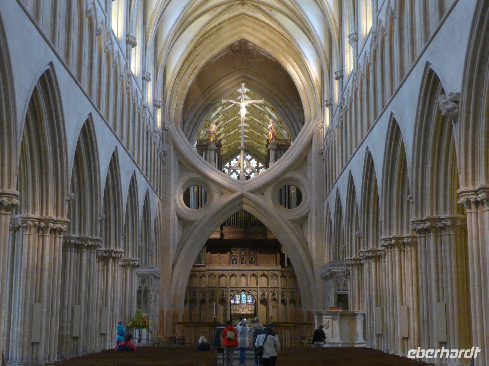 Auf dem Weg nach Bristol war Glastonbury Abbey erstes Ziel unserer heutigen Tagesetappe. Die Ruine der ehemals riesigen Abteikirche bildet den Hintergrund für die Sage von König Artus u. der Suche nach dem Heiligen Gral. Also los dem heiligen Gral u. seiner Tafelrunde, der wohl der erste u. exklusivste Herrenclub Englands war, einen Besuch abzustatten. Gestärkt und die Koffer im Bus ging es los auf dem Weg auf den Spuren König Artur. Auf dem Weg dorthin durchquerten wir das Bodmin Moor und machten vorbei an Jamaica Inn, das nach dem Cornwall-Roman der dreißiger Jahre von Daphne du Marie „Jamacia Inn" zum Filmschauplatz u. Treffpunkt der vereinten Literatur- u. Kneipenfreunde wurde. Einst wickelten jahrhundertelang hier Schmuggler ihre Geschäfte ab und Reisende machten hier Rast. Wahrscheinlich hat den Autor die Vergangenheit bei seiner Einkehr so inspiriert, dass er bei einem kühlen Schluck sofort zu schreiben begann. Nun wir sind wieder in Somerset, der ländlichsten Grafschaft. Kaum größere Städte und wenig Industrie. Dafür ist die Region wegen ihrer Käse- u. Milchproduktion und vor allem wegen des Cider bekannt. Glastonbory Abbey, einst prächtige Abteikirche wurde sie durch Heinrich VIII geplündert und ist nun Englands berühmteste Ruine. Glastonbury ist eine Kleinstadt der Superlative. Die Touristen strömen in Scharen wie einst die Pilger. Hier sollten der Ort des Grals u. das Grab König Arturs sein. Der Dorn vom Heiligen Land, der hier aus Joseph von Arimathias Wanderstab spross soll jedes Jahr blühen. Und nicht zuletzt hat hier die älteste christliche Gemeinde in England ihre erste Kirche gebaut. Da ist das jüngste Kind der modernen Kulturbewegung das jährliche Treffen der Hippies eher profan. Mythos Mittelalter trifft im wahrsten Sinne des Wortes auf Moderne. Und heute weiß man, dass die mittelalterlichen Mythen nur einem Zweck dienten - eine Finanzquelle für den Bau des abgebrannten Klosters zu finden. Ein frommer Betrug der Mönche, heute würde man eher sagen der Zweck heilt die Mittel. Nun wir betraten als „säkularisierte Pilger" des 21. Jahrhunderts die Abteikirche. Ein kleines Schild am ehemaligen Hochaltar ist der Hinweis auf den ersten frommen Betrug. Und auch fanden wir die Stelle an dem der Gral von Joseph von Arimathia vergraben sein soll, denn noch heute am Fuß des Tores ist die Blutquelle. Anschließend ging es nach Wells unweit von Glastonbury gelegen. Ganz und gar eine Kleinstadt, die winzig war und es immer bleiben wird. Eine Harmonie von Stadt und Landschaft und eine Disharmonie wenn man die Dimension der Kathedrale mit der Einwohnerzahl vergleicht. Aus diesem Blickwinkel heraus betrachtet ist es eher eine Kathedrale zu deren Füßen ein paar Häuser sich gesellen. Am Parkplatz sahen wir eine Kirche - war das schon die Kathedrale? Nein unser Rundgang begann an der Stadtpfarrkirche St. Cuthbert's. Im Inneren mit einem überreich geschnitzten u. bemalten Dachstuhl. So wollten die Bürger der Macht des Bischofs etwas entgegensetzen. Im Folgenden sahen wir dann noch den Market Place, Bishop Place Bishop's Tythe Barn, Palace Field, Vicar Close die früheste vollständig erhaltene Reihenhaussiedlung und schließlich Wells Cathedral Clock und die Kathedrale selbst. Mächtig und imposant überlebte sie nur eine Vernichtung Heinrich VIII, weil sie keine Klosterkirche war. Die Westfassade wirkt wie ein aufgeklappter Flügelaltar. Keine andere Kirche ist so reich mit Skulpturen bestückt wie diese. Von den einst 500 Skulpturen sind heute noch über 300 erhalten. Heilsgeschichte u. Welttheater in einem; mit Königen u. Tyrannen, Szenen aus dem alten u. neuen Testament, sowie oben thronend Christus in der Glorie. Durch verschiedene Bauabschnitte sind auch unterschiedliche Stilphasen erkennbar. Normannischer Übergangsstil, Early English, Zeit des Decorated u. Perdendicular. Die Wells Cathedral ist dennoch ein hervorragendes Beispiel der englischen Sondergotik. Als erste Kirche in England greift sie den Spitzbogen als gotisches Motiv überall auf. Im Inneren fällt sofort eine monströse acht ins Auge, die zwar extravagant aussieht aber dennoch nur wegen statischen Gründen angebracht wurde. Über ein Meer von Treppen vorbei am Mönch als Konsolenfigur kommen wir in den Kapitelsaal, der durch seine fächerartige Deckenkonstruktion den Betrachter in Staunen versetzt. Ein Raum wie ein Gedicht das zum Triumph der Geometrie u. Architektur erzählt wird. Noch schnell die Bibliothek mit ihren alten Büchern besucht u. zum Abschluss noch den Apfeldieb als Relief dargestellt entdeckt. Zufrieden konnte man in einem Kaffee die Abfahrt nach Bristol noch überbrücken. Und schon war die Zeit heran und wir verließen den heiligen Ort und machten uns auf den Weg nach Bristol und zum Hotel.