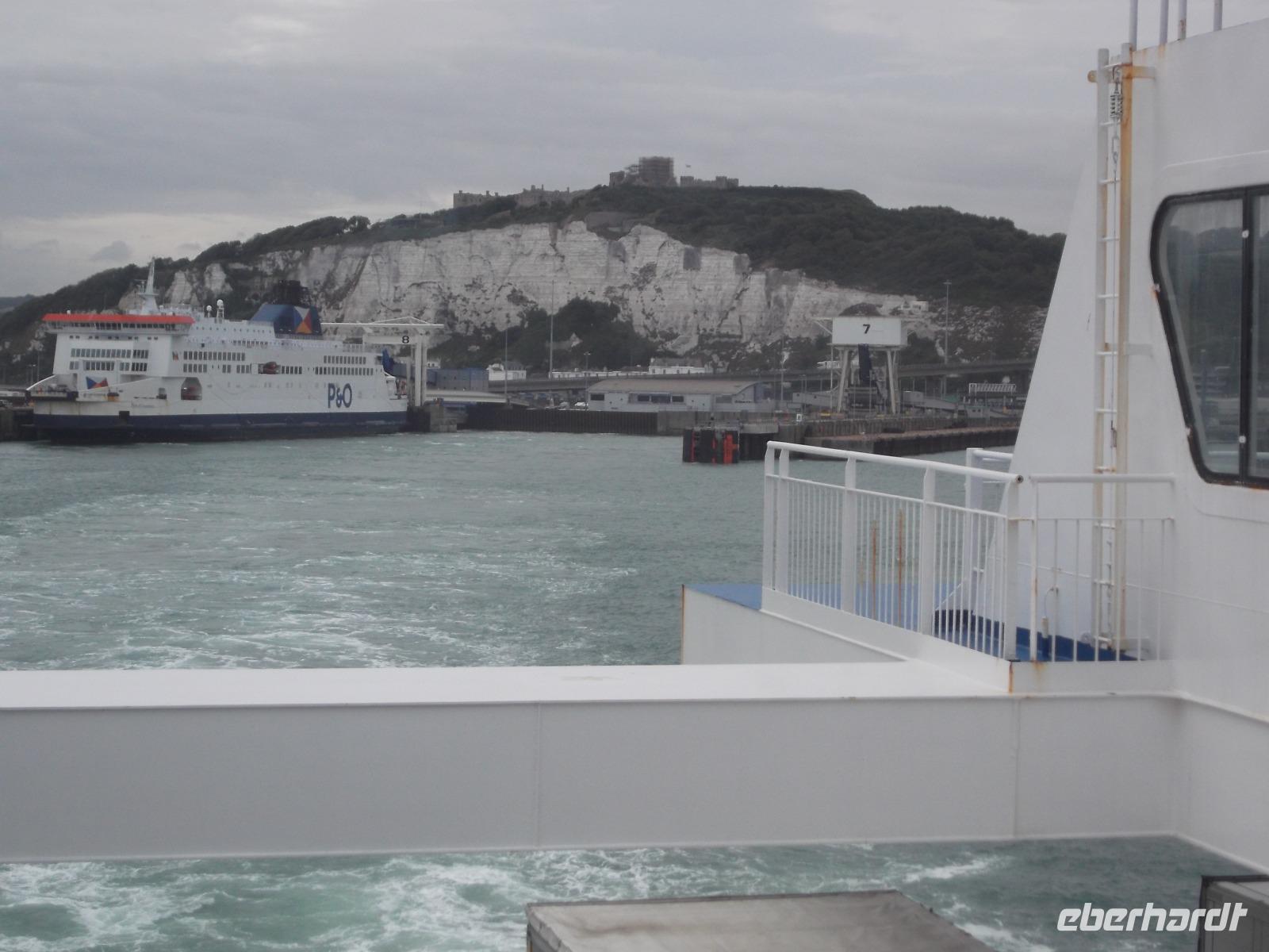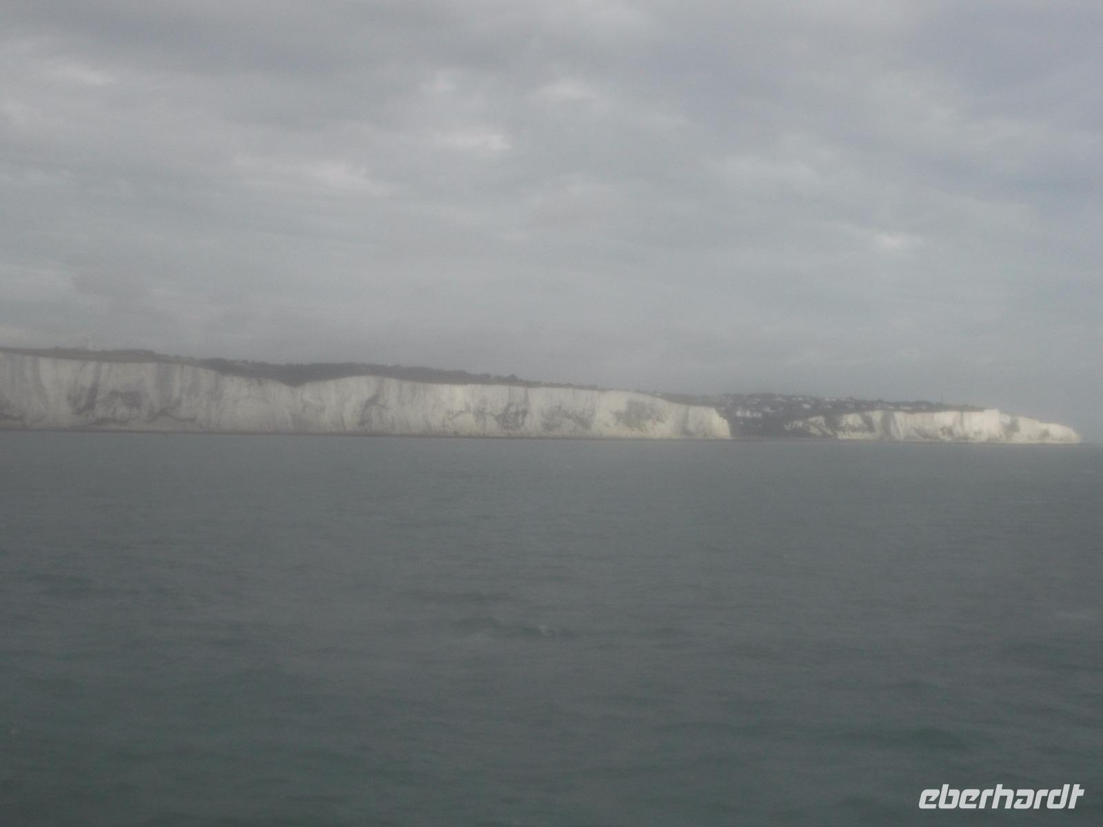 Heute früh brachen wir pünktlich auf zum Hafen, denn bevor wir hier das Schiff erreichen konnten, waren noch Kontrollen zu passieren. Alles lief hier jedoch wie immer mit gewohnter Präzision und recht schnell ab, so dass wir uns wenig später auf dem Fährschiff der DFDS einschiffen konnten. Pünktlich legte die Fähre ab, die gut eineinhalb Stunden unterwegs sein würde. Recht windig und auch etwas trübe war es während der Überfahrt, aber wenigstens empfing uns nicht das nasskalte Wetter, das der großen Insel so gern nachgesagt wird. Schon auf dem Schiff hatten wir die Uhren eine Stunde zurückgestellt und erreichten - schon der britischen Zeit angepasst - die Kreideküste, der England seinen antiken Namen „Albion" (die Weiße) verdankt.