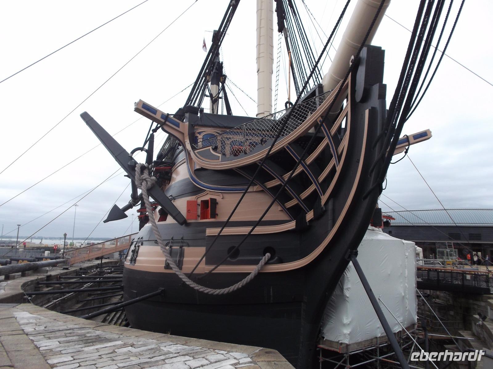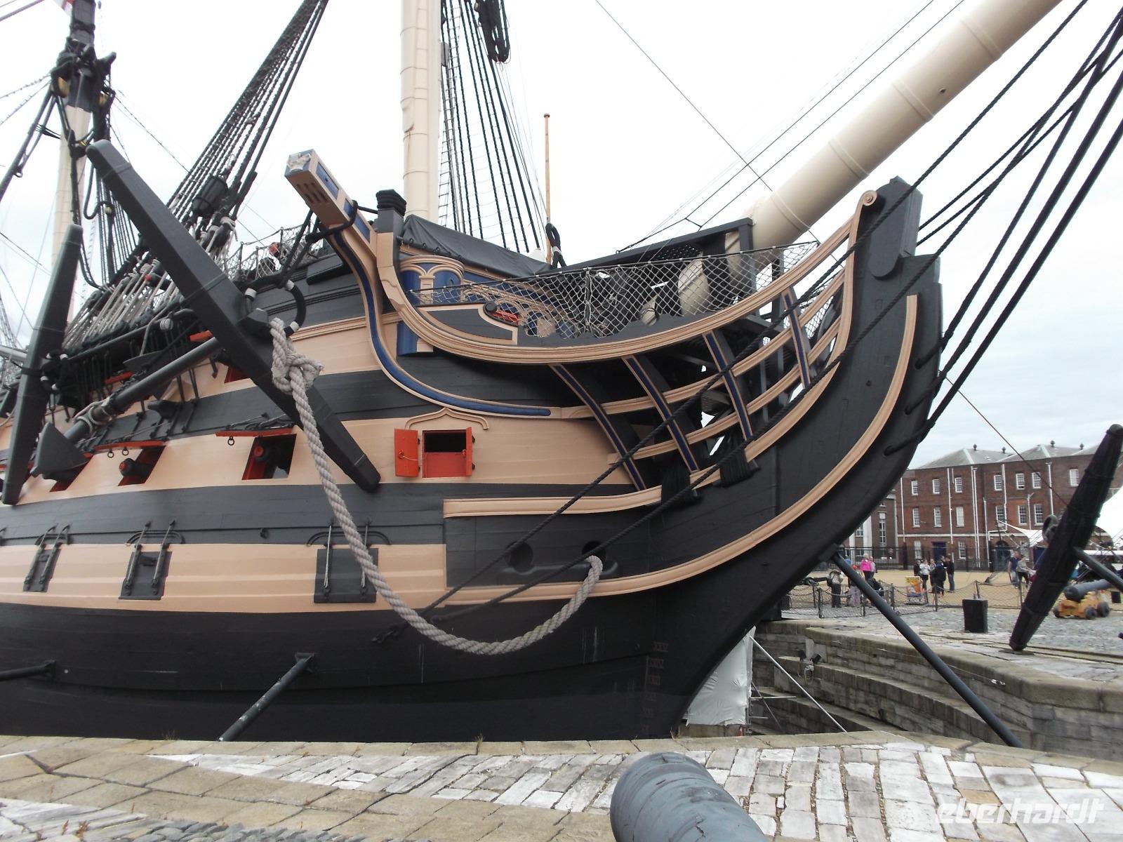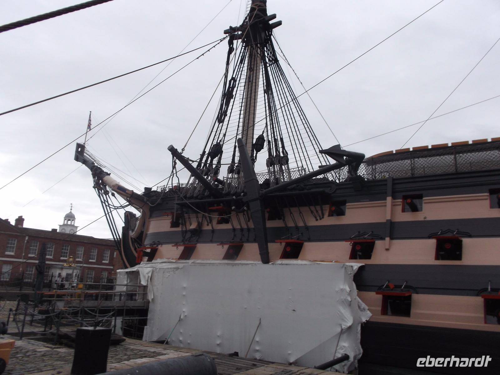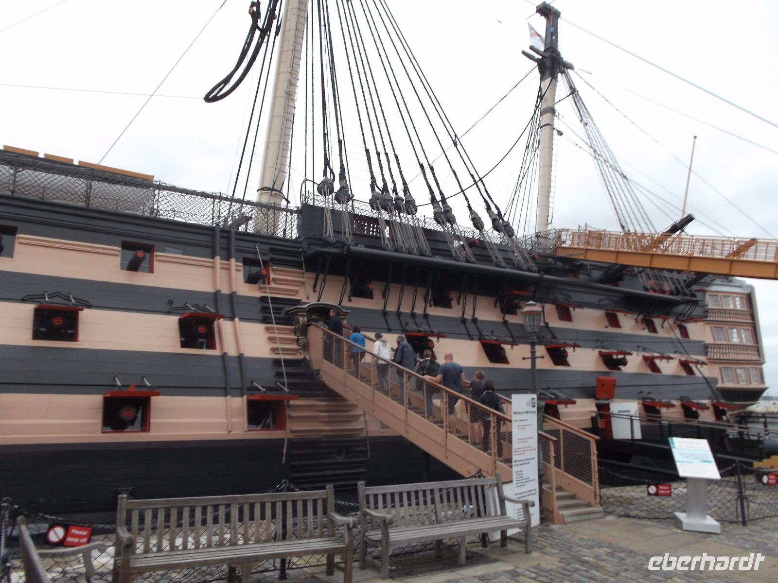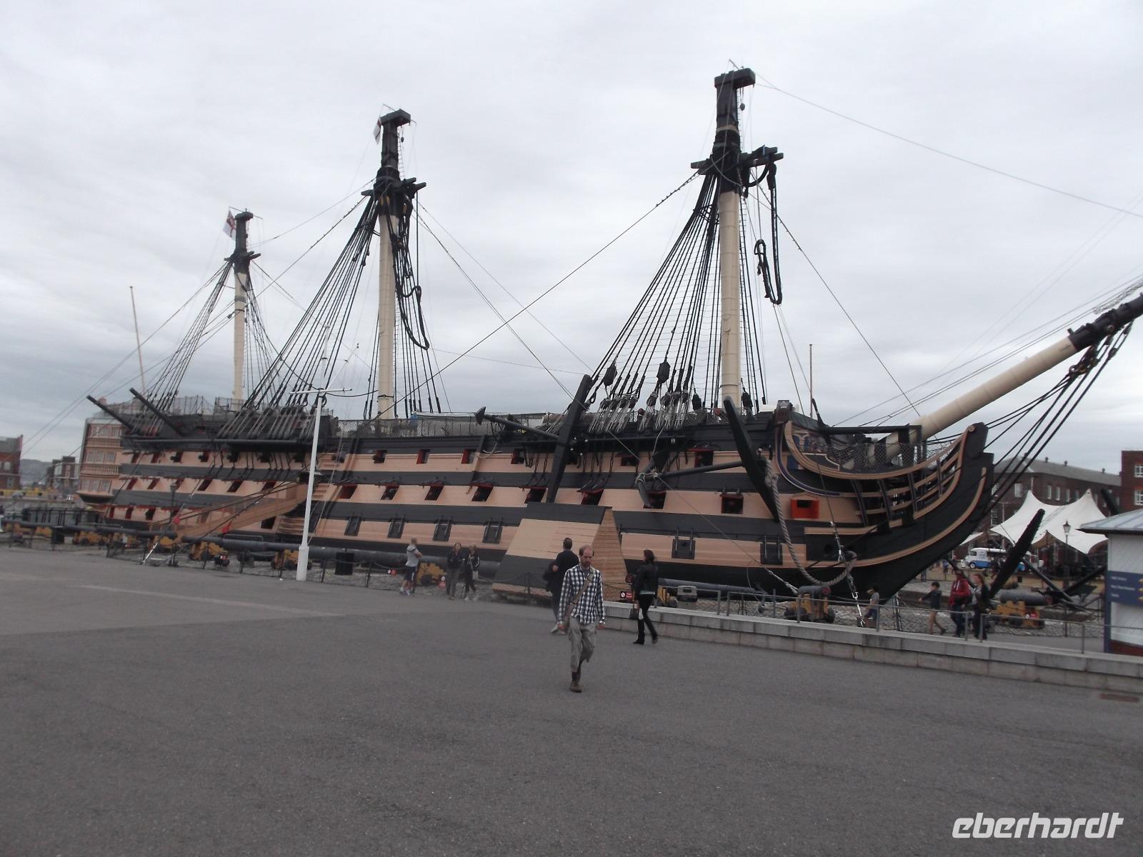 So verwundert es nicht, dass auch unser Ziel „militärisch" war - wir besichtigten die historische Marinebasis, von der ein Teil für Ausstellungen in Marinemuseen und von Kriegsschiffen hergerichtet ist. Der Stolz der Königlich-britischen Marine ist hier zu sehen: das Flaggschiff von Admiral Lord Nelson, der der britischen Flotte zum Seesieg gegen Napoleon in der Schlacht von Trafalgar 1805 verhalf. Die HMS „Victory" ist ein bereits 1765 in Dienst gestelltes Linienschiff (wegen der in mehreren Etagen angeordneten „Schiffs-Artillerie-Linien" so genannt), das einst über 104 Kanonen verfügte. Mit über 70 m Länge und 850 Mann Besatzung war es eines der größten Kriegsschiffe seiner Zeit. Kurios ist, dass die „Victory" heute noch als „aktiv im Marinedienst" geführt wird und damit wohl das älteste offiziell in Dienst befindliche Kriegsschiff der Welt sein dürfte. Wir konnten dieses beeindruckende Schiff besichtigen, denn es dient nun vor allem als Museum. Eindrucksvoll erhält man hier eine Einführung in die Lebensbedingungen englischer Seesoldaten des 19. Jahrhunderts sowie interessante Einblicke in Schiffsbau und Geschichte des Seekriegs.