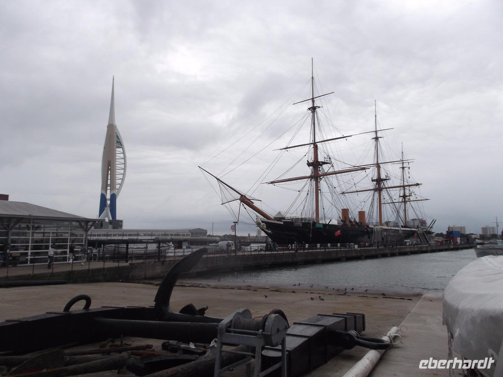 Nach dem Aufenthalt in Arundel brachen wir auf in eine der bedeutendsten britischen Hafenstädte. Portsmouth ist traditionell Militärhafen - und das eigentlich ungebrochen seit dem 16.Jh., seit der Herrschaft Heinrichs VIII. Heute hat die 200.000-Einwohner-Stadt nichts von ihrer Bedeutung verloren - der Marinestützpunkt Portsmouth ist der wichtigste militärische Hafen Europas, in dem fast die Hälfte aller Schiffe der Royal Navy - der Königlichen Marine - stationiert ist. Sämtliche Flugzeugträger, über die das Vereinigte Königreich verfügt , ein U-Boot Trainingszentrum und das Marine-Hauptquartier befinden sich hier