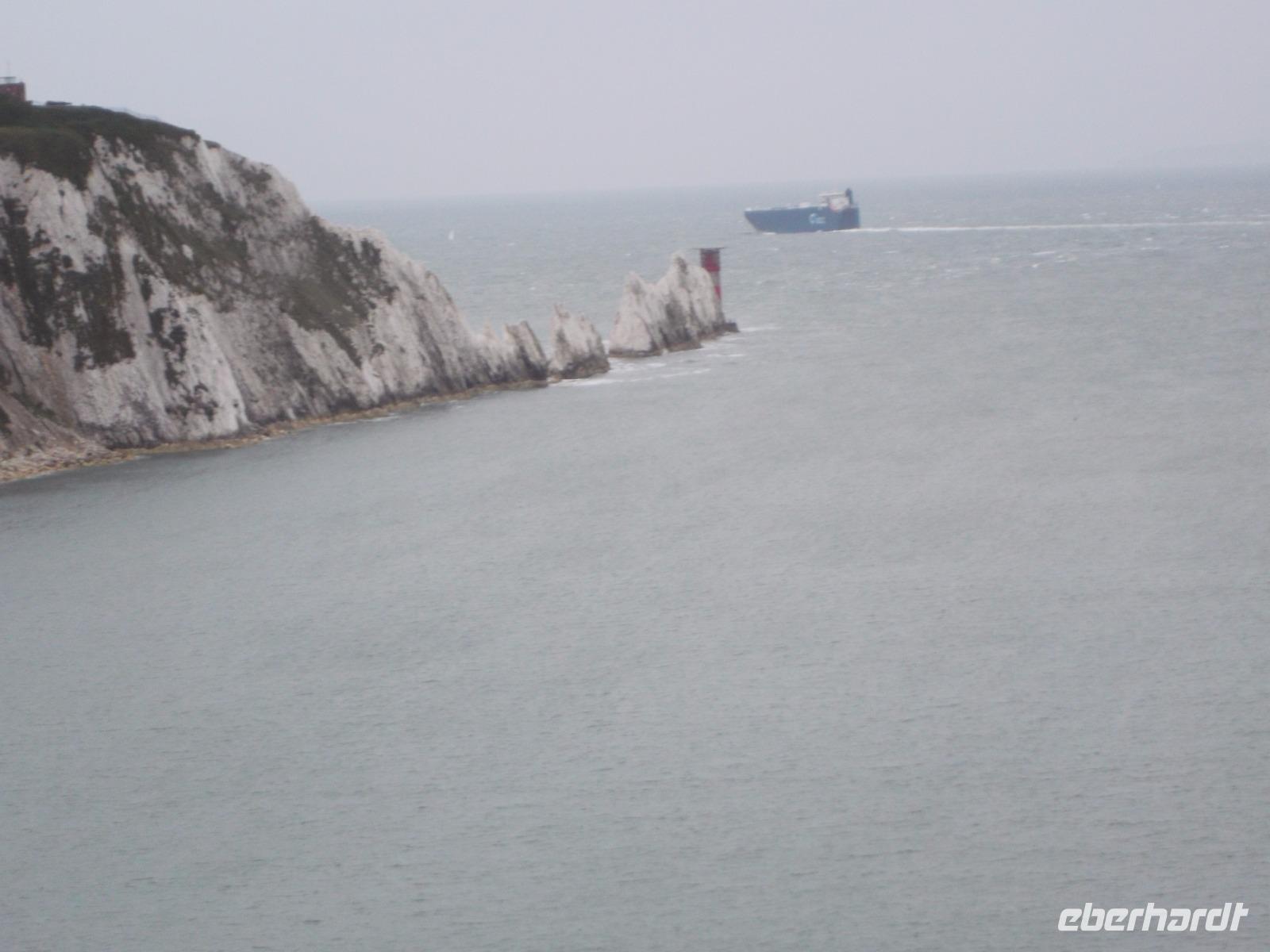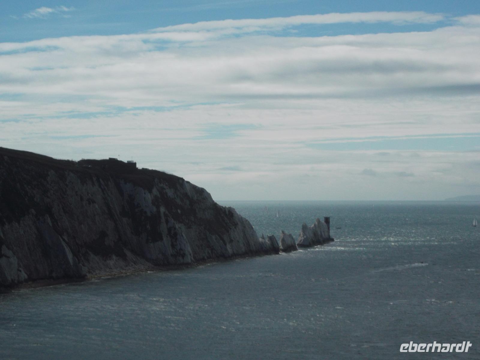 Am Nachmittag ging es an der Südseite der Insel entlang zu einer ihrer bedeutendsten Sehenswürdigkeiten. Ganz im Westen von Wight liegen die Alum Bay und die Freshwater Bay, getrennt durch einen weit ins Meer reichenden Kreidefelsen, der in die bizarre Formation der „Needles" übergeht. In natürlicher Dramatik ragen mehrere drei- und viereckige bis etwa 30 m hohe Kreidefelsen aus dem Wasser, mit spektakulär vorgelagertem Leuchtturm und verlängern so die Landzunge. Der volkstümliche Name „Needles" - Nadeln - hat sich über die Zeiten eingebürgert. Sie zählen zu den außergewöhnlichsten und malerischsten Sehenswürdigkeiten Südenglands. Einst nannte sie der zeitweilig hier lebende Dichter Alfred Lord Tennyson „Versteinerte Segel" und viel treffender kann man sie wohl nicht beschreiben...