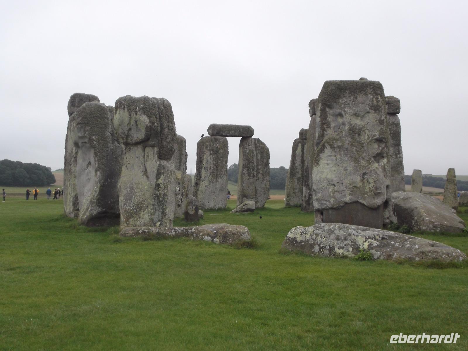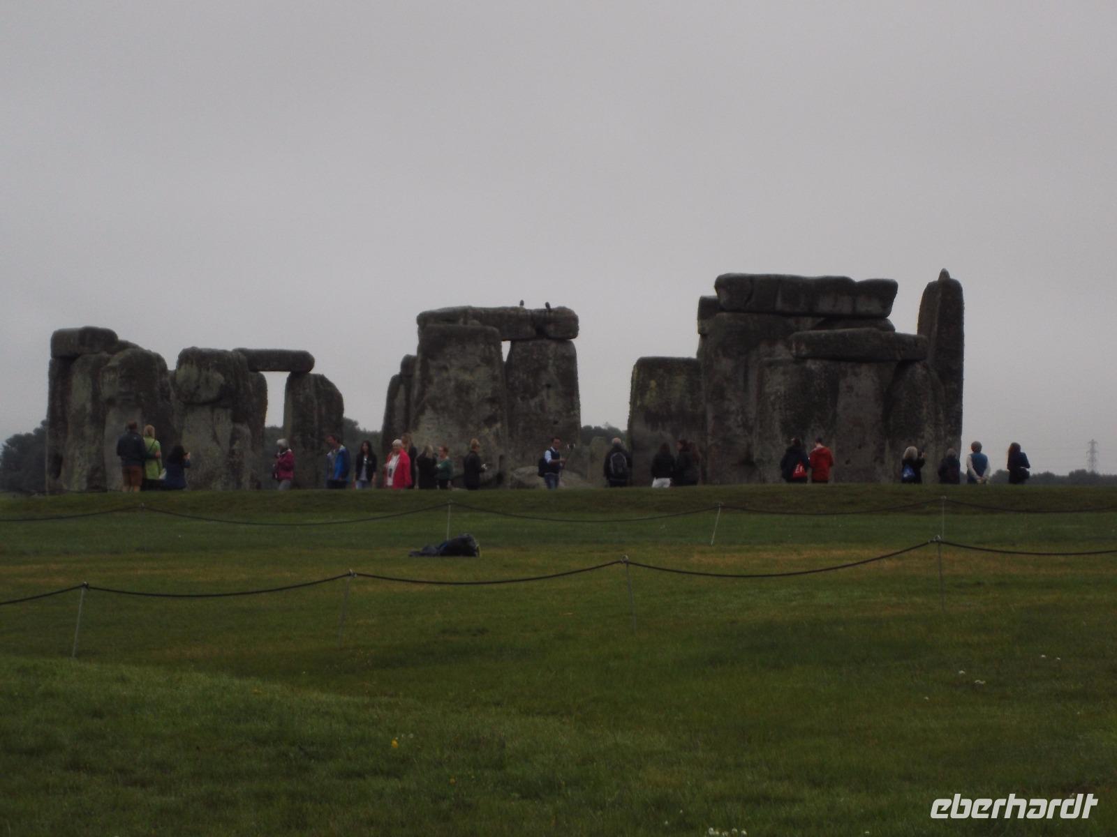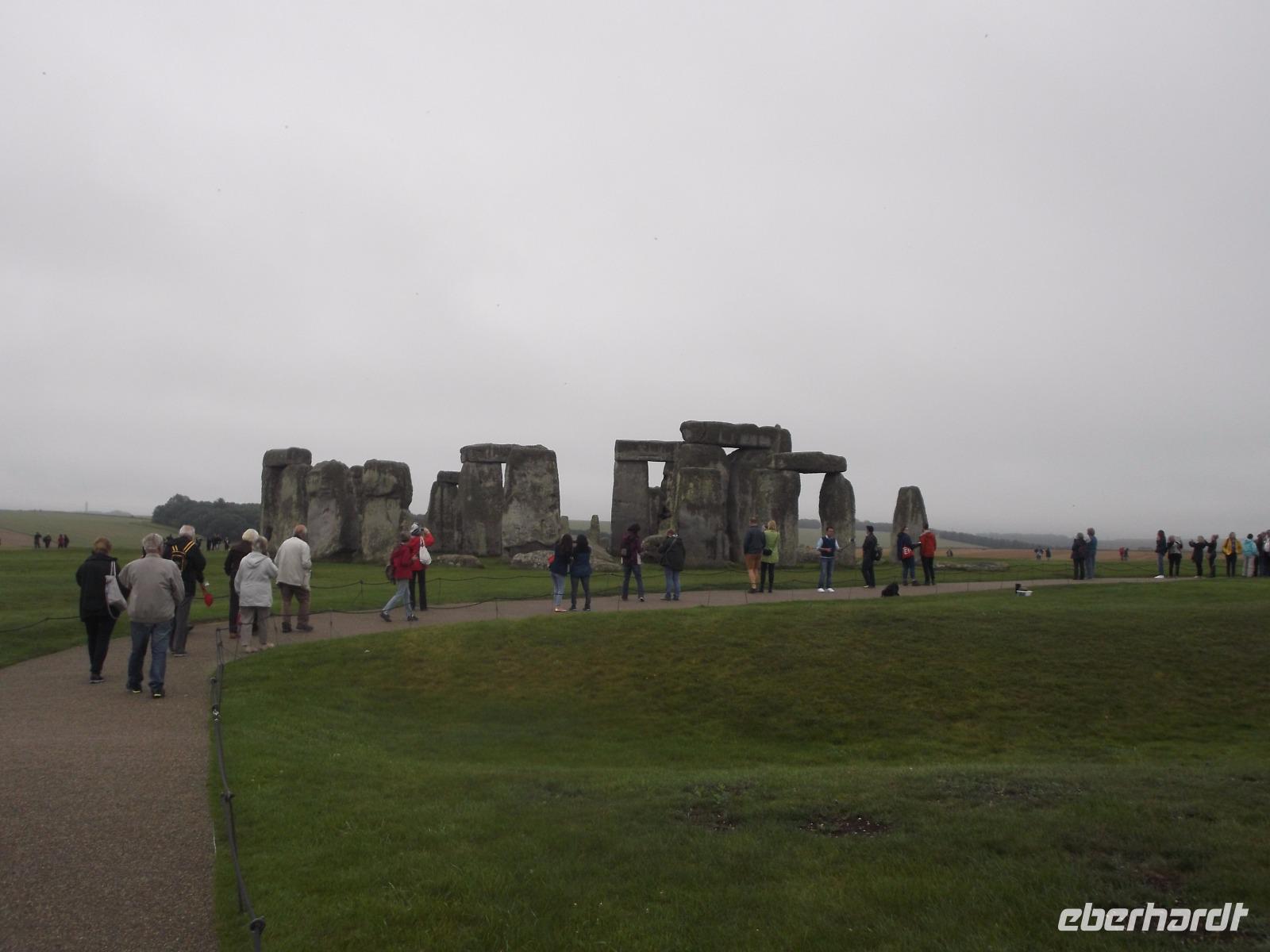 In der Stein- und Bronzezeit entstanden derartige Anlagen - stehende Steine (Menhire), Großsteingräber (Dolmen) oder Steinreihen (Alignrements) und Steinkreise (Cromlechs), die man im Begriff der „Megalithkultur"- Kultur der großen Steine - zusammenfasst. Sie finden sich fast überall in Europa, der Inbegriff des Großsteinmonuments aber ist hier, ist Stonehenge. Ein modernes Besucherzentrum sorgt heute dafür, dass sich der Besuchertrubel zunächst entfernt vom Monument abspielt - um es zu schonen und die Masse der Touristen zu „kanalisieren" Mit einem Bus-Shuttle wurden wir von hier zu den Steinriesen gefahren, zwischen denen man zwar nicht mehr herumlaufen darf, um sie ganz aus der Nähe zu betrachten, aber um die herum ein Rundweg angelegt wurde, um sie aus der Entfernung ungestört zu sehen und zu fotografieren.