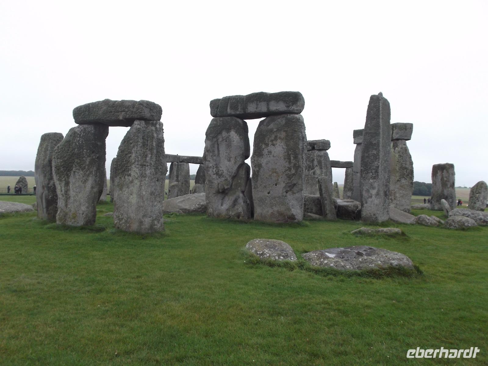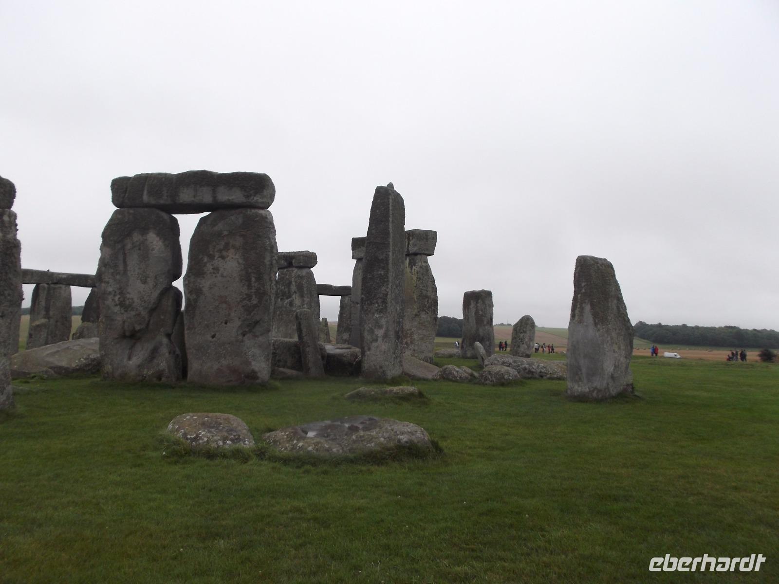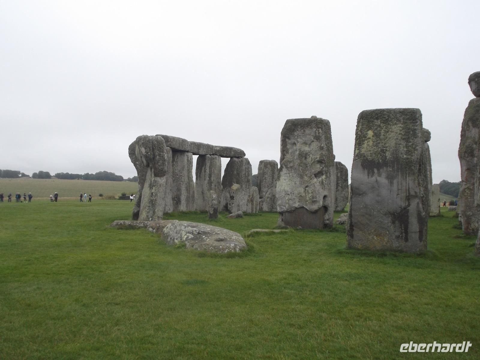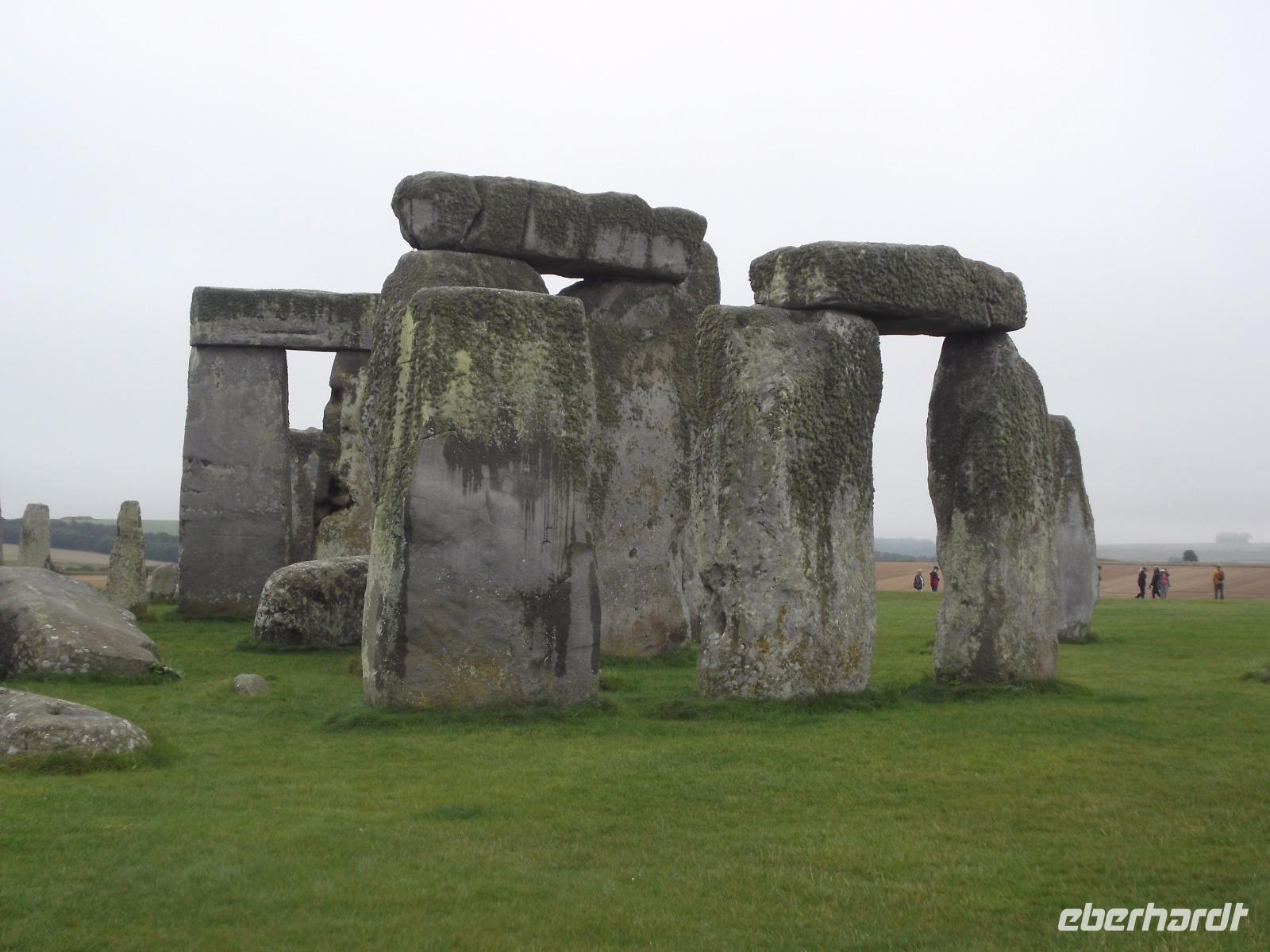 In der Stein- und Bronzezeit entstanden derartige Anlagen - stehende Steine (Menhire), Großsteingräber (Dolmen) oder Steinreihen (Alignrements) und Steinkreise (Cromlechs), die man im Begriff der „Megalithkultur"- Kultur der großen Steine - zusammenfasst. Sie finden sich fast überall in Europa, der Inbegriff des Großsteinmonuments aber ist hier, ist Stonehenge. Ein modernes Besucherzentrum sorgt heute dafür, dass sich der Besuchertrubel zunächst entfernt vom Monument abspielt - um es zu schonen und die Masse der Touristen zu „kanalisieren" Mit einem Bus-Shuttle wurden wir von hier zu den Steinriesen gefahren, zwischen denen man zwar nicht mehr herumlaufen darf, um sie ganz aus der Nähe zu betrachten, aber um die herum ein Rundweg angelegt wurde, um sie aus der Entfernung ungestört zu sehen und zu fotografieren.