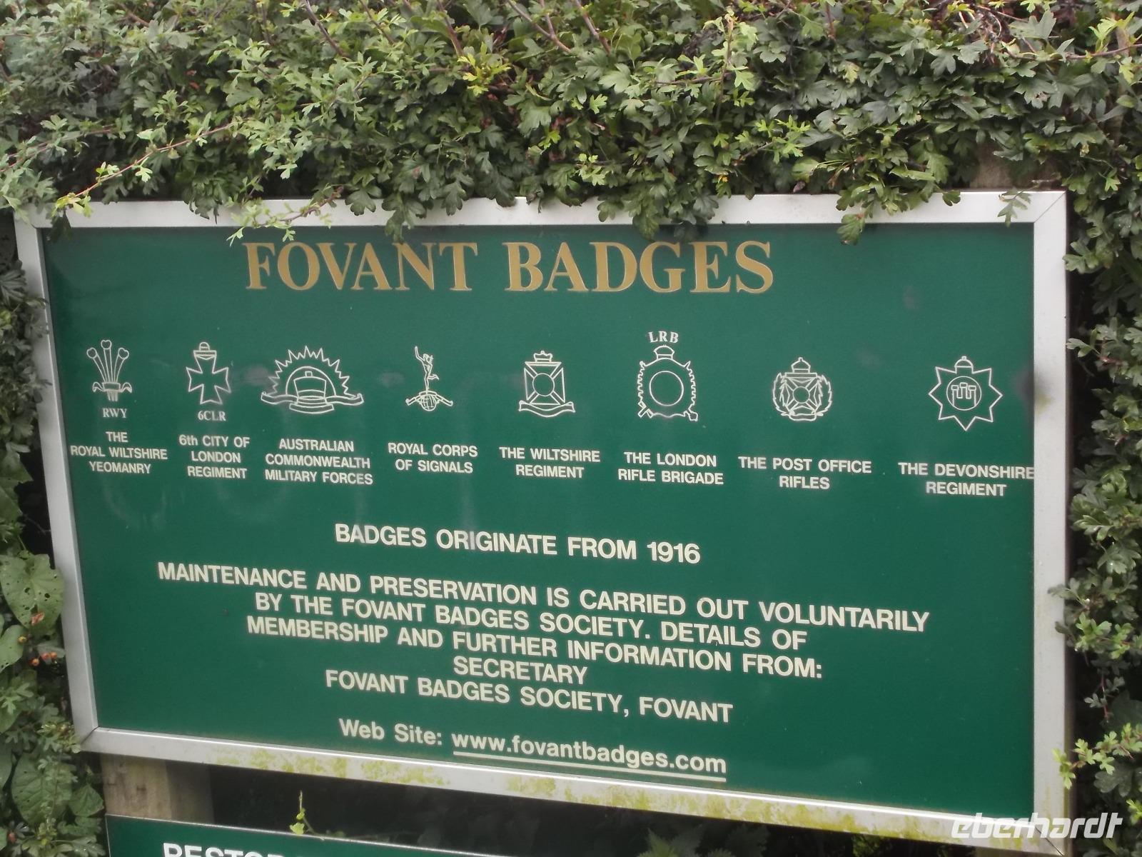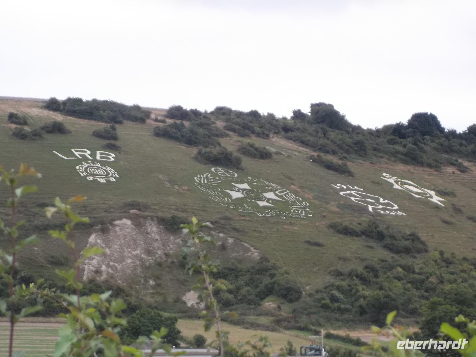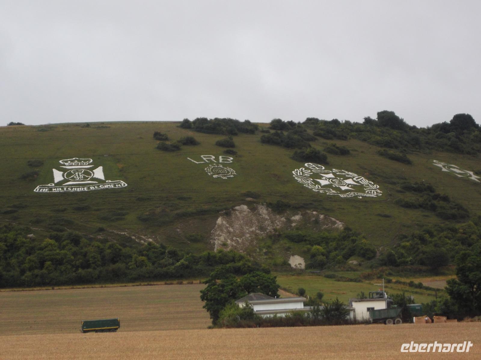 Unterwegs in Richtung Exeter legten wir noch einen Stopp inmitten der Hügel von Wiltshire ein, jener südenglischen Grafschaft, die bekannt ist für die „Hügelfiguren" an den grünen Hängen. Durch Wegkratzen der dünnen Rasendecke auf den Hügeln, die meist aus hellem Kalkstein bestehen, haben die Bauern schon seit Jahrhunderten weithin sichtbare Bilder und Figuren, vorzugsweise Pferde, an den Hügeln geschaffen. Eine solche „Wiesenzeichnung" - allerdings jüngeren Datums - sind die Abbildungen von Abzeichen wichtiger Armee-Einheiten. Wir fotografierten erstaunt und verblüfft diesen interessanten und seltenen Anblick.