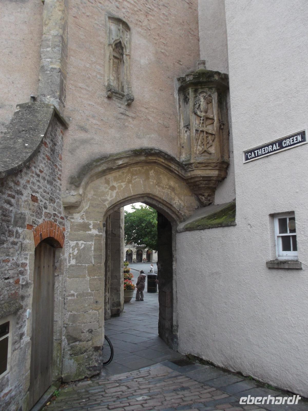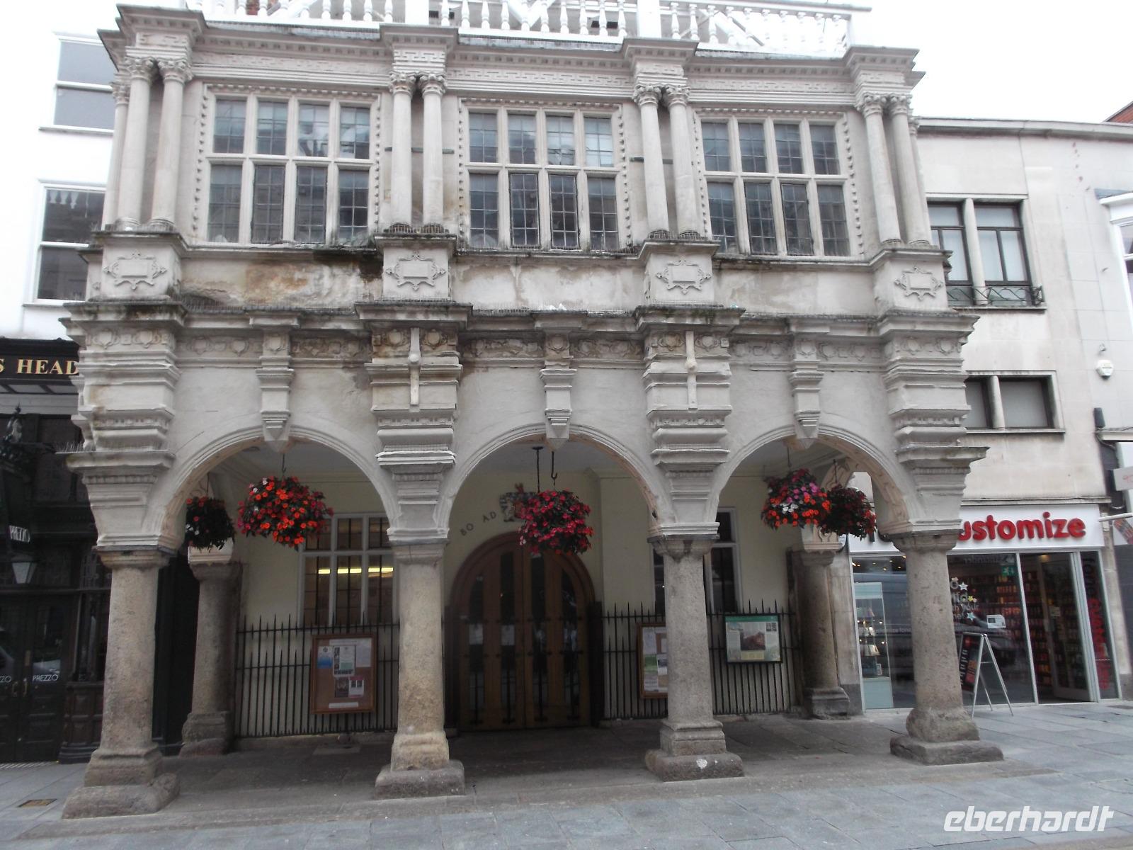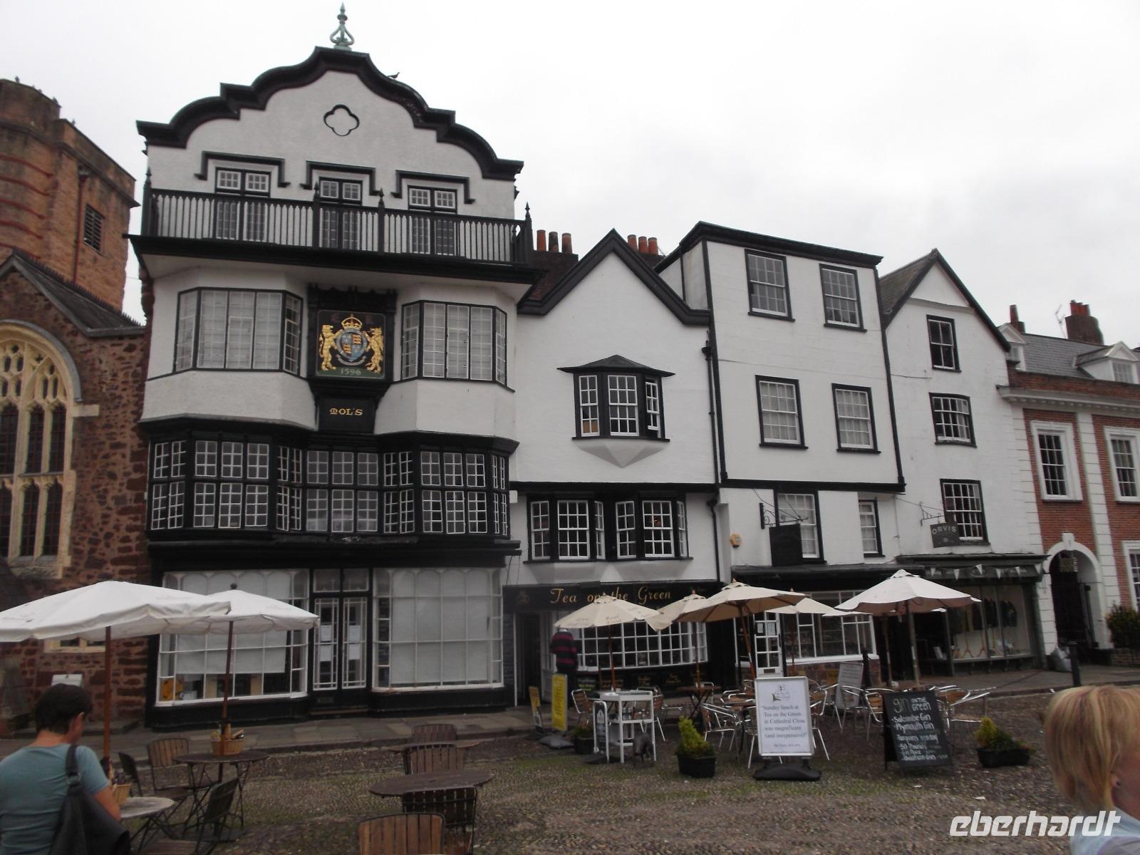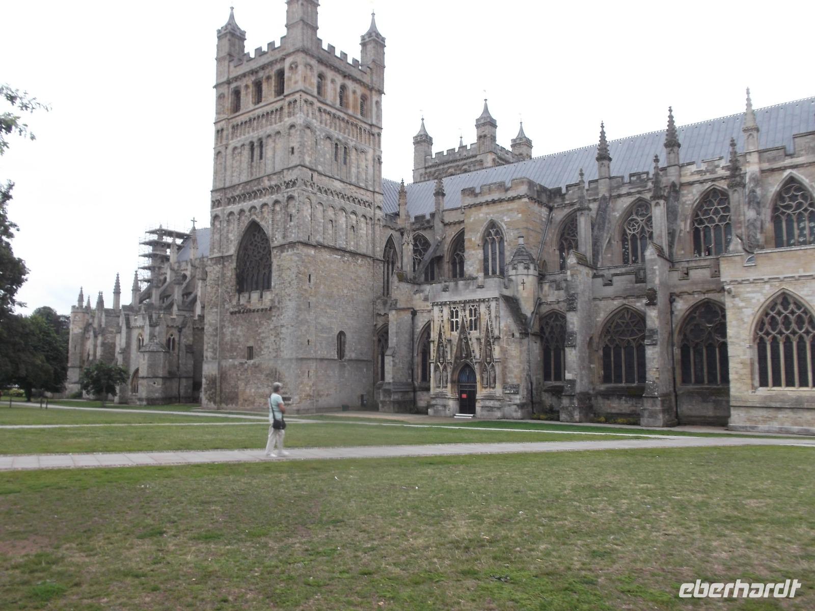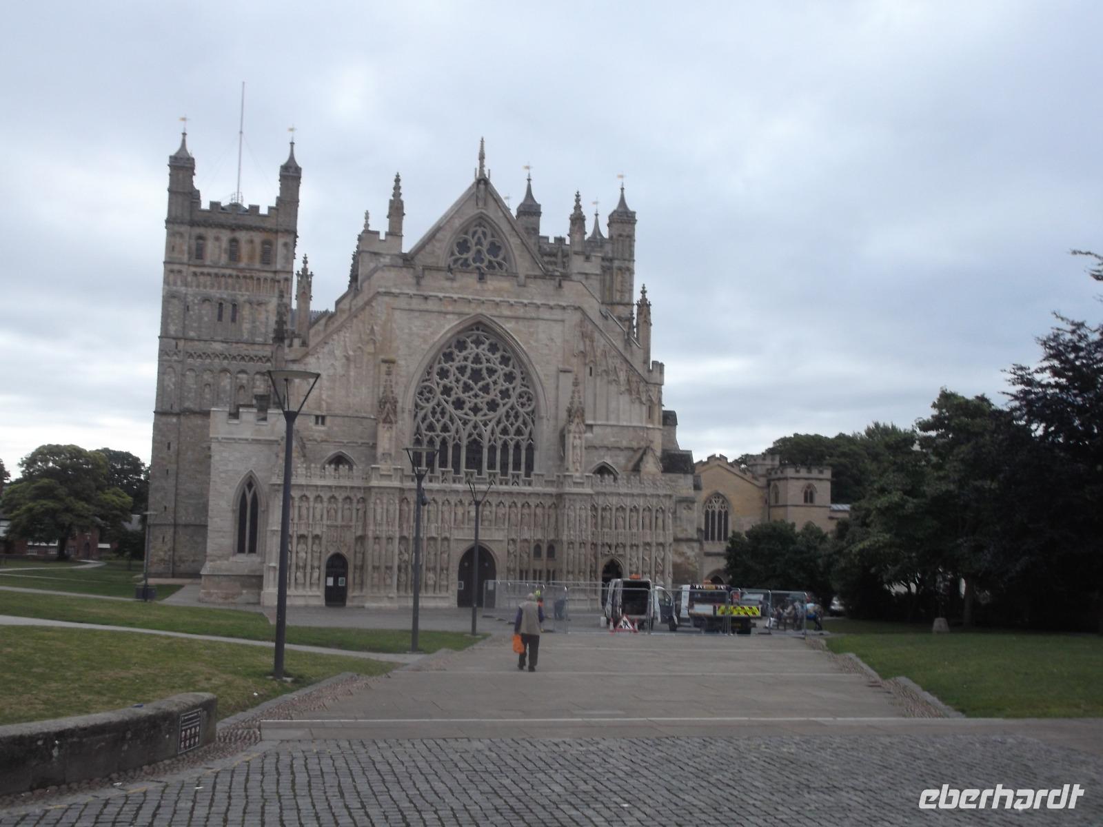 Unser Hotel lag gümnstig, so dass wir von hier zu Fuß aufbrachen zu einem kleinen Stadtrundgang durch die Innenstadt von Exeter. Die erstaunliche Kathedrale vereint Wuchtigkeit - vielleicht aus ihrem Baubeginn in normannisch-romanischem Stil - mit der Pracht ihrer Vollendung in der Gotik, die ihr auch eine recht einzigartige, wie ein Schnitzaltar wirkende, vorgelagerte Schaufassade bescherte. Auch die Gildehalle, das älteste öffentliche Gebäude Englands, das seit dem Mittelalter ununterbrochen verwendet wird, konnten wir ebenso bewundern wie einige alte Fachwerkhäuser.