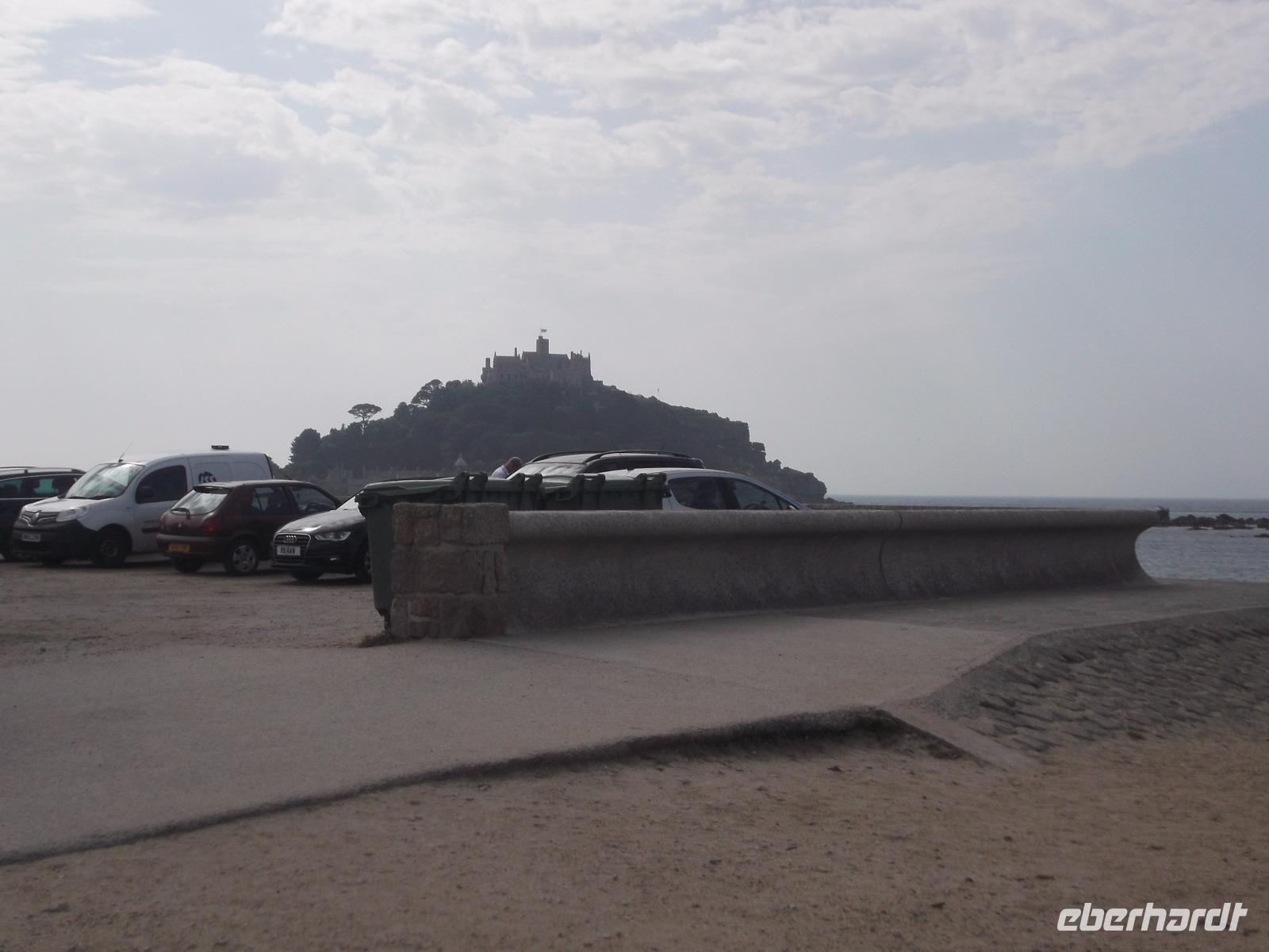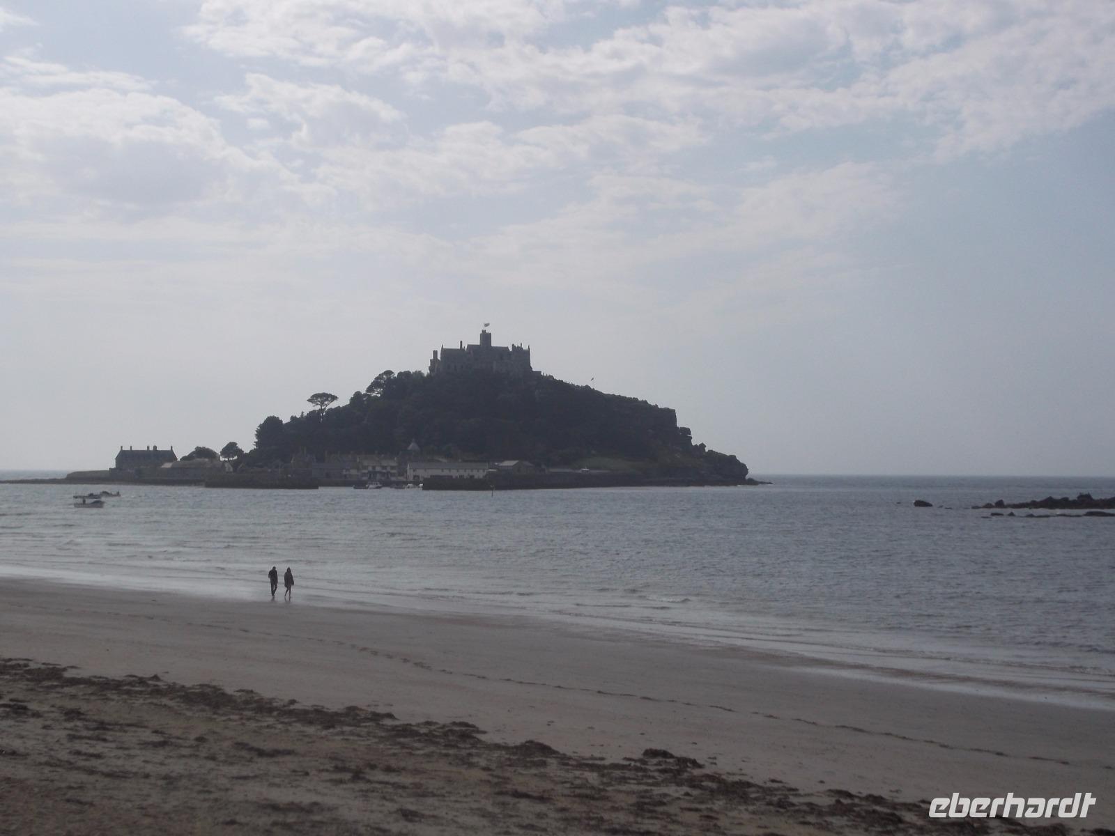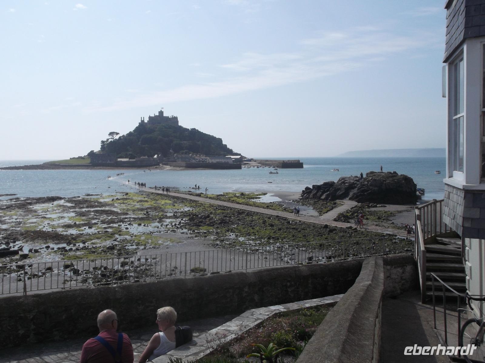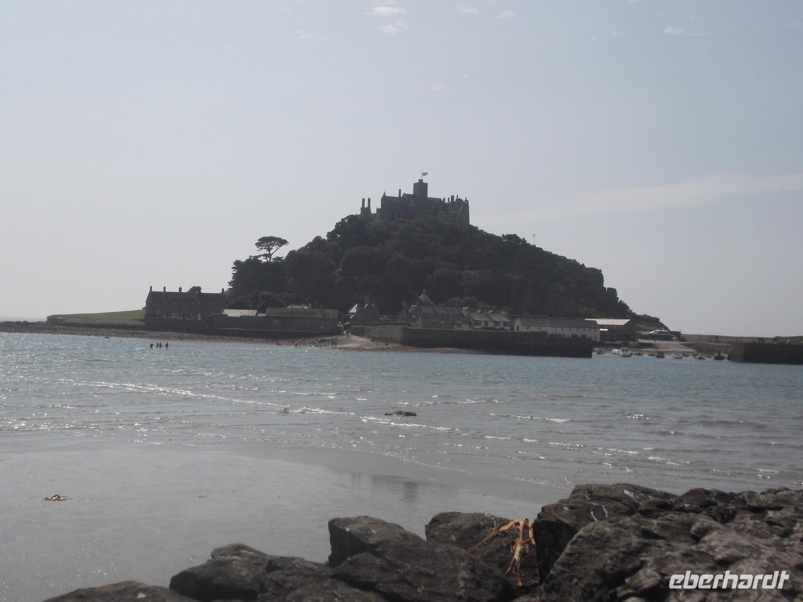 Mit dem Bus erreichten wir dann bald den Parkplatz direkt am Strand der Bucht von Marazion. Direkt gegenüber lag unser nächstes Ziel, die Gezeiteninsel St. Michael Mount. Genau wie ihr französisches Gegenstück, die Insel Mont St. Michel, trägt sie ein ehemaliges Kloster bzw. eine Burg und ist nur bei Ebbe zu Fuß erreichbar. Hier am englischen St.-Michaels-Berg verkehren aber bei Flut Boote, die das Erreichen des „heiligen Berges" ermöglichen. Täglich verschiebt sich der Ebbe-Flut-Rhythmus um etwa eine Dreiviertelstunde und man muss sich vorher erkundigen, wann man trockenen Fußes über den gepflasterten Dammweg von Marazion zum St. Michael's Mount gelangen kann. Wir wandten uns - da die Öffnung des Dammweges noch eineinhalb Stunden dauern würde - zur Bootsanlegestelle. Wir würden - so der Plan - mit dem Boot zur Insel fahren und später zu Fuß über den dann trockengefallenen Dammweg nach Marazion zurückkehren. So erreichten wir den St. Michael's Mount auf dem „Seeweg", holten uns die Eintrittstickets und klommen über die alte Pilgertreppe den Berg empor. Der Ursprung des Pilgerziels, die Kapelle auf dem Berg wurde im Mittelalter errichtet und später im 12. Jh. zu einem Kloster ausgebaut. Später nutze man die Bauten zum Aufbau einer starken Befestigungsanlage, so dass heute der Burgen-Charakter überwiegt. Bis heute befindet sich der St. Michael's Mount in Privatbesitz, kann aber besichtigt werden, da Lord St. Levan, Nachkomme der Besitzerfamilie St. Aubyn, der auch heute noch hier lebt, den Besitz an den National Trust übergab. Bis heute wird auch noch der kleiner Hafen betrieben, der seit dem Spätmittelalter besteht und heute zum Anlegen der Touristenfähren dient.