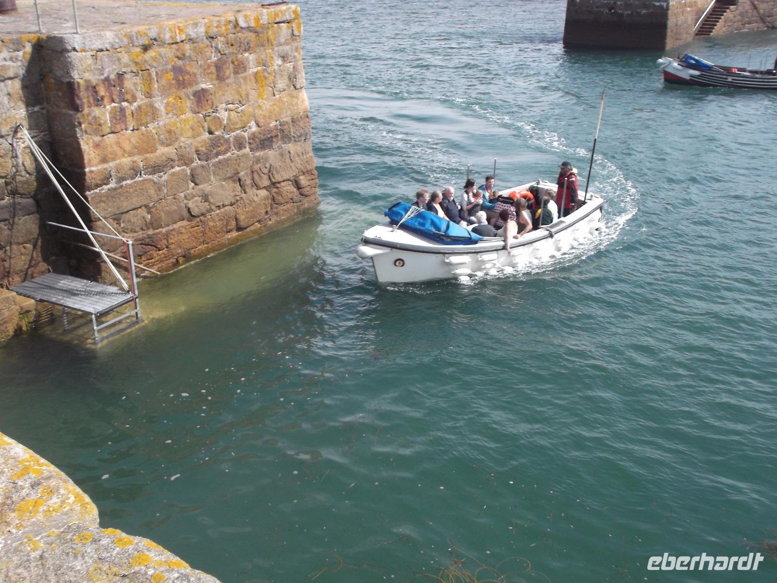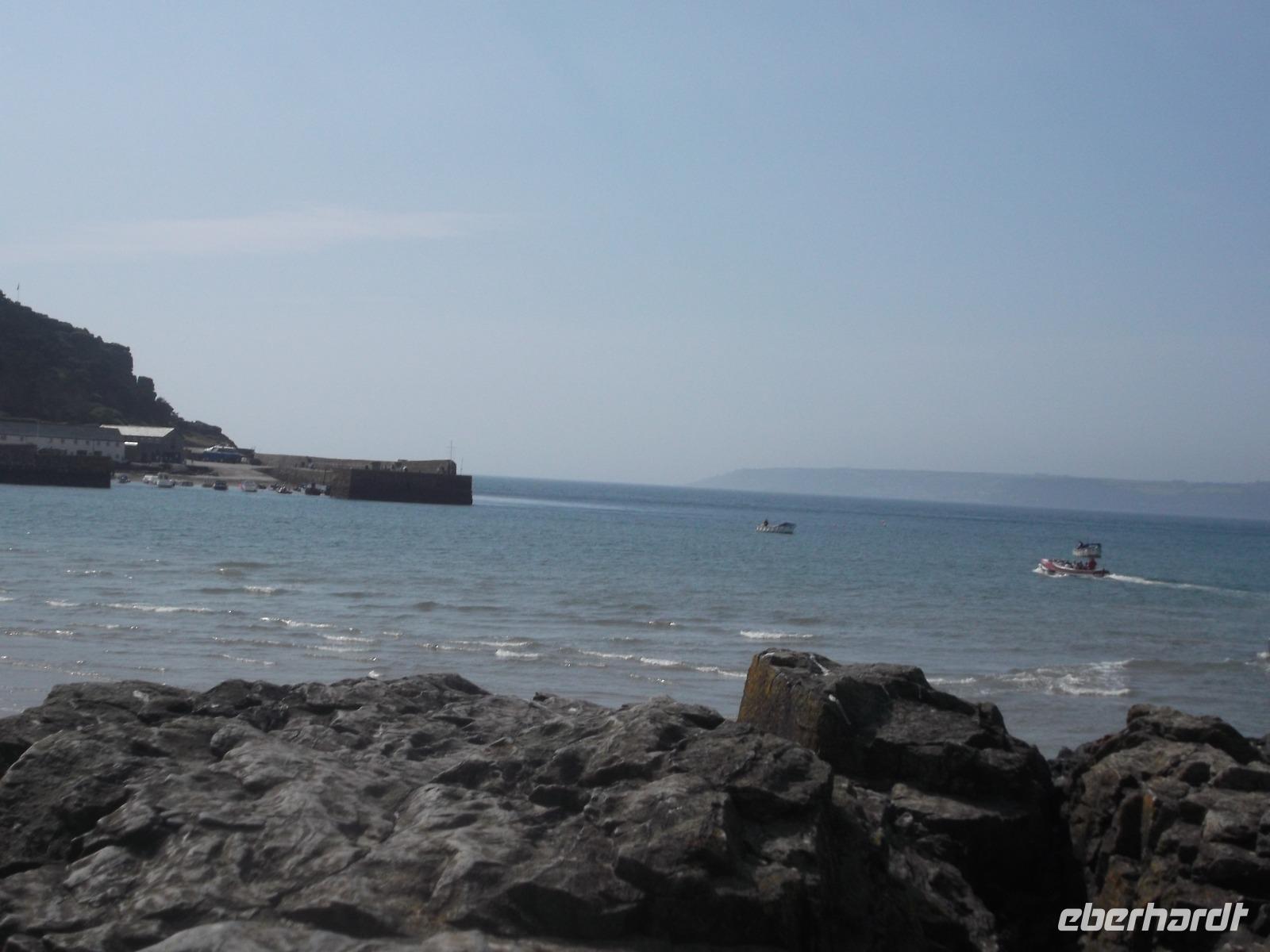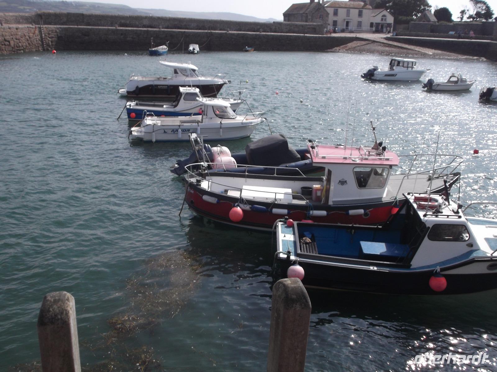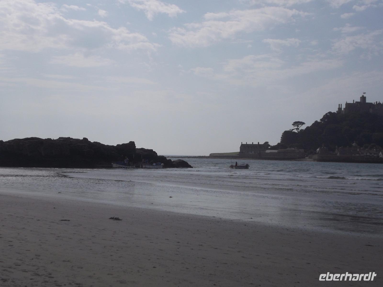 Mit dem Bus erreichten wir dann bald den Parkplatz direkt am Strand der Bucht von Marazion. Direkt gegenüber lag unser nächstes Ziel, die Gezeiteninsel St. Michael Mount. Genau wie ihr französisches Gegenstück, die Insel Mont St. Michel, trägt sie ein ehemaliges Kloster bzw. eine Burg und ist nur bei Ebbe zu Fuß erreichbar. Hier am englischen St.-Michaels-Berg verkehren aber bei Flut Boote, die das Erreichen des „heiligen Berges" ermöglichen. Täglich verschiebt sich der Ebbe-Flut-Rhythmus um etwa eine Dreiviertelstunde und man muss sich vorher erkundigen, wann man trockenen Fußes über den gepflasterten Dammweg von Marazion zum St. Michael's Mount gelangen kann. Wir wandten uns - da die Öffnung des Dammweges noch eineinhalb Stunden dauern würde - zur Bootsanlegestelle. Wir würden - so der Plan - mit dem Boot zur Insel fahren und später zu Fuß über den dann trockengefallenen Dammweg nach Marazion zurückkehren. So erreichten wir den St. Michael's Mount auf dem „Seeweg", holten uns die Eintrittstickets und klommen über die alte Pilgertreppe den Berg empor. Der Ursprung des Pilgerziels, die Kapelle auf dem Berg wurde im Mittelalter errichtet und später im 12. Jh. zu einem Kloster ausgebaut. Später nutze man die Bauten zum Aufbau einer starken Befestigungsanlage, so dass heute der Burgen-Charakter überwiegt. Bis heute befindet sich der St. Michael's Mount in Privatbesitz, kann aber besichtigt werden, da Lord St. Levan, Nachkomme der Besitzerfamilie St. Aubyn, der auch heute noch hier lebt, den Besitz an den National Trust übergab. Bis heute wird auch noch der kleiner Hafen betrieben, der seit dem Spätmittelalter besteht und heute zum Anlegen der Touristenfähren dient.