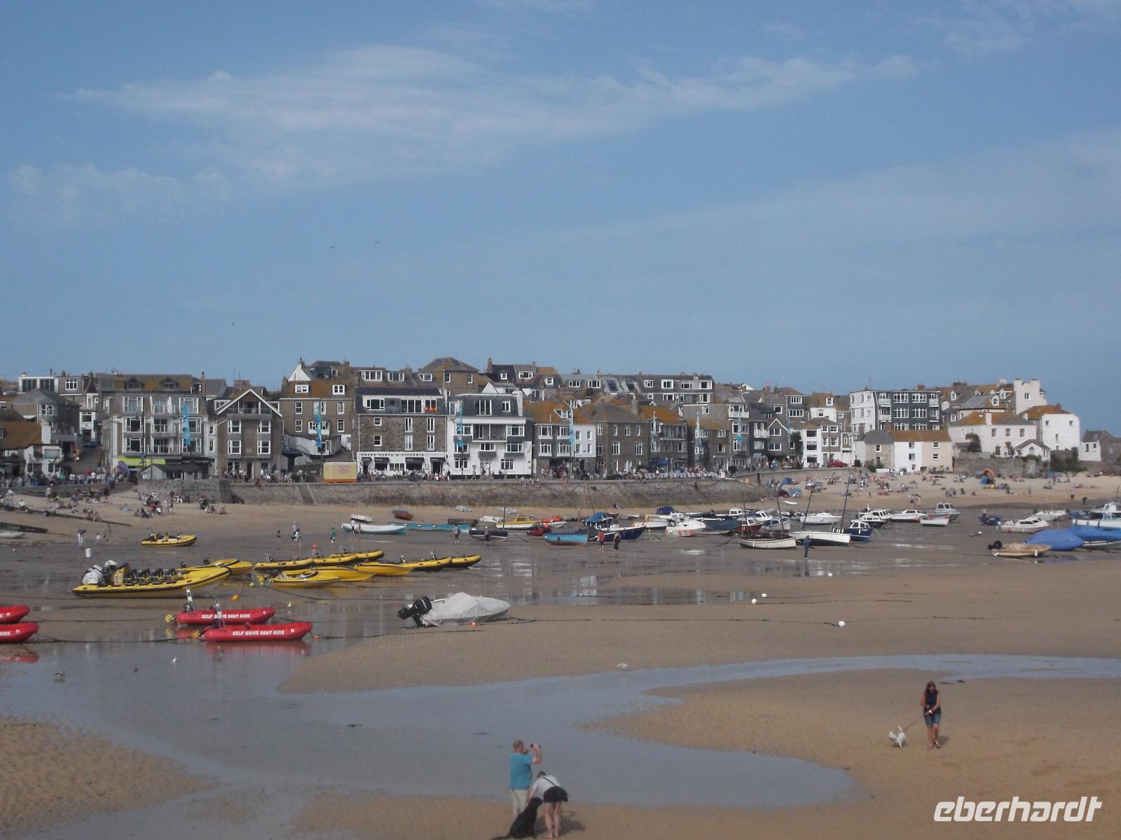 Da wir noch Zeit bis zur Heimfahrt hatten, konnten wir dem malerischen Bade- und Fischerort St. Ives einen Besuch abstatten. Berühmt wegen seiner Sandstrände und weil hier in der Nähe Rosamunde Pilcher geboren wurde, erfreut sich St. Ives großer Beliebtheit bei in- und ausländischen Touristen. Wegen der engen Straßen rings um den Hafen stehen die Touristenbusse auf einem großen Parkplatz vor dem Städtchen und die Besucher werden mit oft und regelmäßig fahrenden Shuttlebussen in die Altstadt befördert. Wir konnten bei einem Bummel hier nicht nur die herrliche Atmosphäre und das schöne Sonnenwetter, sondern auch die zahlreichen Cafés und Eisdielen genießen.