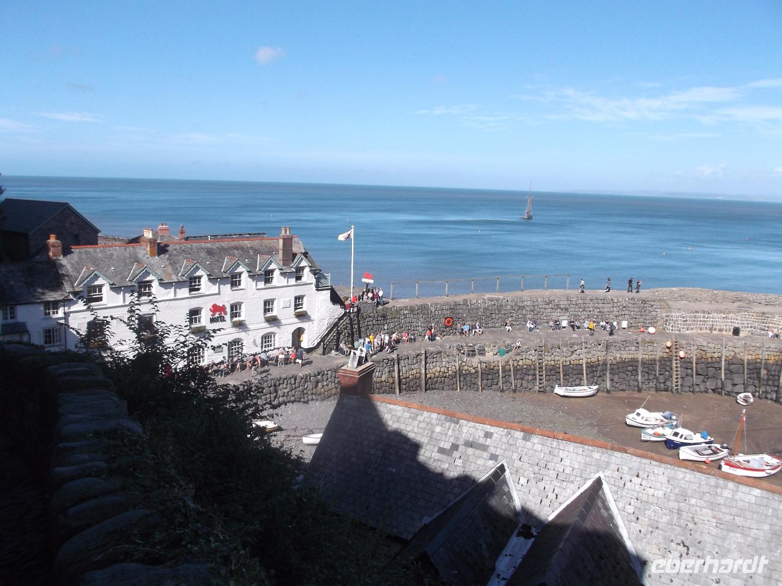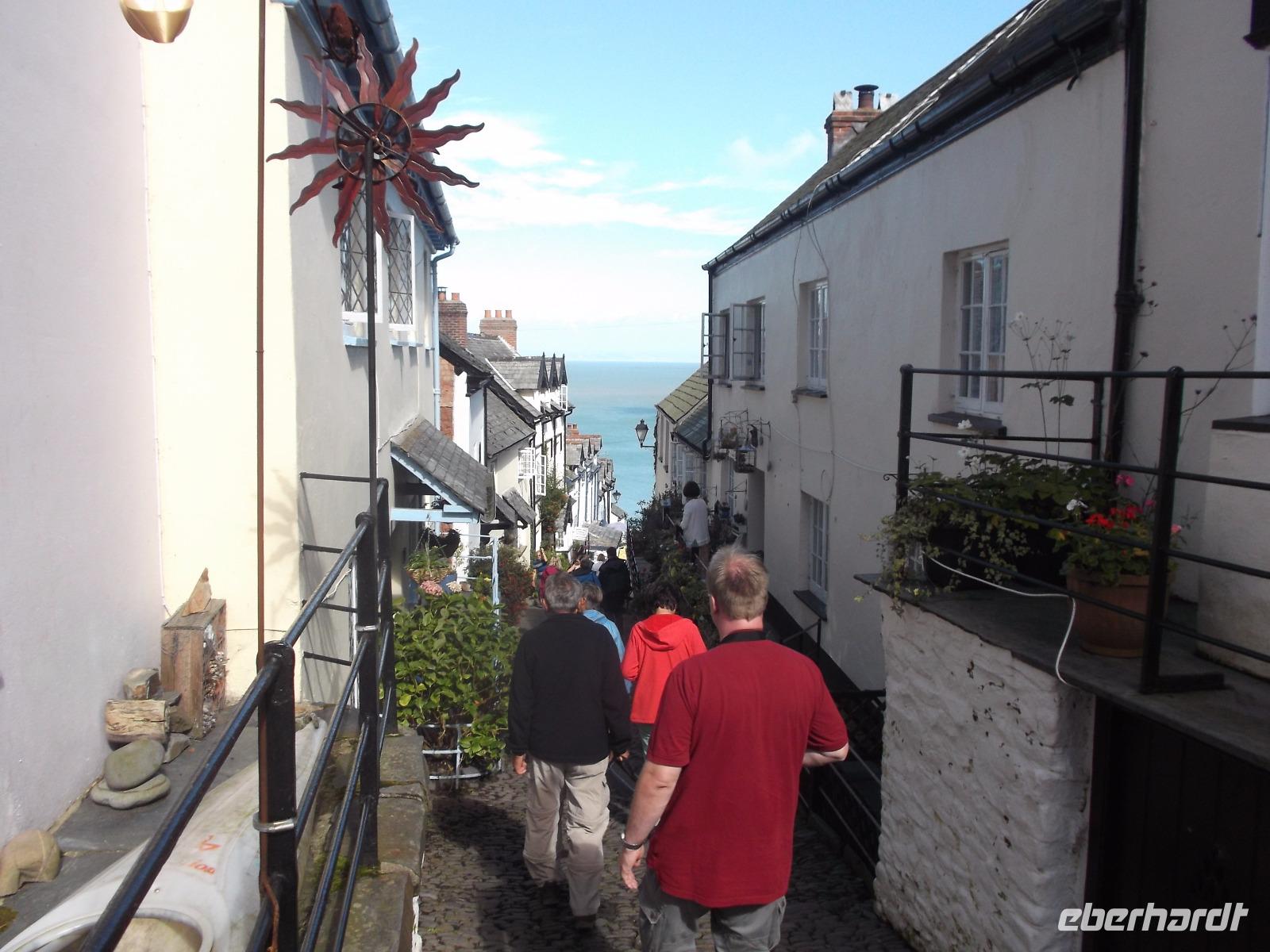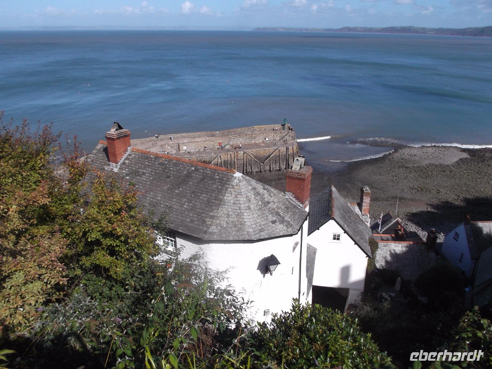 Boscastle war nicht der letzte Höhepunkt an diesem Tag - denn bei strahlendem Sonnenschein erreichten wir Clovelly. Dieser Ort darf schon als etwas ganz Besonderes gelten: abgesehen von seiner versteckten Lage in einer Bucht an der Nordküste der Grafschaft Devon ist das Fischerdorf mit seinen traditionellen weißgetünchten und mit schwarzem Schiefer gedeckten Häuschen ein besonders malerischer Anblick und - das Dorf befindet sich komplett in Privatbesitz. Sein unglaubliches Flair mit der abschüssigen, kopfsteingepflasterten Dorfstraße und seine tolle Lage machen Clovelly - auch dieser Ort einstmals durchaus als Piratennest verschrieen - Zu einem Touristenmagneten. Den Ort muss man zu Fuß besichtigen, denn Autos nicht erlaubt, übrigens könnte man auch aufgrund des Gefälles und der Enge der Sträßchen und Gässchen hier gar nicht fahren. Kurios ist, dass bis heute Lieferungen etc. wie vor langer Zeit immer noch mit einer Art Gleitschlitten abgewickelt werden, da nur ein schmaler, steiler, 800 Meter langer Weg mit sehr glattem Kopfsteinpflaster nach unten zum Hafen führt. Dessen zangenförmige Kaimauer stammt noch aus dem 14.Jh. und nimmt immer noch Teile der Flotte aus klassischen Fischerboote auf.