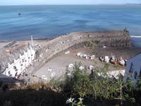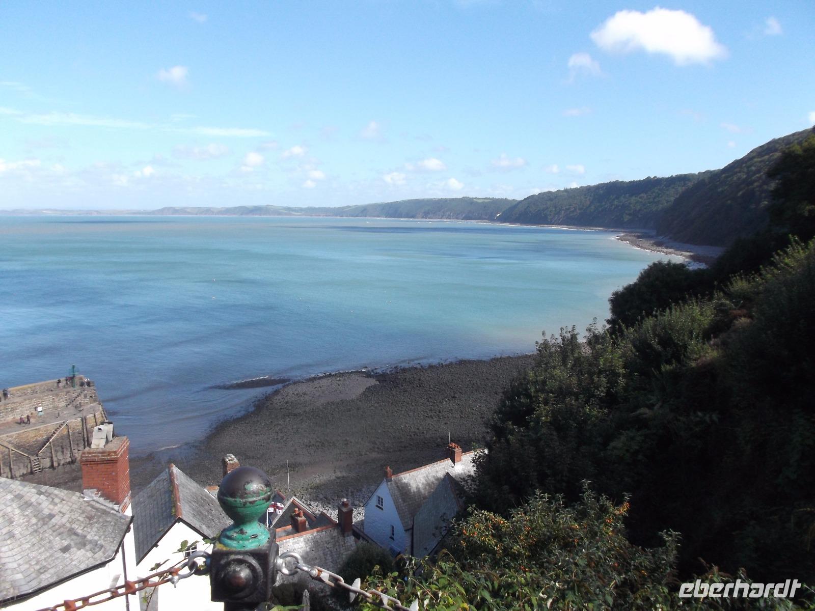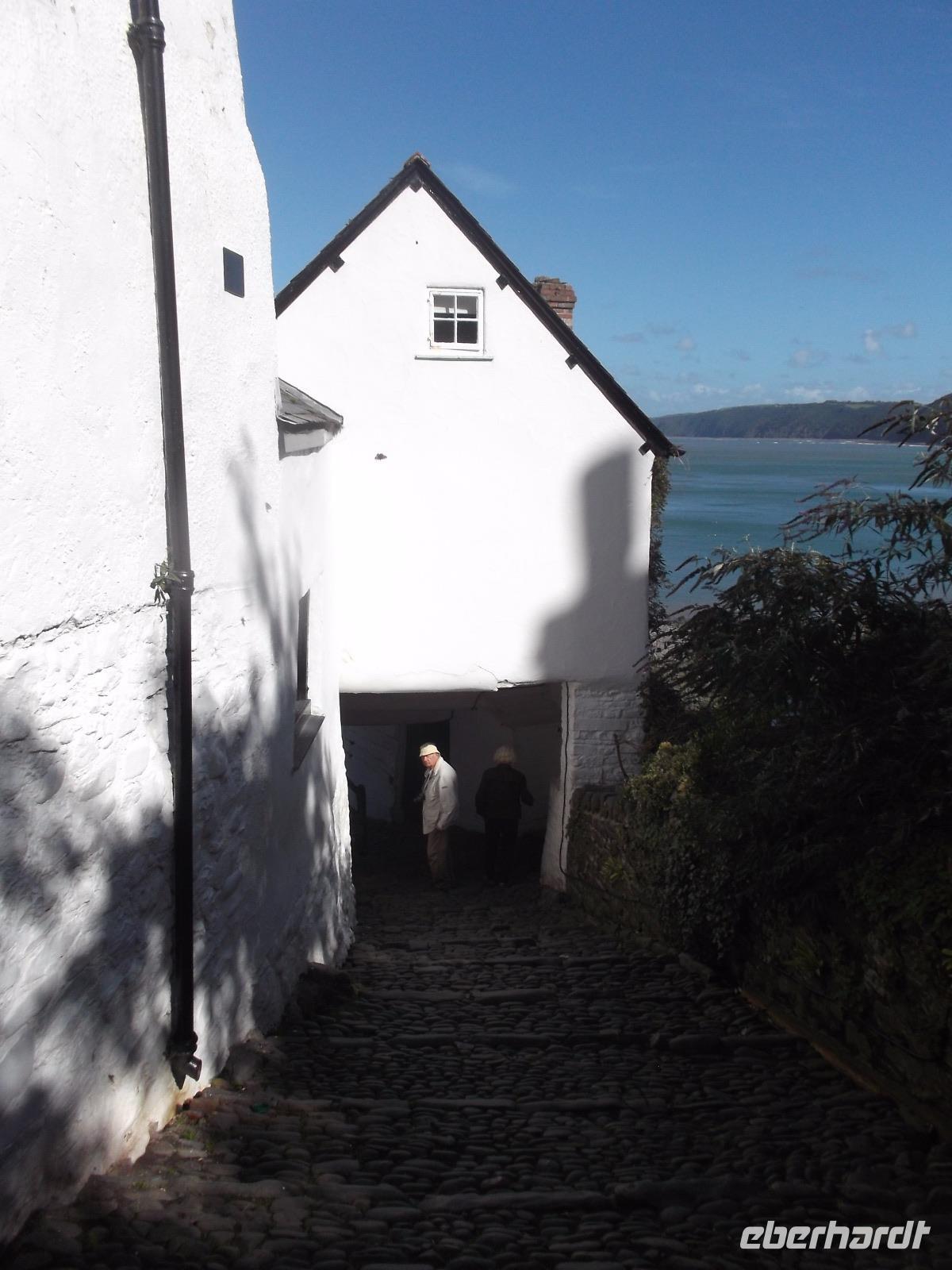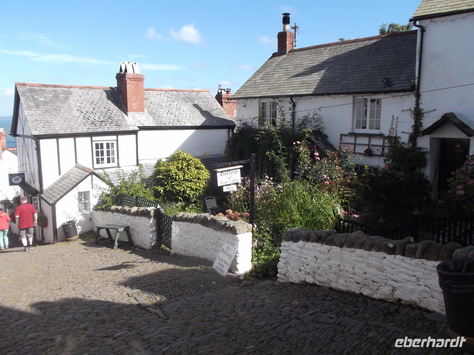 Boscastle war nicht der letzte Höhepunkt an diesem Tag - denn bei strahlendem Sonnenschein erreichten wir Clovelly. Dieser Ort darf schon als etwas ganz Besonderes gelten: abgesehen von seiner versteckten Lage in einer Bucht an der Nordküste der Grafschaft Devon ist das Fischerdorf mit seinen traditionellen weißgetünchten und mit schwarzem Schiefer gedeckten Häuschen ein besonders malerischer Anblick und - das Dorf befindet sich komplett in Privatbesitz. Sein unglaubliches Flair mit der abschüssigen, kopfsteingepflasterten Dorfstraße und seine tolle Lage machen Clovelly - auch dieser Ort einstmals durchaus als Piratennest verschrieen - Zu einem Touristenmagneten. Den Ort muss man zu Fuß besichtigen, denn Autos nicht erlaubt, übrigens könnte man auch aufgrund des Gefälles und der Enge der Sträßchen und Gässchen hier gar nicht fahren. Kurios ist, dass bis heute Lieferungen etc. wie vor langer Zeit immer noch mit einer Art Gleitschlitten abgewickelt werden, da nur ein schmaler, steiler, 800 Meter langer Weg mit sehr glattem Kopfsteinpflaster nach unten zum Hafen führt. Dessen zangenförmige Kaimauer stammt noch aus dem 14.Jh. und nimmt immer noch Teile der Flotte aus klassischen Fischerboote auf.