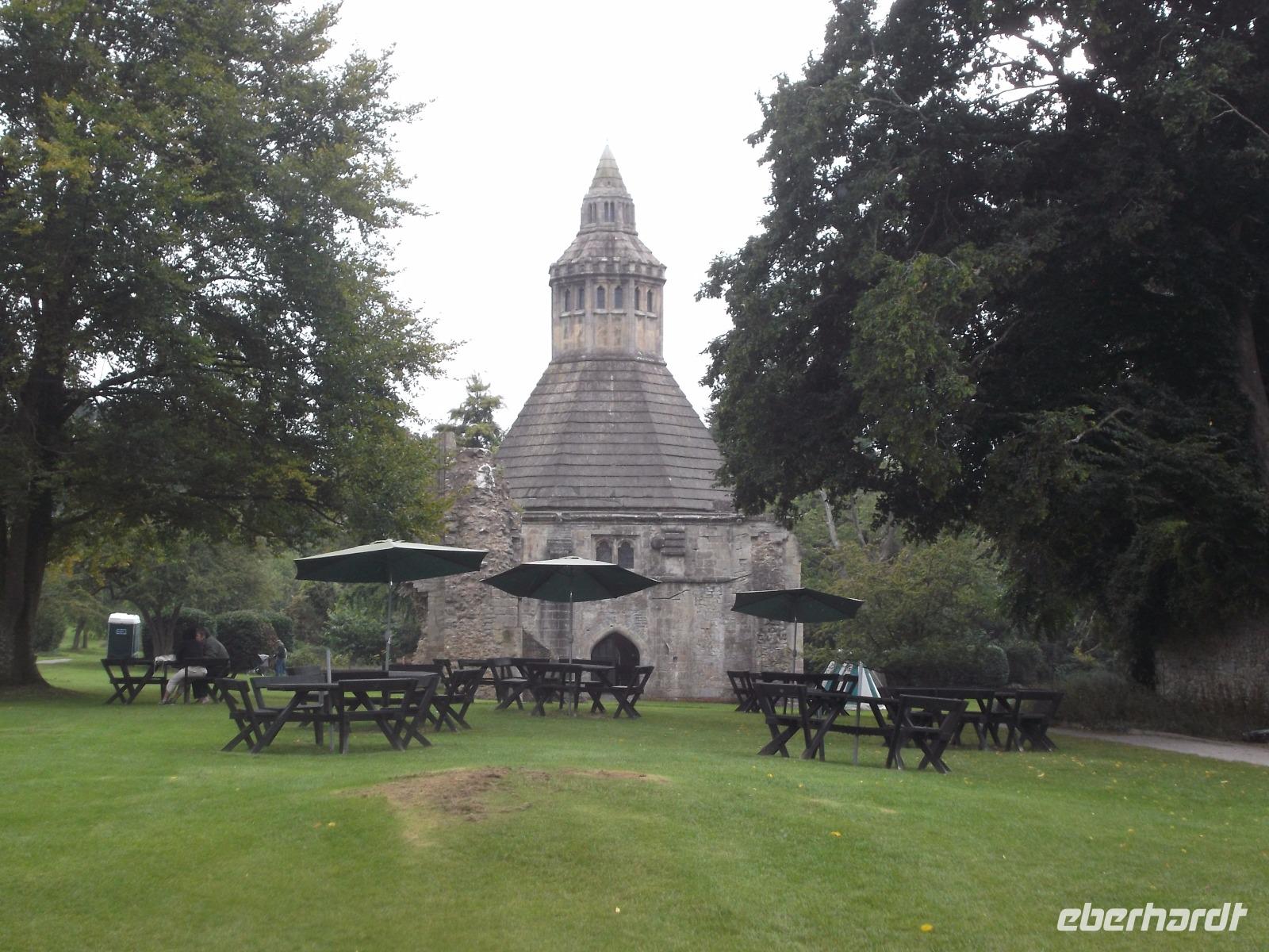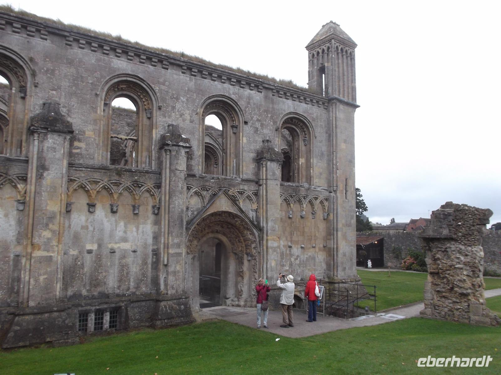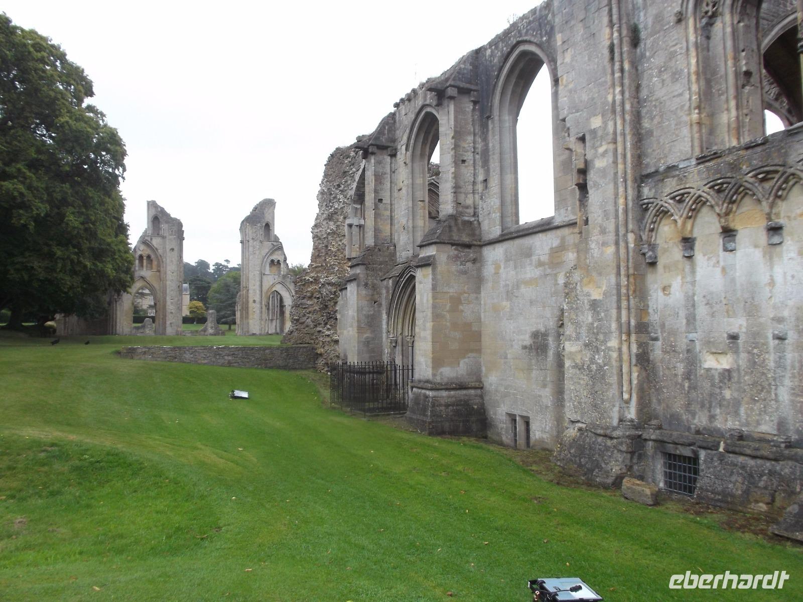 Unser - leider verregneter - Besuch begann mit dem Aufsuchen des Heiligen Dornbuschs. Joseph habe seinen Wanderstock hier in den Boden gerammt, der zum Heiligen Dornbusch von Glastonbury austrieb, heißt es und dieser Weißdorn blüht zweimal im Jahr, einmal im Frühjahr, das zweite Mal zur Weihnachtszeit. Auch die Königin erhält als Schmuck für ihren Weihnachtstisch jedes Jahr einen Zweig dieses Busches. Wir haben uns den Weißdorn angesehen und sind danach zu der Stelle gegangen, an der 1191 Mönche der Abtei von Glastonbury, die Grabstätte von Artus und Guinevere entdeckt hatten - sie seien in rund zwei Metern Tiefe auf eine steinerne Grabplatte und ein bleiernes Kreuz gestoßen. Alle Legenden und Heilkräfte konnten jedoch nicht die Zerstörung der gewaltigen Abtei, die immer noch durch ihre Ausmaße, heute freilich nur durch die Ruinen angedeutet, imponiert, während der englischen Reformation verhindern.