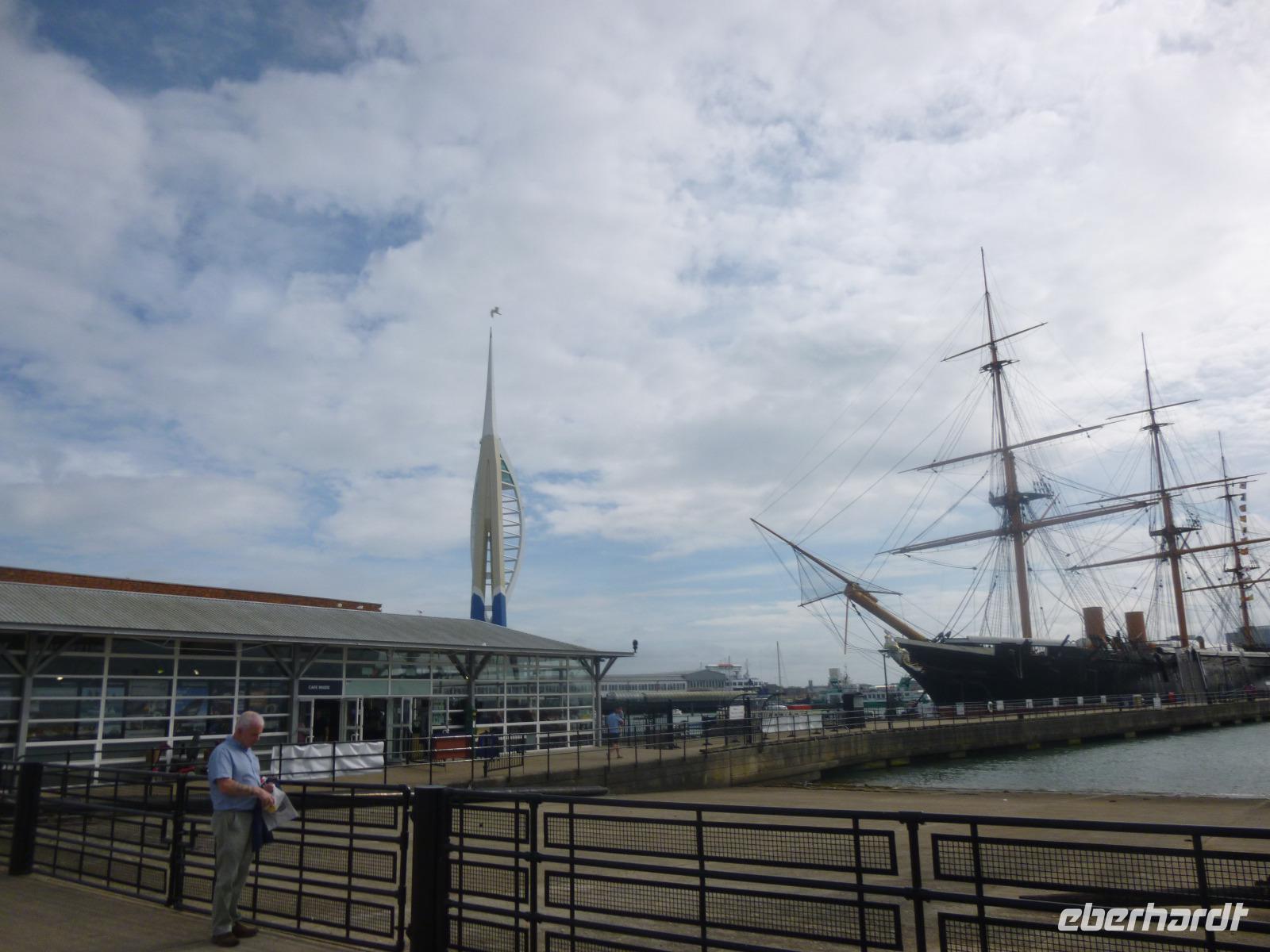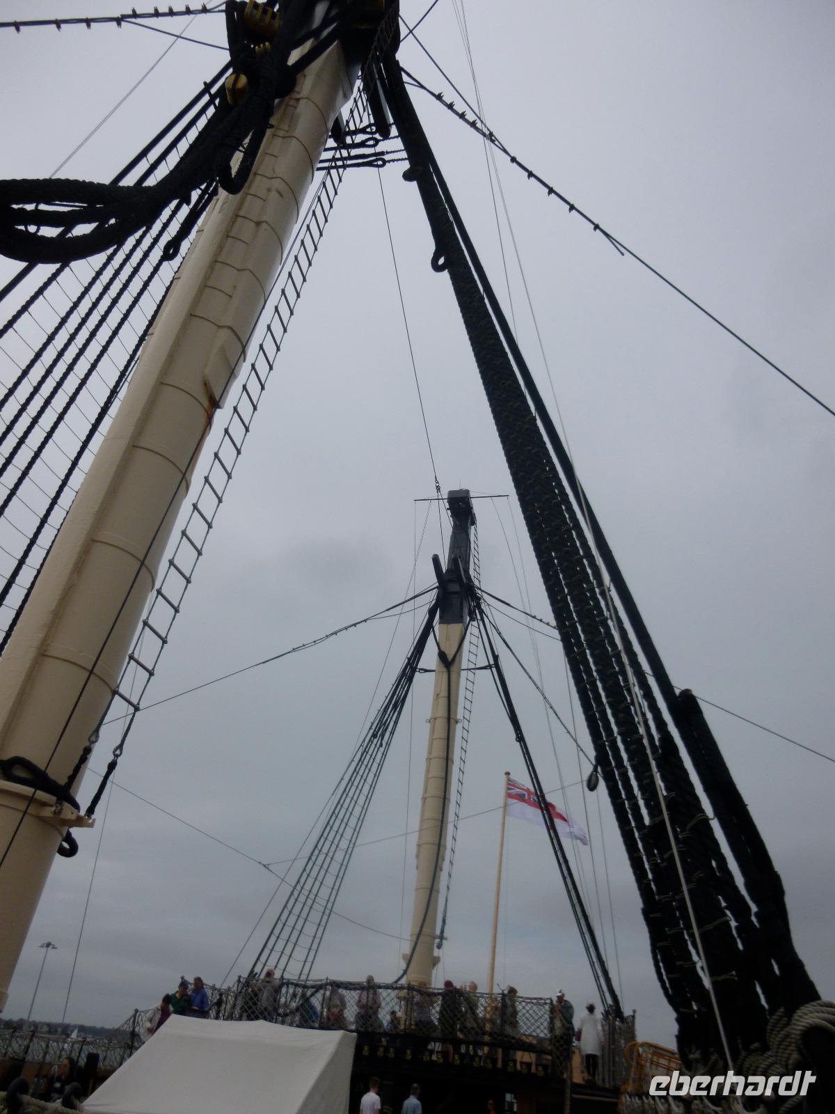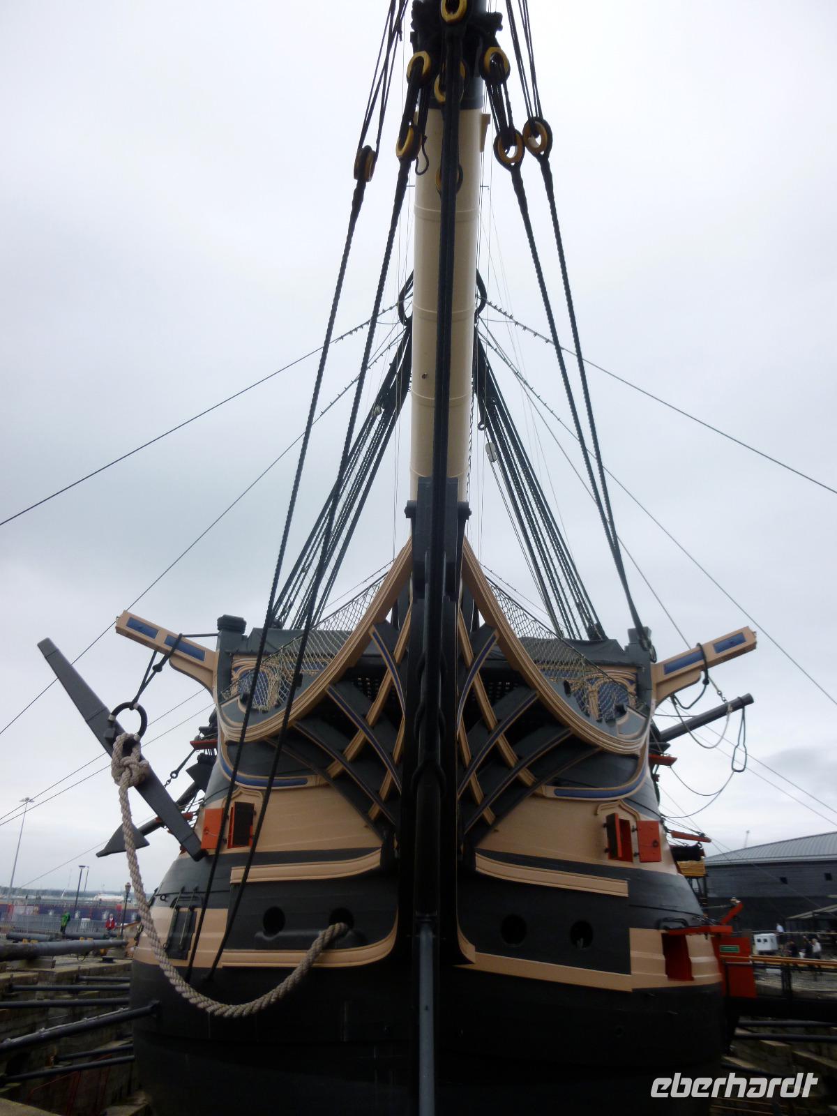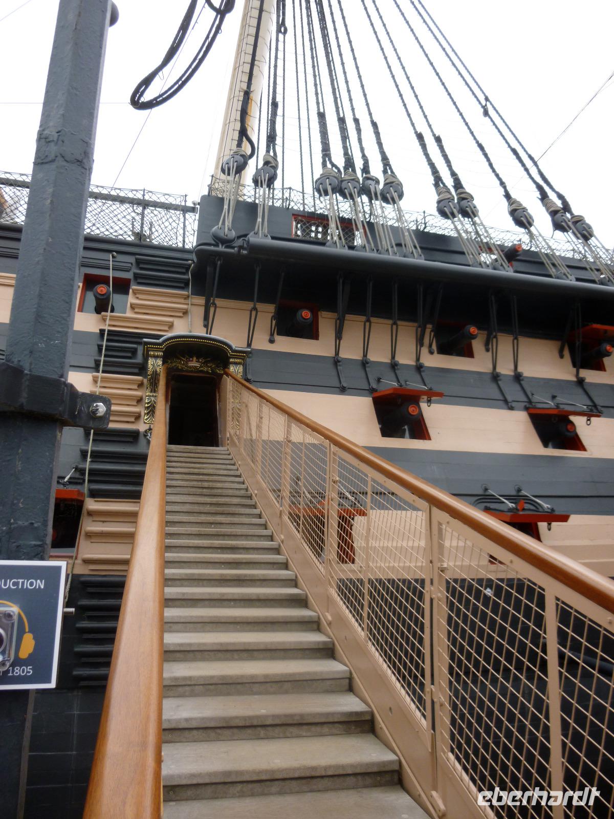 Die HMS Victory ( 18. Jh.) ist neben der Mary Rose (16. Jh.) und der HMS Warrior (19. Jh.) eines der Schiffmuseen und wohl das berühmteste Kriegsschiff, eng verbunden mit dem Trafalgarsieg von Lord Nelsons Truppen. Das Schiff ist voll einsatzfähig und zwischen Steuerrad und Achterdeck fanden wir die markierte Stelle, wo Nelson tödlich verwundet wurde.