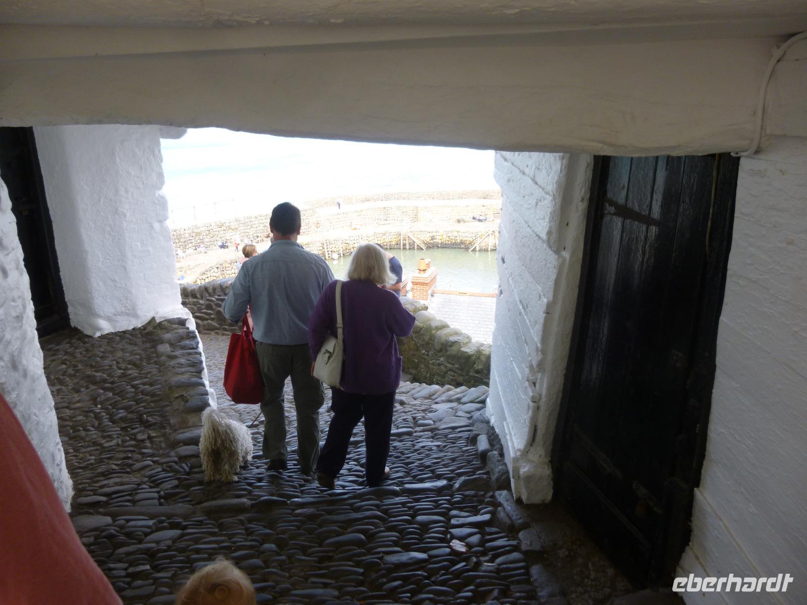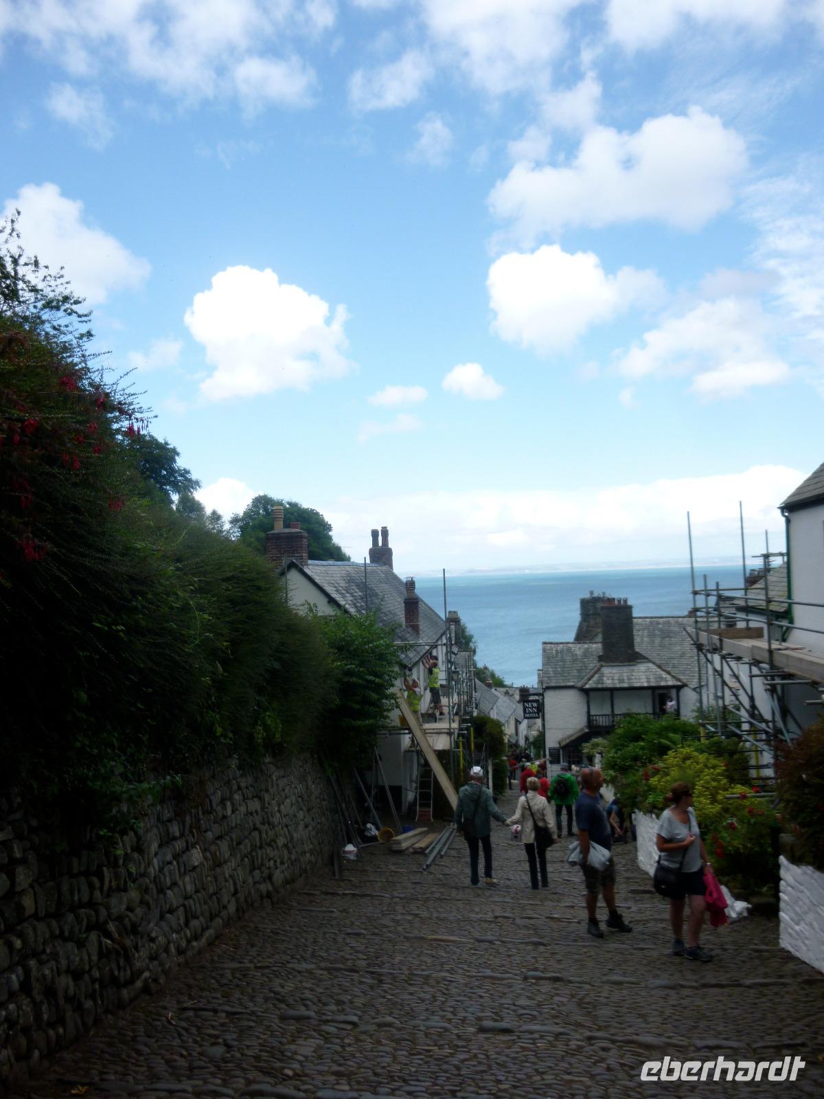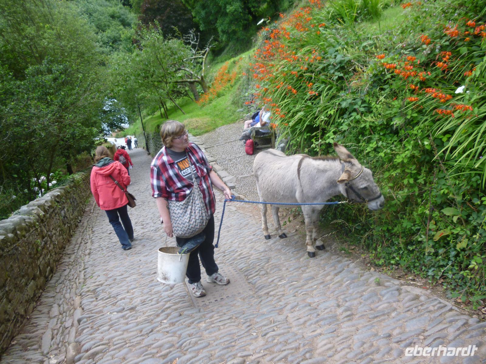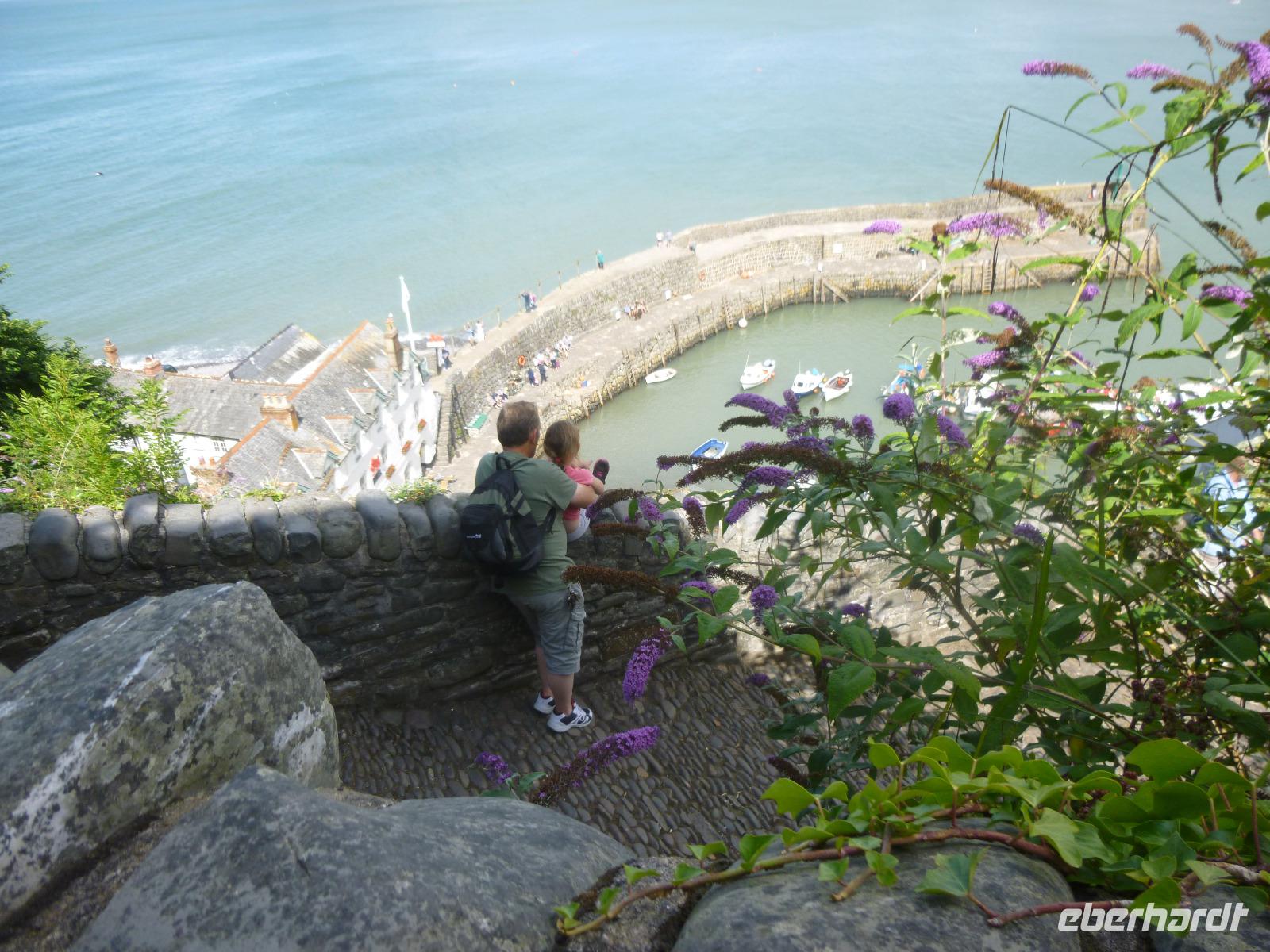 Das Museumsdorf Clovelly liegt an einem Abhang, deshalb werden Lasten von Eseln und Holzschlitten transportiert. Wir spazierten auf dem Kopfsteinpflaster an den dicht gedrängten Häuschen zum Miniaturhafen hinunter und hörten, dass sich das ganze, unter Denkmalschutz stehende Dorf seit über 200 Jahren in Privatbesitz der Familie Rous befindet.